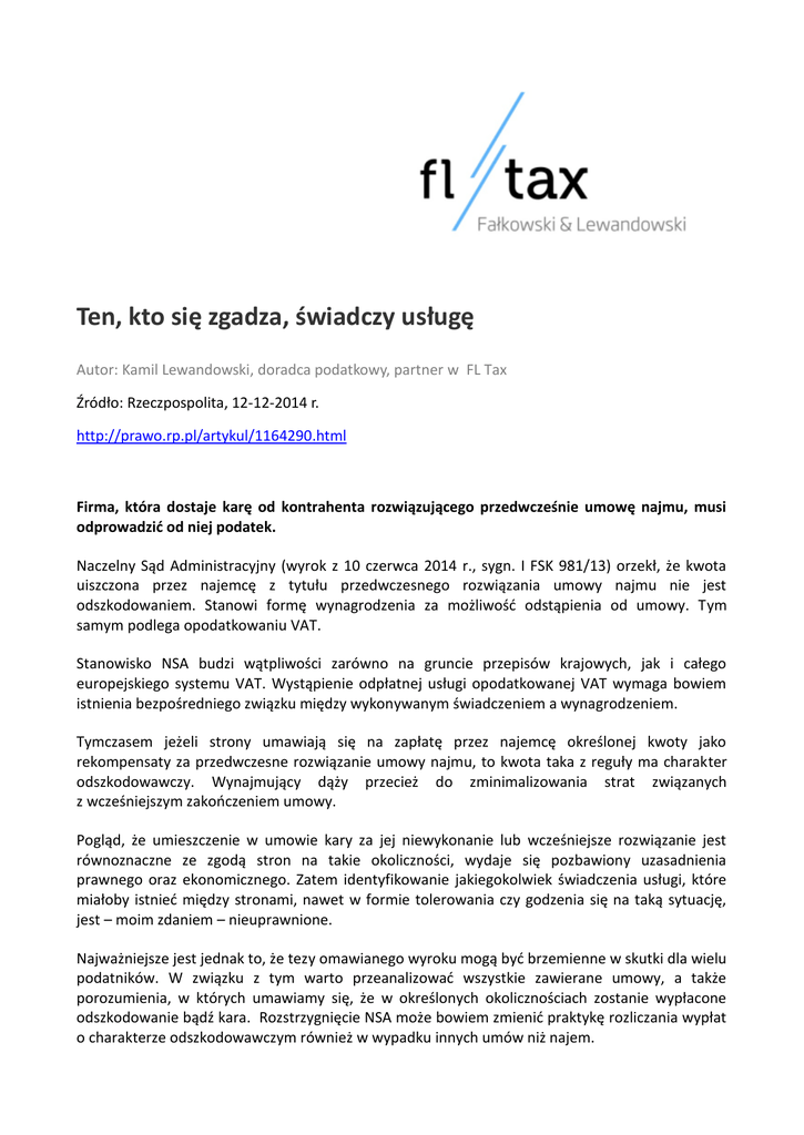 Ten, kto się zgadza, świadczy usługę Autor: Kamil Lewandowski, doradca podatkowy, partner w FL Tax Źródło: Rzeczpospolita, 12-12-2014 r. http://prawo.rp.pl/artykul/1164290.html Firma, która dostaje karę od kontrahenta rozwiązującego przedwcześnie umowę najmu, musi odprowadzić od niej podatek. Naczelny Sąd Administracyjny (wyrok z 10 czerwca 2014 r., sygn. I FSK 981/13) orzekł, że kwota uiszczona przez najemcę z tytułu przedwczesnego rozwiązania umowy najmu nie jest odszkodowaniem. Stanowi formę wynagrodzenia za możliwość odstąpienia od umowy. Tym samym podlega opodatkowaniu VAT. Stanowisko NSA budzi wątpliwości zarówno na gruncie przepisów krajowych, jak i całego europejskiego systemu VAT. Wystąpienie odpłatnej usługi opodatkowanej VAT wymaga bowiem istnienia bezpośredniego związku między wykonywanym świadczeniem a wynagrodzeniem. Tymczasem jeżeli strony umawiają się na zapłatę przez najemcę określonej kwoty jako rekompensaty za przedwczesne rozwiązanie umowy najmu, to kwota taka z reguły ma charakter odszkodowawczy. Wynajmujący dąży przecież do zminimalizowania strat związanych z wcześniejszym zakończeniem umowy. Pogląd, że umieszczenie w umowie kary za jej niewykonanie lub wcześniejsze rozwiązanie jest równoznaczne ze zgodą stron na takie okoliczności, wydaje się pozbawiony uzasadnienia prawnego oraz ekonomicznego. Zatem identyfikowanie jakiegokolwiek świadczenia usługi, które miałoby istnieć między stronami, nawet w formie tolerowania czy godzenia się na taką sytuację, jest – moim zdaniem – nieuprawnione. Najważniejsze jest jednak to, że tezy omawianego wyroku mogą być brzemienne w skutki dla wielu podatników. W związku z tym warto przeanalizować wszystkie zawierane umowy, a także porozumienia, w których umawiamy się, że w określonych okolicznościach zostanie wypłacone odszkodowanie bądź kara. Rozstrzygnięcie NSA może bowiem zmienić praktykę rozliczania wypłat o charakterze odszkodowawczym również w wypadku innych umów niż najem.
