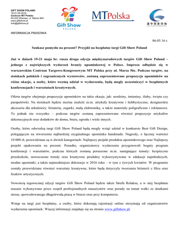 GIFT SHOW POLAND 19-21.05.2016 Centrum MT Polska 04-242 Warsaw, ul. Marsa 56C www.giftshow.pl [email protected] INFORMACJA PRASOWA 06.05.16 r. Szukasz pomysłu na prezent? Przyjdź na bezpłatne targi Gift Show Poland Już w dniach 19-21 maja br. rusza druga edycja międzynarodowych targów Gift Show Poland – jednego z największych wydarzeń branży upominkowej w Polsce. Impreza odbędzie się w warszawskim Centrum Targowo-Kongresowym MT Polska przy ul. Marsa 56c. Podczas targów, na stoiskach polskich i zagranicznych wystawców, zostaną zaprezentowane propozycje upominków na różne okazje, a osoby, które wezmą udział w wydarzeniu, będą mogły uczestniczyć w bezpłatnych konferencjach i warsztatach kreatywnych. Oferta targów obejmuje propozycje upominków na takie okazje, jak: urodziny, imieniny, śluby, święta czy parapetówki. Na stoiskach będzie można znaleźć m.in. artykuły kreatywne i hobbystyczne, designerskie akcesoria dla młodzieży: biżuterię, zegarki, małą elektronikę, a także materiały poligraficzne i reklamowe. To jednak nie wszystko – podczas targów zostaną zaprezentowane również propozycje artykułów dekoracyjnych oraz dodatków do domu, biura, ogrodu i wiele innych. Osoby, które odwiedzą targi Gift Show Poland będą mogły wziąć udział w konkursie Best Gift Design, polegającym na stworzeniu najbardziej oryginalnego upominku handmade. Nagrody, o łącznej wartości 10 000 zł, przewidziane są w dwóch kategoriach: Najlepszy projekt produktu upominkowego oraz Najlepszy projekt opakowania na prezent. Ponadto, organizatorzy wydarzenia przygotowali bogaty program konferencji i warsztatów, podczas których zostaną poruszone m.in. następujące tematy: bezpieczne przedszkole, nowoczesne trendy oraz kreatywne produkty wykorzystywane w edukacji najmłodszych, modne upominki, a także najmodniejsze dekoracje w 2016 roku – w tym z żywych kwiatów. W programie zostały przewidziane również warsztaty kreatywne, które będą dotyczyły tworzenia biżuterii z filcu oraz lizaków artystycznych. Nowością tegorocznej edycji targów Gift Show Poland będzie także Strefa Relaksu, a w niej bezpłatne masaże wykonywane przez zespół profesjonalnych masażystów oraz porady na temat walki ze skutkami stresu, spowodowanego długotrwałą pracą w biurze oraz przy komputerze. Wstęp na targi jest bezpłatny, a osoby, które dokonają rejestracji online otrzymają od organizatorów wydarzenia upominek. Więcej informacji znajduje się na stronie www.giftshow.pl. GIFT SHOW POLAND 19-21.05.2016 Centrum MT Polska 04-242 Warsaw, ul. Marsa 56C www.giftshow.pl [email protected] INFORMACJA PRASOWA Kontakt dla mediów: Marta Myszkowska tel.: +48 720 908 124 e-mail: [email protected]