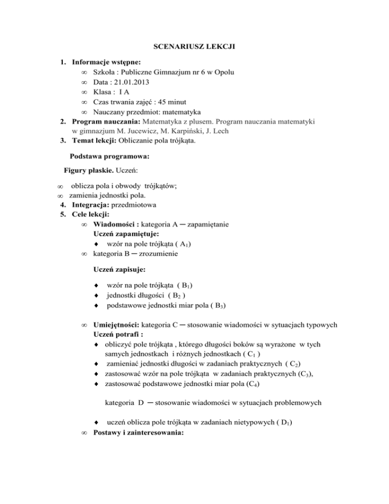 SCENARIUSZ LEKCJI 1. Informacje wstępne: • Szkoła : Publiczne Gimnazjum nr 6 w Opolu • Data : 21.01.2013 • Klasa : I A • Czas trwania zajęć : 45 minut • Nauczany przedmiot: matematyka 2. Program nauczania: Matematyka z plusem. Program nauczania matematyki w gimnazjum M. Jucewicz, M. Karpiński, J. Lech 3. Temat lekcji: Obliczanie pola trójkąta. Podstawa programowa: Figury płaskie. Uczeń: • • 4. 5. oblicza pola i obwody trójkątów; zamienia jednostki pola. Integracja: przedmiotowa Cele lekcji: • Wiadomości : kategoria A ─ zapamiętanie Uczeń zapamiętuje: ♦ wzór na pole trójkąta ( A1) • kategoria B ─ zrozumienie Uczeń zapisuje: ♦ wzór na pole trójkąta ( B1) ♦ jednostki długości ( B2 ) ♦ podstawowe jednostki miar pola ( B3) • Umiejętności: kategoria C ─ stosowanie wiadomości w sytuacjach typowych Uczeń potrafi : ♦ obliczyć pole trójkąta , którego długości boków są wyrażone w tych samych jednostkach i różnych jednostkach ( C1 ) ♦ zamieniać jednostki długości w zadaniach praktycznych ( C2) ♦ zastosować wzór na pole trójkąta w zadaniach praktycznych (C3), ♦ zastosować podstawowe jednostki miar pola (C4) kategoria D ─ stosowanie wiadomości w sytuacjach problemowych • ♦ uczeń oblicza pole trójkąta w zadaniach nietypowych ( D1) Postawy i zainteresowania: ♦ Wyrabianie systematyczności w rozwiązywaniu zadań dotyczących pola trójkątów ♦ Kształtowanie wytrwałości w zdobywaniu wiedzy i umiejętności matematycznych ♦ Rozwijanie umiejętności pracy w zespole klasowym ♦ Motywowanie uczniów do kreatywności i samodzielności ♦ Kształtowanie postawy dialogu i kultury dyskusji ( komunikacji ) ♦ Dbanie o estetykę : jasne i przejrzyste rozwiązanie zadań 6. Strategie nauczania : • strategia asocjacyjna (kojarzenie) – uczenie się poprzez przyswajanie gotowej wiedzy ( A ) • strategia podająca ( P ) • strategia oddziaływania na rzeczywistość ( S ) 7. Metody nauczania: • Pogadanka ( M1 ) • Burza mózgów( M2 ) • Metoda ćwiczeń ( M3 ) 8. Zasady nauczania: • Zasada przystępności ( Z1) • Zasada świadomego i aktywnego uczestnictwa ( Z2) • Zasada łączenia teorii z praktyką ( Z3) 9. Formy pracy uczniów: • Praca zespołowa ( F1) • Praca w grupach : grupy dwuosobowe : uczniowie siedzący w jednej ławce ( F2) 10. Środki dydaktyczne: • podręcznik 11. Wykaz piśmiennictwa : • Dla nauczyciela: ♦ Matematyka 1, podręcznik : gimnazjum pod red Małgorzaty Dobrowolskiej, GWO, 2009 ♦ Zasady nauczania matematyki, F.Urbańczyk • Dla ucznia : ♦ Matematyka 1, podręcznik : gimnazjum pod red Małgorzaty Dobrowolskiej, GWO, 2009 12. Organizacja zajęć lekcyjnych ( struktura lekcji ) Etapy / fazy lekcji Zagadnienia,zadania, problemy lekcji Faza wstępna Sposoby Realizacji Zagadnień Zadań problemów Zadanie 17 str.128 Zadanie 18 str.128 Zadanie 19 str. 128 Zadanie 20 str.128 Zadanie 24 str.129 Faza podsumowująca Uwagi o realizacji Podanie tematu lekcji i zapoznanie uczniów z celami lekcji Przypomnienie podstawowych jednostek pola powierzchni., wzorów na pole trójkąta Faza realizacyjna Spełnienie Założonych Celów lekcji Podsumowanie zajęć A1, B1─ B3, C4 M1, M2, A, F1, Z2 Uczniowie rozwiązują zadanie dotyczące obliczania pola trójkąta. Poszczególni uczniowie rozwiązują zadania. Na konkretnych, prostych przykładach uczniowie obliczali pole powierzchni trójkątów posługując się jednostkami długości i powierzchni Zadanie w załączeniu (zał.1) C1,─C4, D1, B1─B2, A1 M3,S, P, Z2,Z3, F2 A1, B1─B3, C1,─C4, D1, M3,S, P, Z2,Z3, F2 Zadania w załączeniu (zał.1) dyskusja nad poprawnością rozwiązań Pytania sprawdzające stopień opanowania wiadomości o polu trójkąta. Ocena pracy uczniów Zadanie zadania domowego : zadanie 21,22 str.128 Zadania w załączeniu (zał.2) Opracowała : Agnieszka Tomalak PG 6 Opole Załącznik 1 Zadanie 17 str.128 Oblicz pola zacieniowanych trójkątów Zadanie 18 str.128 Czy trójkąt, w którym każdy bok ma długość większą od 1m, może mieć pole równe 1 cm2 ? Zadanie 19 str.128 Oblicz długości wytłuszczonych odcinków . a) b) pole = 40 pole = 63 Zadanie 20 str.128 Oblicz długości odcinków oznaczonych literami. a) Zadanie 24 str.129 Oblicz pole zacieniowanej figury. b) Załącznik 2 ( zadanie domowe) Zadanie 21 str.128 W trójkącie prostokątnym o polu 49 cm2 jedna z przyprostokątnych ma 7 cm. Jaką długość ma druga przyprostokątna? Zadanie 22 str.128 W trójkącie ABC o polu 12 cm2 dane są : AB = 5cm i BC = 6cm . a) Czy kąt przy wierzchołku B jest prosty? b) Czy jedna z wysokości trójkąta ABC może mieć długość 2 cm ? c) Czy jedna z wysokości trójkąta ABC może mieć długość 4,8 cm ? Opracowała : Agnieszka Tomalak PG 6 Opole