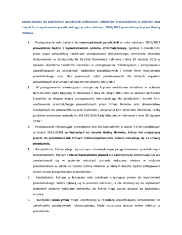 Zasady naboru do publicznych przedszkoli publicznych, oddziałów przedszkolnych w szkołach oraz innych form wychowania przedszkolnego w roku szkolnym 2016/2017 prowadzonych przez Gminę Halinów 1. Postępowanie rekrutacyjne do samorządowych przedszkoli w roku szkolnym 2016/2017 prowadzone będzie z wykorzystaniem systemu informatycznego, zgodnie z określonymi przez organ prowadzący terminami postępowania rekrutacyjnego, terminami składania dokumentów w Zarządzeniu Nr 18.2016 Burmistrza Halinowa z dnia 29 stycznia 2016 w sprawie określenia terminów czynności w postępowaniu rekrutacyjnym i postępowaniu uzupełniającym do przedszkoli, oddziałów przedszkolnych i innych form wychowania przedszkolnego oraz klas pierwszych szkół podstawowych dla których organem prowadzącym jest Gmina Halinów na rok szkolny 2016/2017 2. W postępowaniu rekrutacyjnym stosuje się kryteria dodatkowe określone w uchwale Nr V.46.2015 Rady Miejskiej w Halinowie z dnia 26 lutego 2015 roku w sprawie określenia kryteriów na drugim etapie postępowania rekrutacyjnego do przedszkoli i innych form wychowania przedszkolnego prowadzonych przez Gminę Halinów oraz dokumentów niezbędnych do potwierdzenia tych kryteriów i przyznania tym kryteriom określonej liczby punktów zmienionej uchwałą Nr XVI.142.2016 Rady Miejskiej w Halinowie z dnia 28 stycznia 2016 r. 3. Postępowanie rekrutacyjne prowadzone jest dla kandydatów w wieku 3-6 lat (urodzonych w latach 2013-2010) zamieszkałych na terenie Gminy Halinów, którzy nie uczęszczają jeszcze do przedszkola lub których rodzice/opiekunowie prawni zdecydują się na zmianę przedszkola. 4. Kandydatom, którzy objęci są rocznym obowiązkowym przygotowaniem przedszkolnym (sześciolatkom), których rodzice/opiekunowie prawni nie zadeklarowali kontynuacji lub nie zarejestrowali się w systemie rekrutacji zostanie wskazane miejsce w oddziale przedszkolnym w szkole na terenie Gminy Halinów, w którym dziecko będzie zobligowane odbyć roczne przygotowanie przedszkolne. 5. Kandydatom, którym w bieżącym roku szkolnym przysługuje prawo do wychowania przedszkolnego, którzy zgłoszą się w procesie rekrutacji, a nie dostaną się do wybranych jednostek zostanie wskazane jednostka, do której mogą zostać przyjęci po podpisaniu umowy. 6. Kandydaci spoza gminy mogą uczestniczyć w rekrutacji uzupełniającej, prowadzonej po zakończeniu postępowania rekrutacyjnego, kiedy pozostaną jeszcze wolne miejsca w przedszkolu. 7. Postępowanie rekrutacyjne prowadzone jest dwuetapowo, w oparciu o kryteria o charakterze ustawowym i lokalnym. 8. W każdym przedszkolu obowiązują takie same terminy, dokumenty oraz kryteria wraz z odpowiadającą im wartością punktową. 9. Rodzice mają prawo wybrać 3 przedszkola szeregując je według własnych preferencji. Przed podjęciem decyzji o wyborze przedszkola należy zapoznać się z przedstawioną ofertą. 10. Kolejność rejestracji w systemie nie ma znaczenia. 11. W przypadku kandydatów w systemie większej liczby kandydatów z orzeczeniem o potrzebie kształcenia specjalnego niż przewidują odrębne przepisy o tworzeniu oddziałów integracyjnych lub w przypadku zgłoszenia się kandydatów z niepełnosprawnością, która nie dają możliwości wspólnej edukacji Gmina Halinów zastrzega sobie ogłoszenie konkursu ofert dla przedszkoli niepublicznych lub skierowanie dziecka do placówki w innej gminie zapewniając jednocześnie dowiezienie dziecka do wskazanej placówki. 12. Logowanie do systemu i wypełnianie wniosku będzie możliwe od 7 marca 2016 roku od godz.8.00 do 21 marca 2016 roku do godz.15.00. 13. Przedszkola będą przyjmować wnioski w terminie rekrutacji od 7 marca 2016 roku od godz. 8.00 do 21 marca 2016 roku do godz. 15.00. 14. Instrukcja logowania zostanie zamieszczona na stronie www.halinow.pl 15. Wypełniony elektronicznie i wydrukowany wniosek należy złożyć tylko w przedszkolu, które na wniosku widnieje jako przedszkole pierwszego wyboru. 16. W celu potwierdzenia spełnienia kryteriów, do wniosku należy dołączyć wymagane dokumenty i oświadczenia, które będą weryfikowane w przedszkolu pierwszego wyboru. 17. Podanie danych umożliwiających stwierdzenie spełnienia kryteriów dodatkowych jest dobrowolne. 18. Przewodniczący komisji rekrutacyjnej może: a) żądać od rodziców przedstawienia dokumentów potwierdzających okoliczności zawarte w oświadczeniach (przewodniczący wyznacza termin przedstawienia dokumentów), b) zwrócić się do Burmistrza Halinowa o potwierdzenie okoliczności zawartych w oświadczeniach. 19. Burmistrz Halinowa w celu potwierdzenia okoliczności zawartych w oświadczeniach: a) korzysta z informacji, do których ma dostęp z urzędu, b) występuje do instytucji publicznych o udzielenie informacji, c) zleca przeprowadzenie wywiadu, aby zweryfikować oświadczenie o samotnym wychowywaniu dziecka 20. O wynikach weryfikacji oświadczeń Burmistrz Halinowa informuje przewodniczącego komisji rekrutacyjnej. 21. W przypadku stwierdzenia niezgodności danych zawartych w oświadczeniu ze stanem faktycznym lub braku pisemnego potwierdzenia spełnienia kryteriów wynikających z niniejszego regulaminu, komisja rekrutacyjna w jednostce pierwszego wyboru odrzuca wniosek o przyjęcie do przedszkola. 22. Wyniki podaje się do publicznej wiadomości poprzez wywieszenie w widocznym miejscu, w siedzibie przedszkola oraz indywidualnie dla rodzica kandydata na stronie internetowej www.gminahalinow.przedszkola.vnabor.pl, po zalogowaniu się do systemu za pomocą utworzonego przez siebie loginu i hasła. 23. Listy kandydatów zakwalifikowanych i niezakwalifikowanych, która uprawnia do przyjęcia do przedszkola zostaną udostępnione 8 kwietnia 2016 roku ok. godz.15.00. 24. Rodzice kandydatów, którzy zostaną zakwalifikowani do przedszkoli na rok szkolny 2016/2017 mają obowiązek podpisania w przedszkolu , do którego dziecko zostało zakwalifikowane umowy w ter