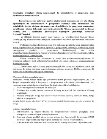 Komisyjne przeglądy klaczy zgłaszanych do uczestnictwa w programie koni sztumskich lub sokólskich. Komisyjna ocena pokroju i próby użytkowości prowadzona jest dla klaczy zgłaszanych do uczestnictwa w programie ochrony koni sztumskich lub sokólskich. Ocena nie jest równoznaczna z kwalifikacją do programu, ostatecznej kwalifikacji klaczy dokonuje Instytut Zootechniki PIB, po wpisaniu ich do Księgi stadnej pkz i spełnieniu pozostałych wymogów (bonitacja, wymiary, źrebność/krycie). W składzie komisji oceny musi znaleźć się przedstawiciel Komisji Księgi Stadnej (KKS). Przedstawiciel Instytutu Zootechniki PIB może być również członkiem komisji. Podczas przeglądu Komisja ocenia typ, dokonuje pomiarów oraz przeprowadza próbę użytkowości (w załączeniu, zgodnie z programem ochrony): tradycyjną próbę zaprzęgową (zgodnie z programem hodowlanym) lub próbę alternatywną/posłuszeństwa. Rodzaj przeprowadzanej próby użytkowości jest ustalany przez odpowiedni OZHK/WZHK. Klacze powinny być oznaczone w bazie jako proponowane/zgłoszone do programu ochrony koni sokólskich/sztumskich do końca miesiąca poprzedzającego miesiąc wystawy. Dodatkowo wykaz klaczy proponowanych do oceny na wystawie musi być zgłoszony do końca miesiąca poprzedzającego miesiąc wystawy PZHK, a następnie IZ PIB w celu weryfikacji pod kątem rodowodu. Wiosenne i letnie przeglądy klaczy Komisyjna ocena klaczy może być przeprowadzana podczas regionalnych (po 1 w danym województwie) i krajowych czempionatów młodzieży zimnokrwistej, pod warunkiem, ze będzie tam osobna klasa dla koni sztumskich/sokólskich . 1. Klacze muszą mieć ukończone 24 miesiące. 2. Oceniana jest stawka licząca minimum 5 klaczy sztumskich lub minimum 5 klaczy sokólskich. 3. Podczas przeglądu mogą być także oceniane klacze starsze, które nie brały dotąd udziału w programie. Uwaga: Jeżeli klacze ukończyły 27 m-cy muszą zostać zbonitowane w celu wpisania do księgi. Jesienne przeglądy klaczy 1. OZHK/WZHK są odpowiedzialne za zorganizowanie miejsc przeglądu oraz transportu i ewentualnych noclegów komisji. 2. Hodowcy chcący poddać klacze ocenie muszą ten fakt zgłosić do swojego OZHK, który jest odpowiedzialny za program ochrony na terenie województwa. 3. Proponowane klacze muszą mieć ukończone 25 miesięcy na dzień 15 października. 4. Przeglądy zostaną przeprowadzone w 7 województwach. Dla klaczy sztumskich będą się odbywać w województwach: kujawsko-pomorskim, pomorskim, warmińsko-mazurskim, mazowieckim, małopolskim, a dla klaczy sokólskich w podlaskim, warmińsko-mazurskim, lubelskim, mazowieckim, małopolskim. Proponowane terminy kwalifikacji: 17.10. 2016 – 29.10.2016 r., w tym dla poszczególnych województw: 17.10 – woj. kujawsko-pomorskie, 18-19.10 – woj. pomorskie, 20.10 – woj. warmińsko-mazurskie, 24-25.10 – woj. podlaskie, 26-27.10 – woj. mazowieckie (Warszawa + Radom), 28.10 – woj. lubelskie, 29.10 – woj. małopolskie - Klikowa. 5. Kwalifikacje klaczy mogą odbywać się również przy okazji aukcji ogierów, po zakończeniu oceny ogierów, pod warunkiem, że będzie tam osobna klasa dla koni sztumskich/sokólskich i zostanie przedstawiona stawka min 5 klaczy 2-letnich. Uwaga: Jeżeli klacze ukończyły 27 m-cy muszą zostać zbonitowane w celu wpisania do księgi. Wymiana klaczy Po 1 stycznia 2017r. bez oceny komisyjnej, o której mowa, będą mogły być wymieniane tylko klacze wprowadzane na miejsce wycofywanych ze względu na działanie siły wyższej: upadki, wybrakowanie z hodowli ze względu na choroby. W takim przypadku przy wycofaniu klaczy będzie konieczne zaświadczenie lekarza wet. o niezdolności do uczestnictwa w programie (np. bezpłodność) lub zaświadczenie odbioru padliny. Wprowadzana na zamianę klacz będzie wstępnie oceniana przez OZHK/WZHK i kwalifikowana warunkowo do czasu przedstawienia jej na jednym z przeglądów lub wystaw, o których mowa wyżej. Klacze wymieniane z innych powodów (sprzedaż, decyzja hodowcy, wymiana ze względu na selekcję stada, itd.) będą musiały być wcześniej poddane ocenie komisyjnej na przeglądach jesiennych lub wiosennych.
