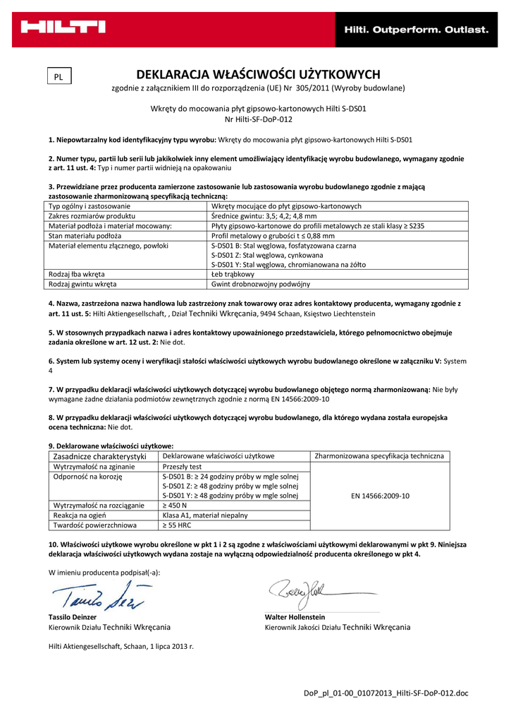 PL DEKLARACJA WŁAŚCIWOŚCI UŻYTKOWYCH zgodnie z załącznikiem III do rozporządzenia (UE) Nr 305/2011 (Wyroby budowlane) Wkręty do mocowania płyt gipsowo-kartonowych Hilti S-DS01 Nr Hilti-SF-DoP-012 1. Niepowtarzalny kod identyfikacyjny typu wyrobu: Wkręty do mocowania płyt gipsowo-kartonowych Hilti S-DS01 2. Numer typu, partii lub serii lub jakikolwiek inny element umożliwiający identyfikację wyrobu budowlanego, wymagany zgodnie z art. 11 ust. 4: Typ i numer partii widnieją na opakowaniu 3. Przewidziane przez producenta zamierzone zastosowanie lub zastosowania wyrobu budowlanego zgodnie z mającą zastosowanie zharmonizowaną specyfikacją techniczną: Typ ogólny i zastosowanie Wkręty mocujące do płyt gipsowo-kartonowych Zakres rozmiarów produktu Średnice gwintu: 3,5; 4,2; 4,8 mm Materiał podłoża i materiał mocowany: Płyty gipsowo-kartonowe do profili metalowych ze stali klasy ≥ S235 Stan materiału podłoża Profil metalowy o grubości t ≤ 0,88 mm Materiał elementu złącznego, powłoki S-DS01 B: Stal węglowa, fosfatyzowana czarna S-DS01 Z: Stal węglowa, cynkowana S-DS01 Y: Stal węglowa, chromianowana na żółto Rodzaj łba wkręta Łeb trąbkowy Rodzaj gwintu wkręta Gwint drobnozwojny podwójny 4. Nazwa, zastrzeżona nazwa handlowa lub zastrzeżony znak towarowy oraz adres kontaktowy producenta, wymagany zgodnie z art. 11 ust. 5: Hilti Aktiengesellschaft, , Dział Techniki Wkręcania, 9494 Schaan, Księstwo Liechtenstein 5. W stosownych przypadkach nazwa i adres kontaktowy upoważnionego przedstawiciela, którego pełnomocnictwo obejmuje zadania określone w art. 12 ust. 2: Nie dot. 6. System lub systemy oceny i weryfikacji stałości właściwości użytkowych wyrobu budowlanego określone w załączniku V: System 4 7. W przypadku deklaracji właściwości użytkowych dotyczącej wyrobu budowlanego objętego normą zharmonizowaną: Nie były wymagane żadne działania podmiotów zewnętrznych zgodnie z normą EN 14566:2009-10 8. W przypadku deklaracji właściwości użytkowych dotyczącej wyrobu budowlanego, dla którego wydana została europejska ocena techniczna: Nie dot. 9. Deklarowane właściwości użytkowe: Deklarowane właściwości użytkowe Zasadnicze charakterystyki Wytrzymałość na zginanie Przeszły test Odporność na korozję S-DS01 B: ≥ 24 godziny próby w mgle solnej S-DS01 Z: ≥ 48 godziny próby w mgle solnej S-DS01 Y: ≥ 48 godziny próby w mgle solnej Wytrzymałość na rozciąganie ≥ 450 N Reakcja na ogień Klasa A1, materiał niepalny Twardość powierzchniowa ≥ 55 HRC Zharmonizowana specyfikacja techniczna EN 14566:2009-10 10. Właściwości użytkowe wyrobu określone w pkt 1 i 2 są zgodne z właściwościami użytkowymi deklarowanymi w pkt 9. Niniejsza deklaracja właściwości użytkowych wydana zostaje na wyłączną odpowiedzialność producenta określonego w pkt 4. W imieniu producenta podpisał(-a): Tassilo Deinzer Kierownik Działu Techniki Wkręcania Walter Hollenstein Kierownik Jakości Działu Techniki Wkręcania Hilti Aktiengesellschaft, Schaan, 1 lipca 2013 r. DoP_pl_01-00_01072013_Hilti-SF-DoP-012.doc