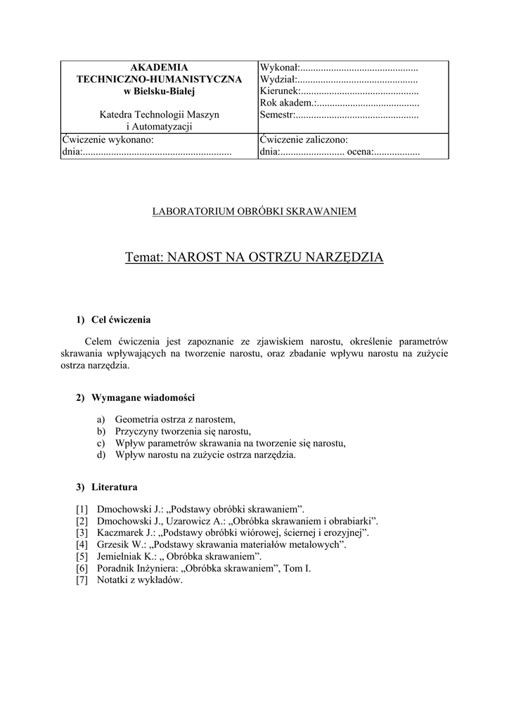 AKADEMIA TECHNICZNO-HUMANISTYCZNA w Bielsku-Białej Katedra Technologii Maszyn i Automatyzacji Ćwiczenie wykonano: dnia:.......................................................... Wykonał:.............................................. Wydział:............................................... Kierunek:.............................................. Rok akadem.:........................................ Semestr:................................................ Ćwiczenie zaliczono: dnia:......................... ocena:.................. LABORATORIUM OBRÓBKI SKRAWANIEM Temat: NAROST NA OSTRZU NARZĘDZIA 1) Cel ćwiczenia Celem ćwiczenia jest zapoznanie ze zjawiskiem narostu, określenie parametrów skrawania wpływających na tworzenie narostu, oraz zbadanie wpływu narostu na zużycie ostrza narzędzia. 2) Wymagane wiadomości a) b) c) d) Geometria ostrza z narostem, Przyczyny tworzenia się narostu, Wpływ parametrów skrawania na tworzenie się narostu, Wpływ narostu na zużycie ostrza narzędzia. 3) Literatura [1] [2] [3] [4] [5] [6] [7] Dmochowski J.: „Podstawy obróbki skrawaniem”. Dmochowski J., Uzarowicz A.: „Obróbka skrawaniem i obrabiarki”. Kaczmarek J.: „Podstawy obróbki wiórowej, ściernej i erozyjnej”. Grzesik W.: „Podstawy skrawania materiałów metalowych”. Jemielniak K.: „ Obróbka skrawaniem”. Poradnik Inżyniera: „Obróbka skrawaniem”, Tom I. Notatki z wykładów. 4) Przebieg ćwiczenia 4.1.) Omówienie ćwiczenia. − − − − 4.2.) Podanie parametrów skrawania: posuwu, obrotów, czasu, głębokości skrawania, Podanie kolejności wykonania ćwiczenia, Obserwacja narostu pod mikroskopem, Pomiar zużycia ostrza. Wykonanie ćwiczenia. Dla podanych parametrów skrawania obrabiamy materiał przez określony czas, dokonując w miedzy czasie pomiaru wielkości zużycia i obserwując powstawanie narostu WIADOMOŚCI TEORETYCZNE 1.) Zjawisko narostu. Podczas skrawania niektórych metali plastycznych w pewnym zakresie zmian warunków obróbki, można stwierdzić na powierzchni natarcia ostrza narzędzia, w pobliżu krawędzi skrawającej, wystąpienie bardzo twardego nawarstwienia o kształcie klina, powstałego z cząstek materiału obrabianego, zwanego narostem. Narost składa się z bardzo silnie odkształconych plastycznie warstewek materiału skrawanego i ma charakterystyczną, włóknistą budowę. Tak powstały narost na ostrzu narzędzia przejmuje rolę krawędzi skrawającej. Rys. 1. Wymiary geometryczne narostu Twardość narostu jest znacznie większa od twardości materiału obrabianego, jednocześnie rozkład jej nie jest równomierny. Największa twardość występuje u podstawy narostu, nieco mniejsza w środkowej jego części, a najmniejsza w pobliżu wierzchołka. W momencie, gdy suma rzutów rosnących sił tarcia Tn i Tp na pierwotną powierzchnię natarcia przekroczy wartość siły tarcia T, utrzymującej narost na ostrzu, wówczas narost zostaje zerwany z ostrza i usuniety razem z wiórem. Jest to główna przyczyna zanikania narostu. 2.) Warunki powstawania narostu. Podstawową przyczyną tworzenia się narostu, poza warunkami obróbki, jest wstęgowa forma wióra, zapewniająca ciągłość jego styku z powierzchnią natarcia ostrza narzędzia. Narost powstaje przy skrawaniu materiałów plastycznych, odkształcanych w warunkach panujących w strefie skrawania. Pogląd badaczy radzieckich dotyczący powstawania narostu opiera się na analizie zjawisk stykowych między wiórem i powierzchnią natarcia ostrza oraz analizie zmian wielkości fizyko-chemicznych materiału skrawanego, zachodzących w obszarze tworzenia się wióra pod wpływem temperatury i odkształceń plastycznych materiału. Badacze japońscy twierdzą natomiast, że narost na ostrzu tworzy się z materiału wióra przywartego do powierzchni natarcia w wyniku działania sił adhezji w miejscach bezpośredniego styku powierzchni trących. 3.) Wpływ parametrów skrawania na tworzenie się narostu. Decydujący wpływ na tworzenie się narostu ma szybkość skrawania. Zakres szybkości w których tworzy się narost, można podzielić na dwa przedziały: − przedział w którym ze wzrastającą szybkością wysokość narostu rośnie, − przedział w którym ze wzrastającą szybkością wysokość narostu maleje. Rys. 2. Zależność wymiarów narostu od prędkości skrawania 4.) Wpływ pozostałych warunków obróbki na tworzenie się narostu. Materiał ostrza - nie wywiera istotnego wpływu na proces tworzenia się narostu. Może jedynie wpływać na zakres prędkości skrawania. Kąt natarcia - z geometrycznych parametrów wywiera największy wpływ. Zmiana tego kąta powoduje zmianę wartości naprężeń i temperatur w strefie tworzenia się wióra. Po przekroczeniu wartości kąta natarcia równej 45º narost zanika całkowicie, niezależnie od prędkości skrawania. Rys. 3. Wpływ kąta natarcia na tworzenie się narostu Plastyczność materiału skrawanego - wywiera zasadniczy wpływ na tworzenie się narostu. Zastosowanie cieczy chłodząco-smarujących - powoduje wyraźne zmiany w procesie tworzenia się narostu, prowadząc często do jego całkowitego zaniku. 5.) Wpływ narostu na zużycie ostrza. Przy obróbce skrawaniem największy wpływ na zużycie ostrza ma prędkość skrawania. Na podstawie badań sporządza się wykresy obrazujące zależności wartości parametru zużycia ostrza w funkcji prędkości skrawania, które nazwano krzywymi Viereggego. Dla materiałów, przy skrawaniu których tworzy się narost, wykresy nie mają przebiegu monotonicznego, lecz posiadają przegięcia. Ten niemonotoniczny charakter przebiegu krzywych spowodowany jest głównie zjawiskiem tworzenia się i zanikania narostu. Wpływ prędkości skrawania - vc na zużycie ostrza na powierzchni przyłożenia - VB w warunkach tworzenia się narostu dla ostrza z węglików spiekanych przedstawiona na rysunku 4. Rys. 4. Wpływ prędkości skrawania na zużycie ostrza przy two