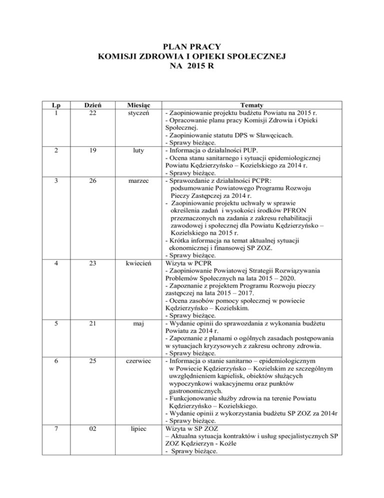 PLAN PRACY KOMISJI ZDROWIA I OPIEKI SPOŁECZNEJ NA 2015 R Lp 1 Dzień 22 Miesiąc styczeń 2 19 luty 3 26 marzec 4 23 kwiecień 5 21 maj 6 25 czerwiec 7 02 lipiec Tematy - Zaopiniowanie projektu budżetu Powiatu na 2015 r. - Opracowanie planu pracy Komisji Zdrowia i Opieki Społecznej. - Zaopiniowanie statutu DPS w Sławęcicach. - Sprawy bieżące. - Informacja o działalności PUP. - Ocena stanu sanitarnego i sytuacji epidemiologicznej Powiatu Kędzierzyńsko – Kozielskiego za 2014 r. - Sprawy bieżące. - Sprawozdanie z działalności PCPR: podsumowanie Powiatowego Programu Rozwoju Pieczy Zastępczej za 2014 r. - Zaopiniowanie projektu uchwały w sprawie określenia zadań i wysokości środków PFRON przeznaczonych na zadania z zakresu rehabilitacji zawodowej i społecznej dla Powiatu Kędzierzyńsko – Kozielskiego na 2015 r. - Krótka informacja na temat aktualnej sytuacji ekonomicznej i finansowej SP ZOZ. - Sprawy bieżące. Wizyta w PCPR - Zaopiniowanie Powiatowej Strategii Rozwiązywania Problemów Społecznych na lata 2015 – 2020. - Zapoznanie z projektem Programu Rozwoju pieczy zastępczej na lata 2015 – 2017. - Ocena zasobów pomocy społecznej w powiecie Kędzierzyńsko – Kozielskim. - Sprawy bieżące. - Wydanie opinii do sprawozdania z wykonania budżetu Powiatu za 2014 r. - Zapoznanie z planami o ogólnych zasadach postępowania w sytuacjach kryzysowych z zakresu ochrony zdrowia. - Sprawy bieżące. - Informacja o stanie sanitarno – epidemiologicznym w Powiecie Kędzierzyńsko – Kozielskim ze szczególnym uwzględnieniem kąpielisk, obiektów służących wypoczynkowi wakacyjnemu oraz punktów gastronomicznych. - Funkcjonowanie służby zdrowia na terenie Powiatu Kędzierzyńsko – Kozielskiego. - Wydanie opinii z wykorzystania budżetu SP ZOZ za 2014r - Sprawy bieżące. Wizyta w SP ZOZ – Aktualna sytuacja kontraktów i usług specjalistycznych SP ZOZ Kędzierzyn - Koźle - Sprawy bieżące. 8 28 sierpień 9 24 wrzesień 10 22 październik 11 19 listopad 12 12 grudzień Wizyta w DPS Sławięcice. - Ocena pracy placówki pod kątem spełnienia standardów określonych w przepisach Ministra Pracy i Polityki Społecznej. - Sprawy bieżące. - Wydanie opinii do sprawozdania z wykonania budżetu Powiatu za I półrocze 2015 r. - Ocena działalności PCPR za I półrocze 2015 r. - Aktualna informacja na temat funkcjonowania SP ZOZ. - Sprawy bieżące. - Ocena realizacji programów unijnych i z PFRON. - Ocena i stan realizacji programu ochrony zdrowia psychicznego w 2014 r. i w I półroczu 2015 r. - Sprawy bieżące. - Opinia projektów w sprawie ustalenia godzin pracy i planu dyżurów aptek ogólnodostępnych w powiecie Kędzierzyńsko – Kozielskim. - Informacja o działaniu Punktu przyjmującego zlecenia na materiały medyczne. - Opracowanie planu pracy komisji na 2016 r. - Sprawy bieżące. Wizyta w Domu Dziecka. - Opiniowanie projektu budżetu Powiatu Kędzierzyńsko – Kozielskiego na 2016 r. - Podsumowanie pracy komisji za 2015 r. - Sprawy bieżące. Tematyka planu pracy Komisji zdrowia i Opieki Społecznej może ulec uzupełnieniu i zmianie wg wynikających bieżących potrzeb. Terminy posiedzeń Komisji mogą ulec zmianie, o czym z wyprzedzeniem będą poinformowani członkowie Komisji. Przewodnicząca Komisji Zdrowia i Opieki Społecznej Jadwiga Kuźbida