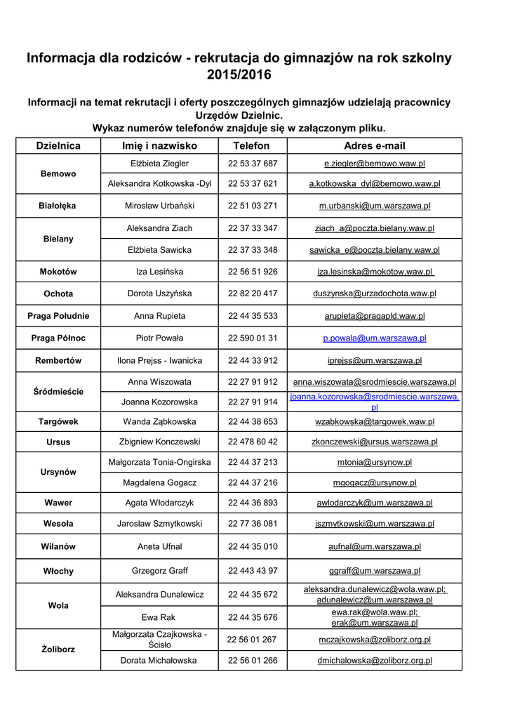 Informacja dla rodziców - rekrutacja do gimnazjów na rok szkolny 2015/2016 Informacji na temat rekrutacji i oferty poszczególnych gimnazjów udzielają pracownicy Urzędów Dzielnic. Wykaz numerów telefonów znajduje się w załączonym pliku. Dzielnica Imię i nazwisko Telefon Adres e-mail Elżbieta Ziegler 22 53 37 687 [email protected] Aleksandra Kotkowska -Dyl 22 53 37 621 [email protected] Mirosław Urbański 22 51 03 271 [email protected] Aleksandra Ziach 22 37 33 347 [email protected] Elżbieta Sawicka 22 37 33 348 [email protected] Mokotów Iza Lesińska 22 56 51 926 [email protected] Ochota Dorota Uszyńska 22 82 20 417 [email protected] Praga Południe Anna Rupieta 22 44 35 533 [email protected] Praga Północ Piotr Powała 22 590 01 31 [email protected] Rembertów Ilona Prejss - Iwanicka 22 44 33 912 [email protected] Anna Wiszowata 22 27 91 912 [email protected] Joanna Kozorowska 22 27 91 914 [email protected]. pl Targówek Wanda Ząbkowska 22 44 38 653 [email protected] Ursus Zbigniew Konczewski 22 478 60 42 [email protected] Małgorzata Tonia-Ongirska 22 44 37 213 [email protected] Magdalena Gogacz 22 44 37 216 [email protected] Wawer Agata Włodarczyk 22 44 36 893 [email protected] Wesoła Jarosław Szmytkowski 22 77 36 081 [email protected] Wilanów Aneta Ufnal 22 44 35 010 [email protected] Włochy Grzegorz Graff 22 443 43 97 [email protected] Aleksandra Dunalewicz 22 44 35 672 Ewa Rak 22 44 35 676 Małgorzata Czajkowska Ścisło 22 56 01 267 [email protected] Dorata Michałowska 22 56 01 266 [email protected] Bemowo Białołęka Bielany Śródmieście Ursynów Wola Żoliborz [email protected]; [email protected] [email protected]; [email protected] Dzielnica Imię i nazwisko Biuro Edukacji 22 44 33 550 Telefon Adres e-mail