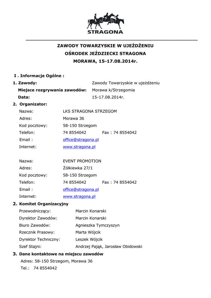 ______________________________________________________________ ZAWODY TOWARZYSKIE W UJEŻDŻENIU OŚRODEK JEŹDZIECKI STRAGONA MORAWA, 15-17.08.2014r. I . Informacje Ogólne : 1. Zawody: Zawody Towarzyskie w ujeżdżeniu Miejsce rozgrywania zawodów: Morawa k/Strzegomia Data: 15-17.08.2014r. 2. Organizator: Nazwa: LKS STRAGONA STRZEGOM Adres: Morawa 36 Kod pocztowy: 58-150 Strzegom Telefon: 74 8554042 Email : [email protected] Internet: www.stragona.pl Nazwa: EVENT PROMOTION Adres: Żółkiewka 27/1 Kod pocztowy: 58-150 Strzegom Telefon: 74 8554042 Email : [email protected] Internet: www.stragona.pl Fax : 74 8554042 Fax : 74 8554042 2. Komitet Organizacyjny Przewodniczący: Marcin Konarski Dyrektor Zawodów: Marcin Konarski Biuro Zawodów: Agnieszka Tymczyszyn Rzecznik Prasowy: Marta Wójcik Dyrektor Techniczny: Leszek Wójcik Szef Stajni: Andrzej Pająk, Jarosław Obidowski 3. Dane kontaktowe na miejscu zawodów Adres: 58-150 Strzegom, Morawa 36 Tel.: 74 8554042 II. Osoby Oficjalne (zgodnie z Przepisami o Sędziach wyd. 5, art.14 p.3): 2.1. Komisja Sędziowska: Wacław Pruchniewicz, Katarzyna Konarska, Marek Ruda 2.2. Komisarz: Anna Augustyńska-Mincger, Lucyna Łasica 2.3. Lekarz weterynarii zawodów: Michał Kornaszewski 609 283 888 III. Przepisy Ogólne - dokumentacja zawodników i koni –zgodna z wymogami regulaminowymi PZJ IV. Warunki techniczne 4.1. Plac konkursowy - piaskowy kwarcowy 4.2. Rozprężalnia - piaskowa kwarcowa V. Oferowane świadczenia: 5.1 Wyżywienie – na terenie zawodów 5.2 Stajnie boksowe: - organizator oferuje boksy Rezerwacja boksów tylko wraz ze zgłoszeniem do poniedziałku (11.08.2014r.) godz.20.00 Po tym terminie organizator zapewnia boksy w miarę możliwości. VI. Zgłoszenia i Opłaty: 6.1. Zgłoszenia: Termin zgłoszeń ostatecznych: 11.08.2014r. Zgłoszenia prosimy wysyłać na adres: Morawa 36, 58-150 Strzegom Fax : 74 8554042 Email: [email protected] W zgłoszeniach prosimy podać: imię i nazwisko zawodnika, nazwa konia, nazwa klubu, konkursy, ewentualne rezerwacje boksu i inne prośby oraz numer telefonu kontaktowego. Wraz ze zgłoszeniami należy również przesłać potwierdzenie dokonania przelewu opłaty organizacyjnej. 6.2. Opłaty: Opłata organizacyjna: 180 zł za całe zawody lub 70 zł za pojedynczy konkurs; Opłaty należy dokonać w biurze zawodów najpóźniej na 2 godziny przed rozpoczęciem konkursów. Bez dokonanej wpłaty zawodnicy oraz konie będą skreślani z list startowych. Wszelkie zmiany w zgłoszeniach po ogłoszeniu list startowych tylko za zgodą organizatora i po wpłacie 50 zł. Za konie zgłoszone po terminie pobierana będzie dodatkowa opłata wpisowa w wysokości 50zł. Stajnie boksowe: 225zł za całe zawody. Podłączenie samochodu do prądu:100zł. Opłaty organizacyjne proszę dokonywać na konto : Nazwa Banku: WBK BZ Strzegom Adres odbiorcy: LKS STRAGONA STRZEGOM Kod pocz.odbiorcy: 58-150 Adres Odbiorcy: Morawa 36, Strzegom Numer konta: 57 1090 2343 0000 0001 0499 1177 W przypadku nie wycofania się ze startu co najmniej na jeden dzień przed zawodami, zawodnicy są zobowiązani do uregulowania pełnych opłat. VII. Informacje różne: Organizator nie ponosi żadnej odpowiedzialności w razie wypadków i zachorowań zawodników, luzaków i koni jak również w przypadku kradzieży, zniszczeń, pożarów i innych zdarzeń losowych. VIII. Noclegi Pałac Morawa: Tel. 74 854 97 30 Kwatery Prywatne: rezerwacja za pośrednictwem Organizatora /pokój czteroosobowy - 180 zł, pokój trzyoosobowy - 150 zł, pokój dwuosobowy - 120 zł, min. 2 doby/. IX. PROGRAM ZAWODÓW – 15-17.08.2014r. Runda L ZT Piątek 15.08 – L1 Sobota 16.08 – L2 Niedziela 17.08 – L3 Runda P ZT Piątek 15.08 – P6 Sobota 16.08 – P7 Niedziela 17.08 – P8 Uwaga! W przypadku zgłoszenia startu w konkursach otwartych zawodników na kucach, konkursy te będą rozgrywane w 2 seriach: kuce i duże konie. Konkursy Towarzyskie nie są brane pod uwagę do klasyfikacji sportowej, a zawodnicy mają prawo startu bez aktualnych licencji i rejestracji. Dokładne godziny rozpoczęcia konkursów zostaną ogłoszone na stronie internetowej www.stragona.pl w dniu 28.03.2014 do godz. 20.00. X. Nagrody Floot’s dla 25% najlepszych koni w każdym konkursie i wszystkich koni startujących w konkursach dowolnych. Kuce będą klasyfikowane osobno. Dla zawodników startujących na kucach, organizator przewiduje nagrody rzeczowe. I. KODEKS POSTĘPOWANIA Z KONIEM I. Polski Związek Jeździecki w ślad za Międzynarodową Federacją Jeździecką FEI oczekuje, że wszystkie osoby zaangażowane w jakikolwiek sposób w sporty konne, będą przestrzegać zasad niniejszego Kodeksu Postępowania z Koniem oraz przyjmą do wiadomości, że w każdym przypadku dobro konia musi być sprawą nadrzędną i nigdy nie może być podporządkowane współzawodnictwu sportowemu ani celom komercyjnym. II. Na wszystkich etapach treningu i przygotowań konia do startu w zawodach, dobro konia musi stać ponad wszelkimi innymi wymaganiami. Dotyczy to stałej opieki, metod treningu, starannego obrządku, kucia i transportu. III. Konie i jeźdźcy muszą być wytrenowani, kompetentni i zdrowi zanim wezmą udział w zawodach. Odnosi się to także do podawania leków i środków medycznych, zabiegów chirurgicznych zagrażających dobru konia lub ciąży klaczy, oraz do przypadków nadużywania pomocy medycznej. IV. Zawody nie mogą zagrażać dobru konia. Wymaga to zwrócenia szczególnej uwagi na teren zawodów, powierzchnię podłoża, pogodę, warunki stajenne, kondycję koni i ich bezpieczeństwo także podczas podróży powrotnej z zawodów. V. Należy dołożyć wszelkich starań, aby zapewnić koniom staranną opiekę po zakończeniu zawodów, a także humanitarne traktowanie po zakończeniu kariery sportowej. Dotyczy to właściwej opieki weterynaryjnej obrażeń odniesionych na zawodach, spokojnej starości, ewentualnie eutanazji. PZJ zachęca wszystkie osoby działające w s