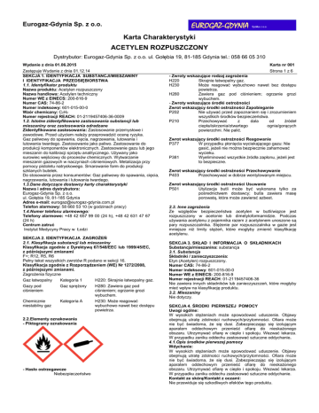 Eurogaz-Gdynia Sp. z o.o. Karta Charakterystyki ACETYLEN ROZPUSZCZONY Dystrybutor: Eurogaz-Gdynia Sp. z o.o. ul. Gołębia 19, 81-185 Gdynia tel.: 058 66 05 310 Wydanie z dnia 01.06.2015 Karta nr 001 Zastępuje Wydanie z dnia 01.12.14 SEKCJA 1. IDENTYFIKACJA SUBSTANCJI/MIESZANINY I IDENTYFIKACJA PRZEDSIĘBIORSTWA 1.1. Identyfikator produktu Nazwa produktu: Acetylen rozpuszczony Nazwa handlowa: Acetylen techniczny Numer WE z EINECS: 200-816-9 Numer CAS: 74-86-2 Numer indeksowy: 601-015-00-0 Wzór chemiczny: C2H2 Numer rejestracji REACH: 01-2119457406-36-0009 1.2. Istotne zidentyfikowane zastosowania substancji lub mieszaniny oraz zastosowania odradzane Zidentyfikowane zastosowania: Zastosowanie przemysłowe i zawodowe. Przed użyciem należy przeprowadzić ocenę ryzyka. Gaz paliwowy do spawania, cięcia, nagrzewania, lutowania i lutowania twardego. Zastosowanie jako paliwo. Zastosowanie do produkcji komponentów elektronicznych. Zastosowanie gazu lub jego mieszanin do kalibracji sprzętu analitycznego. Używany jako surowiec wejściowy do procesów chemicznych. Wytwarzanie mieszanin gazowych w naczyniach ciśnieniowych. Metalizacja przy pomocy pistoletu natryskowego. Smarowanie form do produkcji szklanych butelek. Do stosowania przez konsumentów: Gaz paliwowy do spawania, cięcia, nagrzewania, lutowania i lutowania twardego. 1.3.Dane dotyczące dostawcy karty charakterystyki Nazwa i adres dystrybutora: Eurogaz-Gdynia Sp. z o.o. ul. Gołębia 19, 81-185 Gdynia Adres e-mail: [email protected] Telefon alarmowy: 58 660 53 10 (w godzinach pracy) 1.4.Numer telefonu alarmowego: Telefony alarmowe: +48 42 657 99 00 (24 h), +48 42 631 47 67 (24 h) Centrum zatruć Instytut Medycyny Pracy w Łodzi SEKCJA 2. IDENTYFIKACJA ZAGROŻEŃ 2.1. Klasyfikacja substancji lub mieszaniny Klasyfikacja zgodnie z Dyrektywą 67/548/EEC lub 1999/45/EC, z późniejszymi zmianami F+; R12, R5, R6 Pełny tekst wszystkich zwrotów R podano w sekcji 16. Klasyfikacja zgodnie z Rozporządzeniem (WE) Nr 1272/2008, z późniejszymi zmianami. Zagrożenia fizyczne Gaz łatwopalny Kategoria 1 H220: Skrajnie łatwopalny gaz. Gazy pod ciśnieniem Gaz sprężony Chemicznie niestabilny gaz Kategoria A 2.2.Elementy oznakowania - Piktogramy oznakowania - Hasło ostrzegawcze Niebezpieczeństwo H280: Zawiera gaz pod ciśnieniem; ogrzanie grozi wybuchem. H230: Może reagować wybuchowo nawet bez dostępu powietrza. Strona 1 z 6 - Zwroty wskazujące rodzaj zagrożenia H220 Skrajnie łatwopalny gaz. H230 Może reagować wybuchowo nawet bez dostępu powietrza. H280 Zawiera gaz pod ciśnieniem; ogrzanie grozi wybuchem. - Zwroty wskazujące środki ostrożności Zwrot wskazujący środki ostrożności Zapobieganie P202 Nie używać przed zapoznaniem się i zrozumieniem wszystkich środków bezpieczeństwa. P210 Przechowywać z dala od źródeł ciepła/iskrzenia/otwartego ognia/gorących powierzchni. Nie palić. Zwrot wskazujący środki ostrożności Reagowanie P377 W przypadku płonięcia wyciekającego gazu: Nie gasić, jeżeli nie można bezpiecznie zahamować wycieku. P381 Wyeliminować wszystkie źródła zapłonu, jeżeli jest to bezpieczne. Zwrot wskazujący środki ostrożności Przechowywanie P403 Przechowywać w dobrze wentylowanym miejscu. Zwrot wskazujący środki ostrożności Usuwanie P501 Utylizacja butli może być wykonana tylko za pośrednictwem dostawcy; butla zawiera masę porowatą, która może zawierać azbest. 2.3. Inne zagrożenia Ze względów bezpieczeństwa acetylen w butli/wiązce jest rozpuszczony w acetonie lub dimetyloformamidzie. Podczas używania acetylenu z pojemnika razem z acetylenem unoszone są pary rozpuszczalnika. Stężenie par rozpuszczalnika w gazie jest mniejsze niż limity stężeń, które mogłyby zmienić klasyfikację acetylenu. SEKCJA 3. SKŁAD I INFORMACJA O SKŁADNIKACH Substancja/mieszanina: substancja 3.1. Substancja Składniki / zanieczyszczenia: Etyn (Acetylen) rozpuszczony. Numer CAS: 74-86-2 Numer indeksowy: 601-015-00-0 Numer WE z EINECS: 200-816-9 Numer rejestracji REACH: 01-2119457406-36 Nie zawiera innych składników lub zanieczyszczeń, które mogłyby mieć wpływ na klasyfikację produktu. 3.2. Mieszaniny Nie dotyczy. SEKCJA 4. ŚRODKI PIERWSZEJ POMOCY Uwagi ogólne: W wysokich stężeniach może spowodować uduszenie. Objawy obejmują utratę zdolności ruchowych/przytomności. Ofiara może nie być świadoma, że się dusi. Zabezpieczając się izolującym aparatem oddechowym przenieść ofiarę do nieskażonego obszaru. Utrzymywać ofiarę w cieple i spokoju. Wezwać lekarza. W przypadku zaniku oddechu zastosować sztuczne oddychanie. 4.1.Opis środków pierwszej pomocy Wdychanie: W wysokich stężeniach może spowodować uduszenie. Objawy obejmują utratę zdolności ruchowych/przytomności. Ofiara może nie być świadoma, że się dusi. Zabezpieczając się izolującym aparatem oddechowym przenieść ofiarę do nieskażonego obszaru. Utrzymywać ofiarę w cieple i spokoju. Wezwać lekarza. W przypadku zaniku oddechu zastosować sztuczne oddychanie. Kontakt ze skórą/Kontakt z oczami: Nie przewiduje się szkodliwych efektów tego produktu. Eurogaz-Gdynia Sp. z o.o. Karta Charakterystyki ACETYLEN ROZPUSZCZONY Dystrybutor: Eurogaz-Gdynia Sp. z o.o. ul. Gołębia 19, 81-185 Gdynia tel.: 058 66 05 310 Wydanie z dnia 01.06.2015 Zastępuje Wydanie z dnia 01.12.14 Połknięcie: Nie jest uważane za potencjalną drogę narażenia. 4.2.Najważniejsze ostre i opóźnione objawy oraz skutki narażenia Wstrzymanie oddechu. 4.3. Wskazania dotyczące wszelkiej natychmiastowej pomocy lekarskiej i szczególnego postępowania z poszkodowanym Zapewnić pomoc lekarską. SEKCJA 5. POSTĘPOWANIE W PRZYPADKU POŻARU Ogólne zagrożenia pożarowe: Pojemniki mogą wybuchnąć w skutek wysokiej temperatury. 5.1. Środki gaśnicze Właściwe środki gaśnicze Spryskiwanie wodą lub zastosowanie mgiełki. Suchy proszek. Piana. Środki gaśnicze, których nie wolno używać Ditlenek węgla. 5.2. S