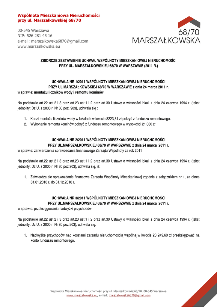 Wspólnota Mieszkaniowa Nieruchomości przy ul. Marszałkowskiej 68/70 00-545 Warszawa NIP: 526 281 45 16 e-mail: [email protected] www.marszalkowska.eu 68/70 MARSZAŁKOWSKA ZBIORCZE ZESTAWIENIE UCHWAŁ WSPÓLNOTY MIESZKANIOWEJ NIERUCHOMOŚCI PRZY UL. MARSZAŁKOWSKIEJ 68/70 W WARSZAWIE (2011 R.) UCHWAŁA NR 1/2011 WSPÓLNOTY MIESZKANIOWEJ NIERUCHOMOŚCI PRZY UL.MARSZAŁKOWSKIEJ 68/70 W WARSZAWIE z dnia 24 marca 2011 r. w sprawie: montażu liczników wody i remontu kominów Na podstawie art.22 ust.2 i 3 oraz art.23 ust.1 i 2 oraz art.30 Ustawy o własności lokali z dnia 24 czerwca 1994 r. (tekst jednolity: Dz.U. z 2000 r. Nr 80 poz. 903), uchwala się : 1. Koszt montażu liczników wody w lokalach w kwocie 8223,81 zł pokryć z funduszu remontowego. 2. Wykonanie remontu kominów pokryć z funduszu remontowego w wysokości 21 000 zł UCHWAŁA NR 2/2011 WSPÓLNOTY MIESZKANIOWEJ NIERUCHOMOŚCI PRZY UL.MARSZAŁKOWSKIEJ 68/70 W WARSZAWIE z dnia 24 marca 2011 r. w sprawie: zatwierdzenia sprawozdania finansowego Zarządu Wspólnoty za rok 2011 Na podstawie art.22 ust.2 i 3 oraz art.23 ust.1 i 2 oraz art.30 Ustawy o własności lokali z dnia 24 czerwca 1994 r. (tekst jednolity: Dz.U. z 2000 r. Nr 80 poz.903), uchwala się, iż: 1. Zatwierdza się sprawozdanie finansowe Zarządu Wspólnoty Mieszkaniowej zgodnie z załącznikiem nr 1, za okres 01.01.2010 r. do 31.12.2010 r. UCHWAŁA NR 3/2011 WSPÓLNOTY MIESZKANIOWEJ NIERUCHOMOŚCI PRZY UL.MARSZAŁKOWSKIEJ 68/70 W WARSZAWIE z dnia 24 marca 2011 r. w sprawie: przeksięgowania nadwyżki przychodów Na podstawie art.22 ust.2 i 3 oraz art.23 ust.1 i 2 oraz art.30 Ustawy o własności lokali z dnia 24 czerwca 1994 r. (tekst jednolity: Dz.U. z 2000 r. Nr 80 poz.903), uchwala się: 1. Nadwyżkę przychodów nad kosztami zarządu nieruchomością wspólną w kwocie 23 249,60 zł przeksięgować na konto funduszu remontowego. Wspólnota Mieszkaniowa Nieruchomości przy ul. Marszałkowskiej68/70, 00-545 Warszawa www.marszalkowska.eu, e-mail: [email protected] Strona 2 z 3 68/70 MARSZAŁKOWSKA UCHWAŁA NR 4/2011 WSPÓLNOTY MIESZKANIOWEJ NIERUCHOMOŚCI PRZY UL.MARSZAŁKOWSKIEJ 68/70 W WARSZAWIE z dnia 24 marca 2011r w sprawie: udzielenia absolutorium Zarządowi Wspólnoty za rok 2010 Na podstawie art.22 ust.2 i 3 oraz art.23 ust.1 i 2 oraz art.30 Ustawy o własności lokali z dnia 24 czerwca 1994 r. (tekst jednolity: Dz.U. z 2000 r. Nr 80 poz.903), uchwala się, iż: 1.Udziela się absolutorium Zarządowi Wspólnoty Mieszkaniowej za rok 2010. UCHWAŁA NR 5/2011 WSPÓLNOTY MIESZKANIOWEJ NIERUCHOMOŚCI PRZY UL.MARSZAŁKOWSKIEJ 68/70 W WARSZAWIE z dnia 24 marca 2011r w sprawie: wysokości zaliczek na koszty zarządu nieruchomością wspólną i fundusz remontowy Na podstawie art. 22 ust.2 i 3 oraz art.23 ust.1 i 2 Ustawy o własności lokali z dnia 24 czerwca 1994 r. (tekst jednolity: Dz. U.z 2000 r Nr 80 poz.903), uchwala się : 1. Zmniejszenie zaliczki na koszty zarządu nieruchomością wspólną do poziomu 2,50 zł za każdy m2 powierzchni użytkowej lokalu. 2. Zwiększenie zaliczki na fundusz remontowy do poziomu 1,60 zł za każdy m2 powierzchni użytkowej lokalu. 3. Wysokość zaliczek określonych w ust. 1 i 2 obowiązuje od 1 kwietnia 2011 r. UCHWAŁA NR 6/2011 WSPÓLNOTY MIESZKANIOWEJ NIERUCHOMOŚCI PRZY UL.MARSZAŁKOWSKIEJ 68/70 W WARSZAWIE z dnia 24 marca 2011 r. w sprawie: zatwierdzenia planu remontów na rok 2011 i kolejne lata Na podstawie art.22 ust.2 i 3 oraz art.23 ust.1 i 2 Ustawy o własności lokali z dnia 24 czerwca 1994 r. (tekst jednolity: Dz. U. z 2000 r. Nr 80 poz.903), uchwala się, iż: 1. Zatwierdza się plan remontów Wspólnoty Mieszkaniowej Nieruchomości położonej przy ul. Marszałkowskiej 68/70 w Warszawie: 1.1.Wykonanie remontu elewacji wraz z ociepleniem oraz wymiana balustrad balkonowych do 750 000 zł 1.2.Wymiana dźwigów osobowych do 350 000 zł 1.3.Wymiana pionów wodno-kanalizacyjnych zgodnie z Przeglądem Technicznym-sukcesywnie 1.4.Wymiana zaworów podpionowych CO do 5 000 zł 2. Upoważnia się Zarząd Wspólnoty do negocjacji cenowych i podpisania umów z wykonawcami. Wspólnota Mieszkaniowa Nieruchomości przy ul. Marszałkowskiej68/70, 00-545 Warszawa www.marszalkowska.eu, e-mail: [email protected] Strona 3 z 3 68/70 MARSZAŁKOWSKA UCHWAŁA NR 7/2011 WSPÓLNOTY MIESZKANIOWEJ NIERUCHOMOŚCI PRZY UL.MARSZAŁKOWSKIEJ 68/70 W WARSZAWIE z dnia 24 marca 2011r w sprawie: zgody na zaciągnięcie kredytu remontowego Na podstawie art.22 oraz art.23 Ustawy o własności lokali z dnia 24 czerwca 1994 r (tekst jednolity: Dz. U. z 2000 r. Nr 80 poz.903), uchwala się, iż: 1. wyraża się zgodę na zaciągnięcie kredytu na pokrycie kosztów remontów w budynku zgodnie z audytem remontowym w wysokości do 900 000,00 zł w Banku PKO BP S.A. na okres do 20 lat, zwanego dalej Kredytem, 2. upoważnia się Zarząd Wspólnoty do negocjacji warunków, zawarcia z Bankiem PKO BP S.A. umowy Kredytu i ustanowienia niezbędnych zabezpieczeń spłaty Kredytu, 3. źródłem spłaty Kredytu będą terminowe wpłaty zaliczek Członków Wspólnoty na konto funduszu remontowego, 4. udziela się Bankowi PKO BP S.A. pełnomocnictwa do rachunku funduszu remontowego tytułem zabezpieczenia spłaty Kredytu pod warunkiem zawarcia umowy Kredytu, 5. do czasu całkowitej spłaty Kredytu postanawia się nie udzielać pełnomocnictw do rachunku funduszu remontowego innym wierzycielom, 6. rachunek funduszu remontowego prowadzony przez Bank PKO BP S.A. nie zostanie przeniesiony do innego banku do czasu całkowitej spłaty Kredytu, 7. do czasu całkowitej spłaty Kredytu nie zostanie zmniejszona stawka zaliczki na wyodrębniony fundusz remontowy. Zarząd Wspólnoty Mieszkaniowej Wspólnota Mieszkaniowa Nieruchomości przy ul. Marszałkowskiej68/70, 00-545 Warszawa www.marszalkowska.eu, e-mail: [email protected]