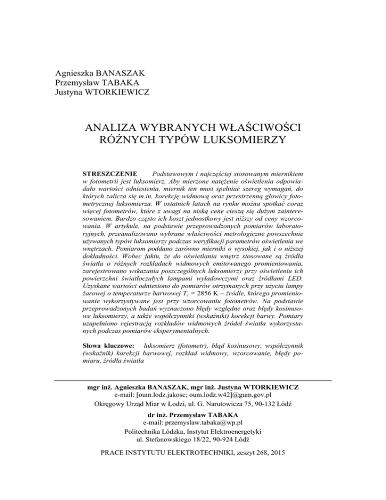 Agnieszka BANASZAK Przemysław TABAKA Justyna WTORKIEWICZ ANALIZA WYBRANYCH WŁAŚCIWOŚCI RÓŻNYCH TYPÓW LUKSOMIERZY STRESZCZENIE Podstawowym i najczęściej stosowanym miernikiem w fotometrii jest luksomierz. Aby mierzone natężenie oświetlenia odpowiadało wartości odniesienia, miernik ten musi spełniać szereg wymagań, do których zalicza się m.in. korekcję widmową oraz przestrzenną głowicy fotometrycznej luksomierza. W ostatnich latach na rynku można spotkać coraz więcej fotometrów, które z uwagi na niską cenę cieszą się dużym zainteresowaniem. Bardzo często ich koszt jednostkowy jest niższy od ceny wzorcowania. W artykule, na podstawie przeprowadzonych pomiarów laboratoryjnych, przeanalizowano wybrane właściwości metrologiczne powszechnie używanych typów luksomierzy podczas weryfikacji parametrów oświetlenia we wnętrzach. Pomiarom poddano zarówno mierniki o wysokiej, jak i o niższej dokładności. Wobec faktu, że do oświetlania wnętrz stosowane są źródła światła o różnych rozkładach widmowych emitowanego promieniowania, zarejestrowano wskazania poszczególnych luksomierzy przy oświetleniu ich powierzchni światłoczułych lampami wyładowczymi oraz źródłami LED. Uzyskane wartości odniesiono do pomiarów otrzymanych przy użyciu lampy żarowej o temperaturze barwowej Tc = 2856 K – źródle, którego promieniowanie wykorzystywane jest przy wzorcowaniu fotometrów. Na podstawie przeprowadzonych badań wyznaczono błędy względne oraz błędy kosinusowe luksomierzy, a także współczynniki (wskaźniki) korekcji barwy. Pomiary uzupełniono rejestracją rozkładów widmowych źródeł światła wykorzystanych podczas pomiarów eksperymentalnych. Słowa kluczowe: luksomierz (fotometr), błąd kosinusowy, współczynnik (wskaźnik) korekcji barwowej, rozkład widmowy, wzorcowanie, błędy pomiaru, źródła światła mgr inż. Agnieszka BANASZAK, mgr inż. Justyna WTORKIEWICZ e-mail: [oum.lodz.jakosc; oum.lodz.w42]@gum.gov.pl Okręgowy Urząd Miar w Łodzi, ul. G. Narutowicza 75, 90-132 Łódź dr inż. Przemysław TABAKA e-mail: [email protected] Politechnika Łódzka, Instytut Elektroenergetyki ul. Stefanowskiego 18/22, 90-924 Łódź PRACE INSTYTUTU ELEKTROTECHNIKI, zeszyt 268, 2015 84 A. Banaszak, P. Tabaka, J. Wtorkiewicz 1. WSTĘP W warunkach niedostatecznego lub całkowitego braku oświetlenia dziennego zachodzi konieczność zastosowania oświetlenia sztucznego. Pracodawca zobowiązany jest do zapewnienia oświetlenia elektrycznego o parametrach zgodnych z wymaganiami Polskich Norm, w myśl rozporządzenia Ministra Pracy i Polityki Socjalnej z dnia 26 września 1997 r. [1]. W tym samym rozporządzeniu znajduje się zapis nakładający na pracodawcę obowiązek przeprowadzania pomiarów i oceny parametrów natężenia oświetlenia. Podstawową i w praktyce jedyną wielkością mierzoną podczas weryfikacji parametrów oświetlenia elektrycznego we wnętrzach jest natężenie oświetlenia, które mierzy się za pomocą luksomierza – przyrządu składającego się z głowicy pomiarowej oraz miernika prądu fotoelektrycznego współpracującego ze wzmacniaczem. Aby rejestrowane przez luksomierz natężenie oświetlenia odpowiadało wartości odniesienia, przyrząd ten musi spełniać szereg wymagań. Do najważniejszych z nich należy skorygowanie głowicy fotometrycznej luksomierza pod względem widmowym i przestrzennym. Bardzo często w praktyce pomiarowej zdarza się, że weryfikację parametrów oświetlenia elektrycznego przeprowadzają osoby niebędące specjalistami z zakresu miernictwa techniki świetlnej. To one też nierzadko podejmują decyzję o wyborze fotometru. W takim przypadku głównym kryterium przy zakupie luksomierza jest jego cena. Oferta dostępnych na rynku fotometrów jest bardzo szeroka. Ich ceny są bardzo zróżnicowane. Koszt tych najtańszych jest niższy od ceny wzorcowania, natomiast tych droższych sięga kilku tysięcy złotych. Podczas weryfikacji natężenia oświetlenia, zgodnie z zapisami w Polskich Normach dotyczących oświetlenia wnętrz [7, 8], zaleca się, aby używane fotometry były wywzorcowane. Powszechnie uważa się, że gwarancją prawidłowości wskazań jest świadectwo wzorcowania luksomierza, najlepiej wydane przez akredytowane laboratorium wzorcujące. Warto jednak podkreślić, że do wzorcowania luksomierzy najczęściej używa się wzorców światłości w postaci lamp żarowych o temperaturze barwowej Tc = 2856 K. Obecnie do oświetlania wnętrz (pomijając gospodarstwa domowe), z uwagi na niską skuteczność świetlną, w zasadzie nie stosuje się już żarowych źródeł światła. Ich miejsce zajęły bardziej wydajne źródła światła, do których zalicza się lampy wyładowcze oraz coraz bardziej popularne diody elektroluminescencyjne. Rozkłady widmowe promieniowania emitowanego przez te lampy, z uwagi na inny sposób wytwarzania światła, różnią się od tego, przy którym przeprowadzono wzorcowanie luksomierza. Fakt ten będzie źródłem błędów pomiarowych, których wartości będą zależeć od stopnia dopasowania czułości widmowej fotoogniwa do krzywej V. Kolejnym czynnikiem wpływającym na dokładność pomiarów jest tzw. korekcja kosinusowa, której zadaniem jest eliminowanie błędów pomiarów, wynikających z promieniowania padającego pod kątem innym niż 0º. Ma to istotne znaczenie głównie w pomieszczeniach rozległych, w których światło na powierzchnię czynną fotoogniwa pada z różnych kierunków. Zagadnienia dotyczące korekcji widmowej i przestrzennej głowic fotometrycznych luksomierzy są dobrze znane. Szczegółów na ten temat dostarcza bogata literatura Analiza wybranych właściwości różnych typów luksomierzy 85 [9, 10, 11, 12, 13]. Niestety, w praktyce pomiarowej, podczas weryfikacji parametrów oświetlenia we wnętrzach, coraz częściej wykorzystywane są fotometry, w odniesieniu do których dopasowanie widmowe i 