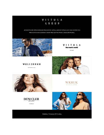 VISTULA GROUP SA – Sprawozdanie finansowe za 2014 rok Spis treści SPRAWOZDANIE Z CAŁKOWITYCH DOCHODÓW ..................................................................... 3 SPRAWOZDANIE Z SYTUACJI FINANSOWEJ ............................................................................ 4 SPRAWOZDANIE ZE ZMIAN W KAPITALE WŁASNYM ................................................................ 6 SPRAWOZDANIE Z PRZEPŁYWÓW PIENIĘŻNYCH.................................................................... 7 INFORMACJE I OBJAŚNIENIA DO SPRAWOZDANIA FINANSOWEGO ........................................ 9 1. INFORMACJE OGÓLNE.............................................................................................................................9 2. ZASADY SPORZĄDZENIA SPRAWOZDANIA FINANSOWEGO .................................................................. 10 3. OMÓWIENIE PODSTAWOWYCH ZASAD RACHUNKOWOŚCI ................................................................... 11 4. NOTY UZUPEŁNIAJĄCE DO SPRAWOZDAŃ FINANSOWYCH ................................................................... 22 Nota 1 Przychody ...................................................................................................................................... 22 Nota 2 Segmenty według rodzaju działalności i podziału geograficznego ........................................................ 22 Nota 4 Koszty działalności operacyjnej oraz pozostałe koszty operacyjne ....................................................... 24 Nota 4a Koszty wynagrodzeń ....................................................................................................................... 24 Nota 5 Przychody finansowe ...................................................................................................................... 24 Nota 6 Koszty finansowe ............................................................................................................................ 25 Nota 7 Podatek dochodowy ........................................................................................................................ 25 Nota 10 Zysk na akcję ................................................................................................................................. 26 Nota 11 Wartość firmy ................................................................................................................................. 26 Nota 12 Inne wartości niematerialne .............................................................................................................. 27 Nota 13 Rzeczowe aktywa trwałe .................................................................................................................. 28 Nota 14 Nieruchomości inwestycyjne ............................................................................................................ 30 Nota 15 Jednostki zależne ........................................................................................................................... 31 Nota 15a Jednostki pozostałe (udziały i akcje) ................................................................................................. 31 Nota 18 Zapasy........................................................................................................................................... 32 Nota 19 Należności długoterminowe ............................................................................................................. 32 Nota 20 Należności z tytułu dostaw i usług oraz pozostałe należności .............................................................. 32 Nota 21 Środki pieniężne i ich ekwiwalenty .................................................................................................... 35 Nota 22 Pożyczki i kredyty bankowe ............................................................................................................. 35 Nota 24 Pozostałe aktywa trwałe .................................................................................................................. 37 Nota 24a Pozostałe aktywa obrotowe .............................................................................................................. 37 Nota 25 Podatek odroczony ......................................................................................................................... 37 Nota 26 Zobowiązania z tytułu leasingu finansowego ...................................................................................... 38 Nota 27 Zobowiązania z tyt. dostaw i usług oraz pozostałe zobowiązania ......................................................... 38 Nota 28 Rezerwy......................................................................................................................................... 39 Nota 29 Kapitał Akcyjny ............................................................................................................................... 39 Nota 30 Kapitał zapasowy ............................................................................................................................ 40 Nota 33. Pozostałe kapitały (rezerwowy) ........................................................................................................ 41 Nota 34 Niepodzielony wynik finansowy ........................................................................................................ 41 Nota 37 Należności i zobowiązania warunkowe .............................................................................................. 42 Nota 37a Należności i zobowiązania pozabilansowe ......................................................................................... 42 Nota 39 Płatności regulowane akcjami .......................................................................................................... 42 Nota 41 Istotne zdarzenia w 2014 roku ........................................................................