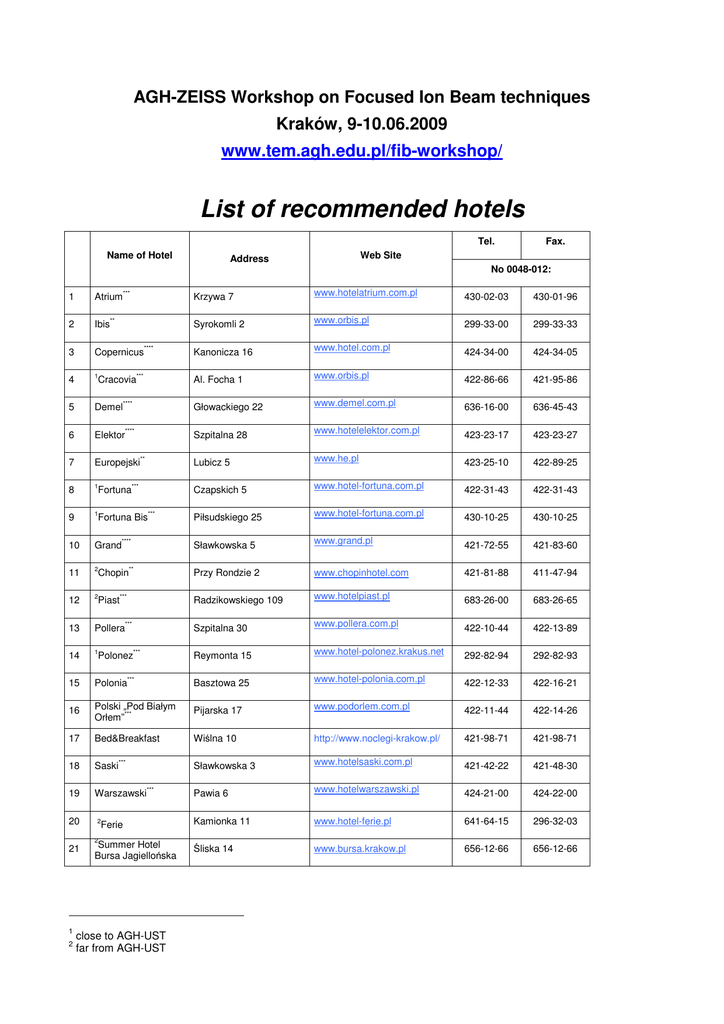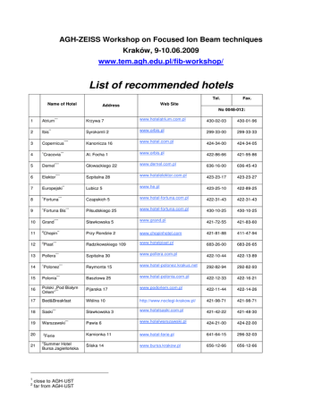 AGH-ZEISS Workshop on Focused Ion Beam techniques Kraków, 9-10.06.2009 www.tem.agh.edu.pl/fib-workshop/ List of recommended hotels Tel. Name of Hotel Fax. Web Site Address No 0048-012: 1 Atrium*** Krzywa 7 www.hotelatrium.com.pl 430-02-03 430-01-96 2 Ibis** Syrokomli 2 www.orbis.pl 299-33-00 299-33-33 3 Copernicus**** Kanonicza 16 www.hotel.com.pl 424-34-00 424-34-05 4 1 Al. Focha 1 www.orbis.pl 422-86-66 421-95-86 5 Demel**** Głowackiego 22 www.demel.com.pl 636-16-00 636-45-43 6 Elektor**** Szpitalna 28 www.hotelelektor.com.pl 423-23-17 423-23-27 7 Europejski** Lubicz 5 www.he.pl 423-25-10 422-89-25 8 1 Czapskich 5 www.hotel-fortuna.com.pl 422-31-43 422-31-43 9 1 Piłsudskiego 25 www.hotel-fortuna.com.pl 430-10-25 430-10-25 10 Grand**** Sławkowska 5 www.grand.pl 421-72-55 421-83-60 11 2 Przy Rondzie 2 www.chopinhotel.com 421-81-88 411-47-94 12 2 Radzikowskiego 109 www.hotelpiast.pl 683-26-00 683-26-65 13 Pollera*** Szpitalna 30 www.pollera.com.pl 422-10-44 422-13-89 14 1 Reymonta 15 www.hotel-polonez.krakus.net 292-82-94 292-82-93 15 Polonia*** Basztowa 25 www.hotel-polonia.com.pl 422-12-33 422-16-21 16 Polski „Pod Białym Orłem”*** Pijarska 17 www.podorlem.com.pl 422-11-44 422-14-26 17 Bed&Breakfast Wiślna 10 http://www.noclegi-krakow.pl/ 421-98-71 421-98-71 18 Saski*** Sławkowska 3 www.hotelsaski.com.pl 421-42-22 421-48-30 19 Warszawski*** Pawia 6 www.hotelwarszawski.pl 424-21-00 424-22-00 Kamionka 11 www.hotel-ferie.pl 641-64-15 296-32-03 Śliska 14 www.bursa.krakow.pl 656-12-66 656-12-66 Cracovia*** Fortuna*** Fortuna Bis*** 20 21 1 2 Chopin** Piast*** Polonez*** 2 Ferie 2 Summer Hotel Bursa Jagiellońska close to AGH-UST far from AGH-UST