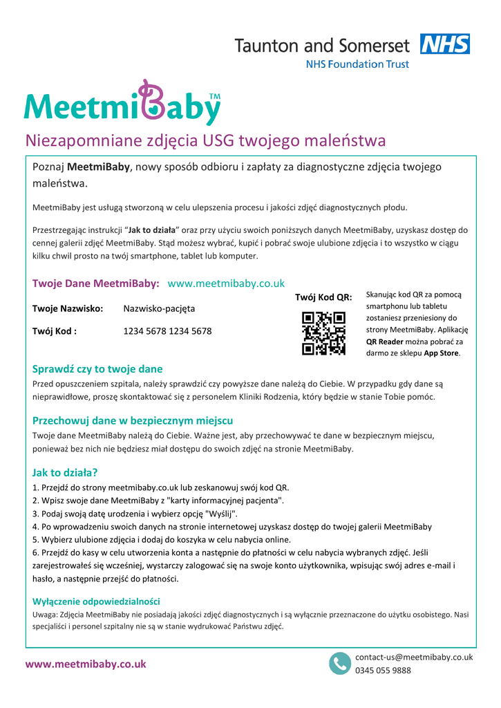 Niezapomniane zdjęcia USG twojego maleństwa Poznaj MeetmiBaby, nowy sposób odbioru i zapłaty za diagnostyczne zdjęcia twojego maleństwa. MeetmiBaby jest usługą stworzoną w celu ulepszenia procesu i jakości zdjęć diagnostycznych płodu. Przestrzegając instrukcji “Jak to działa” oraz przy użyciu swoich poniższych danych MeetmiBaby, uzyskasz dostęp do cennej galerii zdjęć MeetmiBaby. Stąd możesz wybrać, kupić i pobrać swoje ulubione zdjęcia i to wszystko w ciągu kilku chwil prosto na twój smartphone, tablet lub komputer. Twoje Dane MeetmiBaby: www.meetmibaby.co.uk Twój Kod QR: Twoje Nazwisko: Nazwisko-pacjęta Twój Kod : 1234 5678 1234 5678 Skanując kod QR za pomocą smartphonu lub tabletu zostaniesz przeniesiony do strony MeetmiBaby. Aplikację QR Reader można pobrać za darmo ze sklepu App Store. Sprawdź czy to twoje dane Przed opuszczeniem szpitala, należy sprawdzić czy powyższe dane należą do Ciebie. W przypadku gdy dane są nieprawidłowe, proszę skontaktować się z personelem Kliniki Rodzenia, który będzie w stanie Tobie pomóc. Przechowuj dane w bezpiecznym miejscu Twoje dane MeetmiBaby należą do Ciebie. Ważne jest, aby przechowywać te dane w bezpiecznym miejscu, ponieważ bez nich nie będziesz miał dostępu do swoich zdjęć na stronie MeetmiBaby. Jak to działa? 1. Przejdź do strony meetmibaby.co.uk lub zeskanowuj swój kod QR. 2. Wpisz swoje dane MeetmiBaby z "karty informacyjnej pacjenta". 3. Podaj swoją datę urodzenia i wybierz opcję "Wyślij". 4. Po wprowadzeniu swoich danych na stronie internetowej uzyskasz dostęp do twojej galerii MeetmiBaby 5. Wybierz ulubione zdjęcia i dodaj do koszyka w celu nabycia online. 6. Przejdź do kasy w celu utworzenia konta a następnie do płatności w celu nabycia wybranych zdjęć. Jeśli zarejestrowałeś się wcześniej, wystarczy zalogować się na swoje konto użytkownika, wpisując swój adres e-mail i hasło, a następnie przejść do płatności. Wyłączenie odpowiedzialności Uwaga: Zdjęcia MeetmiBaby nie posiadają jakości zdjęć diagnostycznych i są wyłącznie przeznaczone do użytku osobistego. Nasi specjaliści i personel szpitalny nie są w stanie wydrukować Państwu zdjęć. www.meetmibaby.co.uk [email protected] 0345 055 9888
