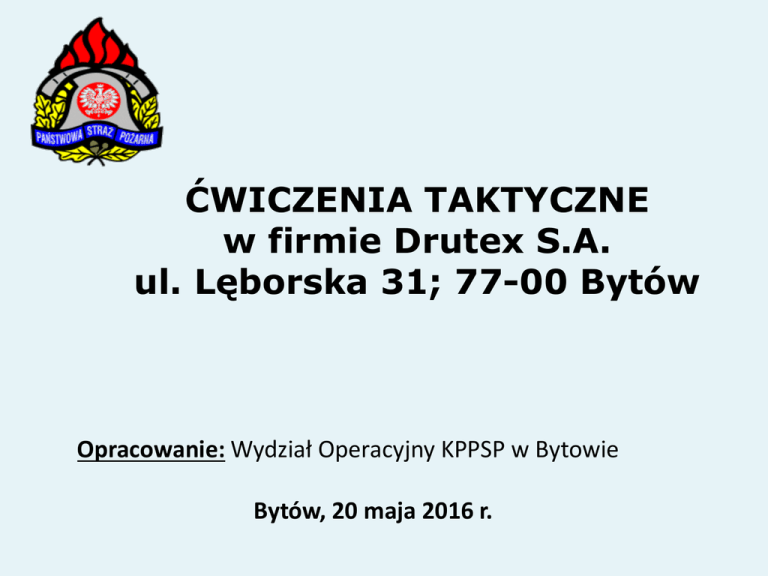 ĆWICZENIA TAKTYCZNE w firmie Drutex S.A. ul. Lęborska 31; 77-00 Bytów Opracowanie: Wydział Operacyjny KPPSP w Bytowie Bytów, 20 maja 2016 r. Cel ćwiczeń 1. Zapoznanie służb ratowniczych, członków PZZK z firmą DRUTEX S.A. (profilem produkcji, charakterystyką pożarową składowanych materiałów, drogami komunikacyjnymi, sprzętem p.pożarowym, zaopatrzeniem wodnym itp. 2. Kształcenie i doskonalenie zasad postępowania załogi firmy DRUTEX S.A. w sytuacji awaryjnej, do momentu przyjazdu służb ratowniczych (alarm pożarowy, ewakuacja, działania gaśnicze, przekazanie informacji o sytuacji KDR, współpraca z KDR). 3. Doskonalenie zasad kierowania działaniami ratowniczymi przed dowódców szczebla interwencyjnego i taktycznego. Cel ćwiczeń 4. Zgrywanie działań służb i straży powiatu bytowskiego oraz załogi firmy Drutex S.A. podczas wystąpienia sytuacji awaryjnych (pożaru), dot. Policji, PRM, PSP, OSP. 4. Doskonalenie zasad organizacji uczestnikami akcji ratowniczej. łączności pomiędzy 6. Doskonalenie procedur i zasad postępowania w zakresie udzielania kwalifikowanej pierwszej pomocy 7. Współdziałanie służb ratowniczych z Powiatowym Zespołem Zarządzania Kryzysowego. Siły i środki służb, instytucje współdziałające w sytuacjach kryzysowych, zaangażowane do ćwiczeń Lp . 1 Załoga firmy DRUTEX S.A. 4 3 Szpital Powiatu Bytowskiego Komenda Powiatowa Policji 12 Sposób kontaktu Z KDR goniec kan. B112 4 kan. B 112 15 kan. B 112 B003 6 Powiatowy Zespół Zarządzania Kryzysowego Pozoranci 7 Wodociągi Miejskie 4 5 Jednostka organizacyjna RAZEM Ilość osób 10 45 symulacyjnie Uwag i Zadania dla ćwiczących PERSONEL PRACOWNICZY firmy DRUTEX Rozpoznanie sytuacji, Alarm pożarowy, ewakuacja osób poszkodowanych ze strefy zagrożenia, Powiadomienie SK KP PSP, Powiadomienie kierownictwa, innych osób, służb-wg procedur, Wyłączenie energii elektrycznej, Podjęcie pierwszych działań ratowniczych z użyciem gaśnic, wewnętrznej sieci hydrantowej. Zadania dla ćwiczących PERSONEL PRACOWNICZY DRUTEX Przekazanie informacji o sytuacji na miejscu zdarzenia dowódcy pierwszego zastępu straży pożarnej (KDR), dostarczenie niezbędnej dokumentacji (Instrukcja p.pożarowa itp.), Współpraca personelu kierowniczego zakładu z KDR do momentu zakończenia akacji ratowniczej, Przyjęcie od KDR miejsca akcji ratowniczej. Zadania dla ćwiczących STRAŻ POŻARNA Działania ratownicze, związane z pożarem hali produkcyjnej, w tym: ewakuacja ludzi, gaszenie pożaru, działania obronne, udzielanie kwalifikowanej pierwszej pomocy poszkodowanym, współdziałanie z PRM, Policją współpraca z PZZK Zorganizowanie Sztabu akcji. Zadania dla ćwiczących POLICJA Zabezpieczenie tras przejazdu służb ratowniczych, Ostrzeganie ludności w strefie zagrożenia (komunikaty o zagrożeniu) w pobliżu osad przyległych w przypadku wystąpienia takiego zagrożenia), Pomoc w działaniach ewakuacyjnych, Organizacja zadań w zakresie zabezpieczenia ewakuowanego-wartościowego mienia, Pomoc w zabezpieczeniu osób ewakuowanych. Zadania dla ćwiczących PAŃSTOWE RATOWNICTWO MEDYCZNE Przejęcie od ratowników PSP/OSP osób poszkodowanych pracowników DRUTEX, Przeprowadzenie segregacji masowej (triage), Udzielnie doraźnej pomocy medycznej na miejscu akcji, Rozpoznanie w kontakcie z Woj. Lekarzem Koordynatorem dot. dodatkowych środków transportu, miejsc szpitalnych w innych placówkach medycznych (w momencie wystąpienia sytuacji kryzysowej – wypadek masowy), Transport osób poszkodowanych do Szpitala w Bytowie, innych placówek, dyspozycja LPR (symulacyjnie), Zabezpieczenie medyczne akcji ratowniczej (gaszenie pożaru). Zadania dla ćwiczących POWIATOWT ZESPÓŁ ZARZĄDZANIA KRYZYSOWEGO/PZZK Włączenie się do pracy w sztabie, udzielanie wszechstronnej pomocy KDR przy podejmowaniu decyzji dot. sposobu organizacji akcji ratowniczej w tym: akcja ostrzegania i alarmowania ludności w strefie zagrożenia (w przypadku wystąpienia zagrożenia dla osad sąsiednich), organizacja zaplecza socjalnego dla osób ewakuowanych, zabezpieczenie pomocy medycznej, psychologicznej dla osób poszkodowanych, pomoc przy organizacji zaplecza logistycznego (wyżywienie, paliwo, środki gaśnicze itp.). Założenie taktyczne Wózkiem widłowym, w worku przewożony jest granulat do produkcji profili okiennych. Granulat jest przewożony w kierunku ściany hali, gdzie jest składowany. Wózek jest napędzany gazem propan butan z 2 butli. Operator wózka zauważa płomienie wydobywające się z otoczenia butli. Zatrzymuje wózek i próbuje gasić pożar przy pomocy gaśnicy. Działania są nieskuteczne. Od palącego się wózka zapalają się składowane obok odpady produkcyjne, opakowania. Operator wózka powiadamia innych pracowników. Rozpoczyna się akcja ratownicza. Uczestnicy ćwiczeń: Komenda Powiatowa Państwowej Straży Pożarnej w Bytowie Powiatowy Zespół Zarządzania Kryzysowego w Bytowie Ochotnicze Straże Pożarne Komenda Powiatowa Policji w Bytowie Zespół wyjazdowy PRM Szpitala Powiatu Bytowskiego Załoga firmy Drutex S.A.
