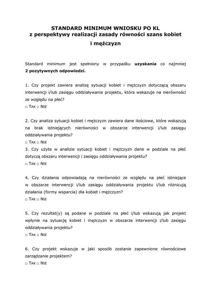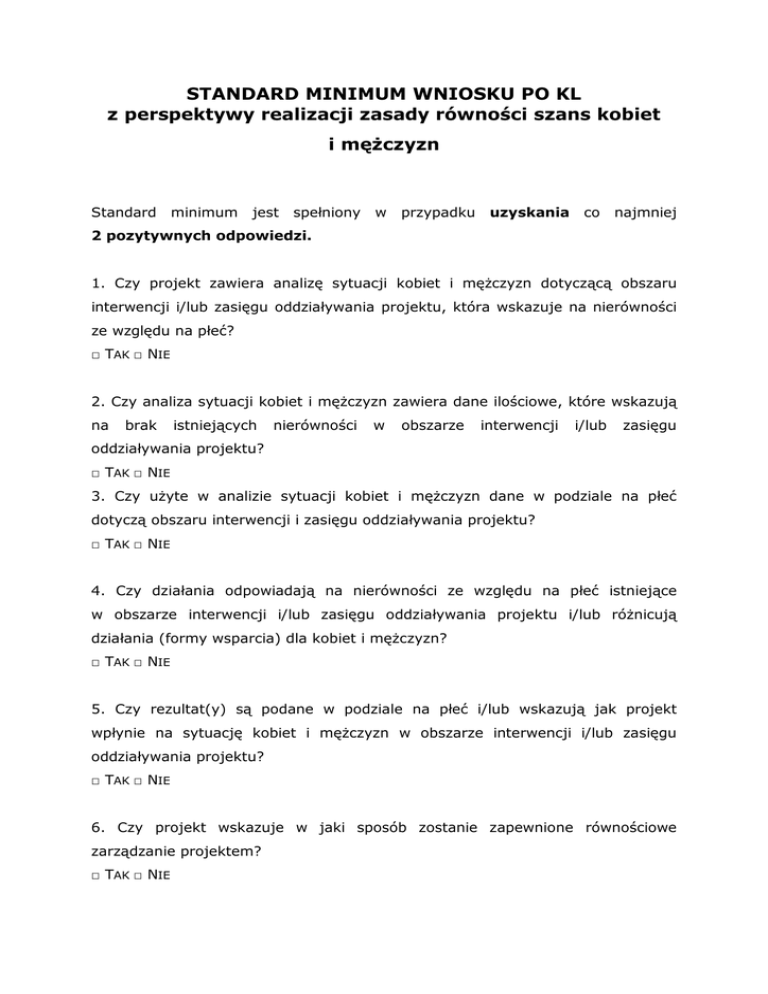 STANDARD MINIMUM WNIOSKU PO KL z perspektywy realizacji zasady równości szans kobiet i męŜczyzn Standard minimum jest spełniony w przypadku uzyskania co najmniej 2 pozytywnych odpowiedzi. 1. Czy projekt zawiera analizę sytuacji kobiet i męŜczyzn dotyczącą obszaru interwencji i/lub zasięgu oddziaływania projektu, która wskazuje na nierówności ze względu na płeć? □ TAK □ NIE 2. Czy analiza sytuacji kobiet i męŜczyzn zawiera dane ilościowe, które wskazują na brak istniejących nierówności w obszarze interwencji i/lub zasięgu oddziaływania projektu? □ TAK □ NIE 3. Czy uŜyte w analizie sytuacji kobiet i męŜczyzn dane w podziale na płeć dotyczą obszaru interwencji i zasięgu oddziaływania projektu? □ TAK □ NIE 4. Czy działania odpowiadają na nierówności ze względu na płeć istniejące w obszarze interwencji i/lub zasięgu oddziaływania projektu i/lub róŜnicują działania (formy wsparcia) dla kobiet i męŜczyzn? □ TAK □ NIE 5. Czy rezultat(y) są podane w podziale na płeć i/lub wskazują jak projekt wpłynie na sytuację kobiet i męŜczyzn w obszarze interwencji i/lub zasięgu oddziaływania projektu? □ TAK □ NIE 6. Czy projekt wskazuje w jaki sposób zostanie zapewnione równościowe zarządzanie projektem? □ TAK □ NIE 7. Czy projekt naleŜy do wyjątku, co do którego nie stosuje się standardu minimum? □ TAK □ NIE Wyjątki, co do których nie stosuje się standardu minimum: 1) profil działalności projektodawcy (ograniczenia statutowe), 2) realizacja działań pozytywnych (działania te pozwalają na wpłynięcie na niekorzystną sytuację danej płci w konkretnym obszarze interwencji i zasięgu oddziaływania projektu, a tym samym wyrównanie jej szans społecznych i zawodowych), 3) zamknięta rekrutacja – projekt obejmuje - ze względu na swój zakres oddziaływania - wsparciem wszystkich pracowników/personel konkretnego podmiotu, wyodrębnionej organizacyjnie części danego podmiotu lub konkretnej grupy podmiotów wskazanych we wniosku o dofinansowanie.