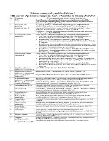 Szkolny zestaw podręczników dla klasy I VIII Liceum Ogólnokształcącego im. KEN w Gdańsku na rok szk. 2012/2013 Lp. Przedmiot 1. Etyka 2. Język polski klasy B,C,D,E,F Język polski klasa A 3. Język angielski (zakres podstawowy) Język angielski (zakres rozszerzony) 4. 5. 6. 7. 8. 9. Język francuski(zakres podstawowy oraz klasa I a) Język niemiecki (zakres podstawowy i rozszerzony) Język rosyjski (zakres podstawowy) Matematyka (zakres podstawowy i rozszerzony) Wiedza o społeczeństwie (zakres podstawowy) Historia klasy B,C,D,E,F Historia klasa A 10. 15. Geografia (zakres podstawowy) Biologia (zakres podstawowy) Fizyka (zakres podstawowy) Chemia (zakres podstawowy) Edukacja dla bezpieczeństwa Informatyka 16. Wiedza o kulturze 17. Podstawy przedsiębiorczości 11. 12. 13. 14. Gdańsk, 15 czerwca 2012 r. Wybrany podręcznik (autor, tytuł, wydawnictwo) Uwaga! Decyzja o wyborze podręcznika dla grup zostanie podjęta we wrześniu 2012 r. Paweł Kołodziński, Jakub Kapiszewski - Etyka. Podręcznik dla szkół popnadgimnazjalnych, Wydawnictwo Pedagogiczne „Operon” Sp. z o. o. M. Chmiel, E. Kostrzewa – Ponad słowami. Podręcznik do języka polskiego dla liceów i techników. Zakres podstawowy i rozszerzony. Kl. 1, cz. 1. Wyd. Nowa Era Sp. z o. o. • Aleksander Nawarecki, Dorota Siwicka Przeszłość to dziś. Literatura – język – kultura Podręcznik dla II klasy liceum i technikum, cz. 1. Wyd. STENTOR • Paczoska E. - Przeszłość to dziś. Literatura, język, kultura. Podręcznik dla II klasy liceum i technikum, część 2. Wyd. STENTOR Uwaga! Decyzja o wyborze podręcznika dla grup zostanie podjęta we wrześniu 2012 r. • Tom Falla, Paul A. Davies, Małgorzata Wieruszewska – New Matura Solutions PreIntermediate, Wyd. Oxford University Press Polska Sp. z o. o. (A2/B1), • Jenny Quintana, Ilona Gąsiorkiewicz-Kozłowska – Oxford repetytorium. Matura podstawowa. Podręcznik do języka angielskiego, Wyd. Oxford University Press Polska Sp. z o. o. (A2/B1), • Jenny Quintana, Danuta Gryca, Joanna Sobierska, Ilona Gąsiorkiewicz-Kozłowska – Oxford repetytorium. Matura podstawowa. Nowa matura ustna. Podręcznik do języka angielskiego, Wyd. Oxford University Press Polska Sp. z o. o. (A2/B1), • Jenny Quintana, Joanna Sosnowska, Danuta Gryca – Oxford Excellence for Matura. New Exam Builder. Podręcznik z repetytorium do języka angielskiego, Wyd. Oxford University Press Polska Sp. z o. o. (B1/B2), Uwaga! Decyzja o wyborze podręcznika dla grup zostanie podjęta we wrześniu 2012 r. • Tom Falla, Paul A. Davies, Małgorzata Wieruszewska – New Matura Solutions Intermediate, Wyd. Oxford University Press Polska Sp. z o. o. (A1/A2), • Joanna Sosnowska, Danuta Gryca, Jenny Quintana - Oxford Excellence for Matura. New Exam Extender. Podręcznik z repetytorium do języka angielskiego, Wyd. Oxford University Press Polska Sp. z o. o. (B2/C1) • Johna Huges, Beata Polit - Matura Explorer. Intermediate Student’s Book (B1), • Paul Dummett, Rebeka Robb Benne, Beata Polit - Matura Explorer. Intermediate Student’s Book (B2) Annie Berthet (i inni) – Alter Ego+. Wyd. Hachette Polska Sp. z o.o. Aufderstraße H. (i inni) – Themen aktuell 1, 2, 3, Wyd. Hueber Polska Sp. z o. o. Małgorzata Wiatr-Kmieciak, Sławomira Wujec – Wot i my 1. Wyd. Szkolne PWN Sp. z o. o. Kurczab M., Kurczab E., Świda E. - Matematyka. Podręcznik do liceów i techników. Klasa I. Zakres podstawowy i rozszerzony. Oficyna Edukacyjna Krzysztof Pazdro Sp. z o. o. Smutek Z., Maleska J. - Wiedza o społeczeństwie. Zakres podstawowy. Podręcznik dla szkół ponadgimnazjalnych, Wydawnictwo Pedagogiczne „Operon” Sp. z o. o. S. Roszak, J. Kłaczkow - Poznać przeszłość. Wiek XX. Podręcznik do historii dla szkół ponadgimnazjalnych. Zakres podstawowy, Wyd. Nowa Era Sp. z o. o. Choińska-Mika J., Lengauer W., Tymowski M., Zielińska K. - Historia 2. Kształcenie w zakresie podstawowym. Podręcznik dla liceum i technikum. WSiP S. A. Radosław Uliszak, Krzysztof Wiedermann, Oblicza geografii. Podręcznik dla szkół ponadgimnazjalnych. Zakres podstawowy, Wyd. Nowa Era Sp. z o. o. Beata Jakubik, Renata Szymańska – Biologia. Zakres podstawowy. Podręcznik dla szkół ponadgimnazjalnych, Wydawnictwo Pedagogiczne „Operon” Sp. z o. o. Świat fizyki. Podręcznik dla uczniów szkół ponadgimnazjalnych. Poziom podstawowy. Wyd. ZAMKOR Romuald Hass, Aleksandra Mrzigod, Janusz Mrzigod, To jest chemia. Podręcznik dla szkół ponadgimnazjalnych. Zakres podstawowy, Wyd. Nowa Era Sp. z o. o. Bogusława Breitkopf, Mariusz Cieśla, Edukacja dla bezpieczeństwa po prostu. Wyd. WSiP Uwaga! Decyzja o zakupie podręcznika zostanie podjęta we wrześniu 2012 r. Grażyna Koba, Informatyka dla szkół ponadgimnazjalnych. Zakres podstawowy. Wyd. MIGRA Sp. z o.o. Monika Bokiniec (i inni) – Spotkania z kulturą. Podręcznik do wiedzy o kulturze dla liceów i techników, Wyd. Nowa Era Sp. z o. o. Jarosław Neneman (i inni) – Ekonomia stosowana. Podręcznik do podstaw przedsiębiorczości, Wyd. Fundacja Młodzieżowej Przedsiębiorczości Marek Biedroń (i inni) - Ekonomia stosowana. Zeszyt do podstaw przedsiębiorczości
