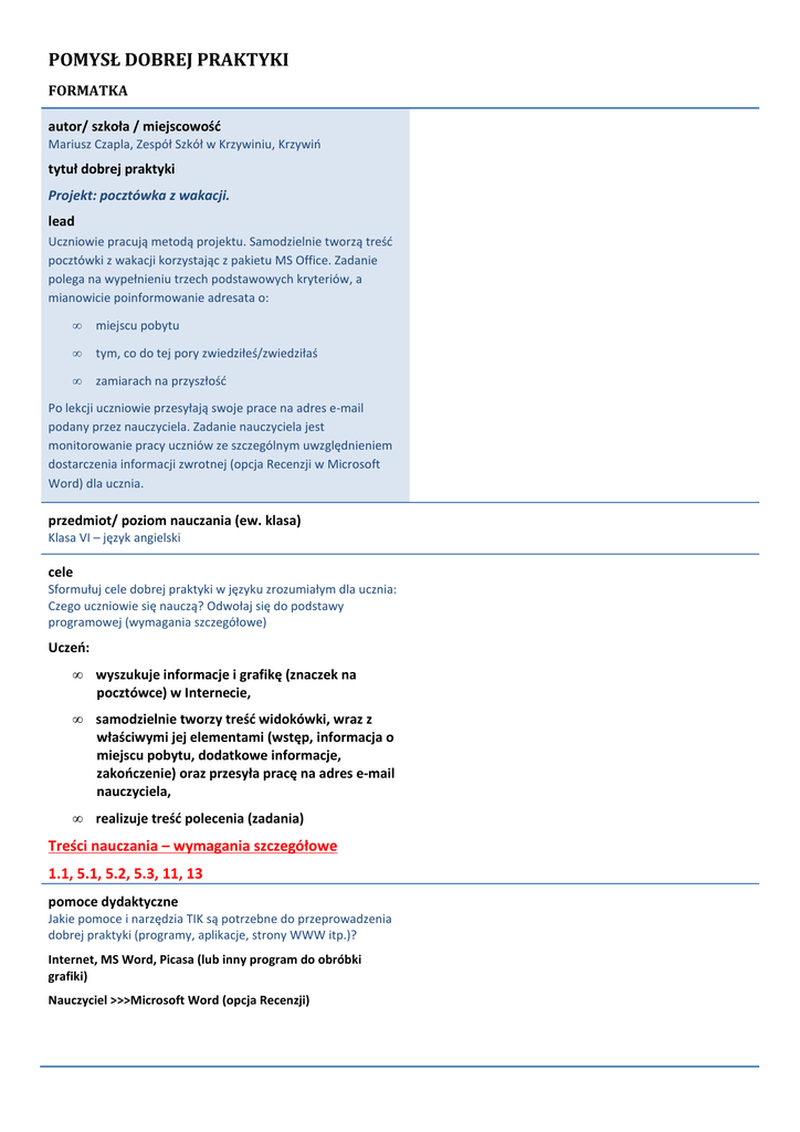 POMYSŁ DOBREJ PRAKTYKI FORMATKA autor/ szkoła / miejscowość Mariusz Czapla, Zespół Szkół w Krzywiniu, Krzywiń tytuł dobrej praktyki Projekt: pocztówka z wakacji. lead Uczniowie pracują metodą projektu. Samodzielnie tworzą treść pocztówki z wakacji korzystając z pakietu MS Office. Zadanie polega na wypełnieniu trzech podstawowych kryteriów, a mianowicie poinformowanie adresata o: • miejscu pobytu • tym, co do tej pory zwiedziłeś/zwiedziłaś • zamiarach na przyszłość Po lekcji uczniowie przesyłają swoje prace na adres e-mail podany przez nauczyciela. Zadanie nauczyciela jest monitorowanie pracy uczniów ze szczególnym uwzględnieniem dostarczenia informacji zwrotnej (opcja Recenzji w Microsoft Word) dla ucznia. przedmiot/ poziom nauczania (ew. klasa) Klasa VI – język angielski cele Sformułuj cele dobrej praktyki w języku zrozumiałym dla ucznia: Czego uczniowie się nauczą? Odwołaj się do podstawy programowej (wymagania szczegółowe) Uczeń: • wyszukuje informacje i grafikę (znaczek na pocztówce) w Internecie, • samodzielnie tworzy treść widokówki, wraz z właściwymi jej elementami (wstęp, informacja o miejscu pobytu, dodatkowe informacje, zakończenie) oraz przesyła pracę na adres e-mail nauczyciela, • realizuje treść polecenia (zadania) Treści nauczania – wymagania szczegółowe 1.1, 5.1, 5.2, 5.3, 11, 13 pomoce dydaktyczne Jakie pomoce i narzędzia TIK są potrzebne do przeprowadzenia dobrej praktyki (programy, aplikacje, strony WWW itp.)? Internet, MS Word, Picasa (lub inny program do obróbki grafiki) Nauczyciel >>>Microsoft Word (opcja Recenzji) krótki opis pomysłu Przedstaw zwięźle swój pomysł tak, aby inni nauczyciele i nauczycielki mogli go wykorzystać w swojej pracy Uczniowie tworzą treść pocztówki z wakacji korzystając z pakietu MS Office. Zadanie polega na wypełnieniu trzech podstawowych kryteriów, a mianowicie poinformowanie adresata o: • miejscu pobytu • tym, co do tej pory zwiedziłeś/zwiedziłaś • zamiarach na przyszłość Po lekcji uczniowie przesyłają swoje prace na adres e-mail podany przez nauczyciela. Nauczyciel odsyła prace wraz z informacją zwrotną. efekty pracy Czego uczniowie się nauczyli? Co się sprawdziło? Dlaczego warto w tym przypadku zastosować TIK? Uczniowie: • uczą się w interesujący i zabawny sposób, • podnoszą swoją motywację do nauki, korzystają z gotowych sformułowań z podręcznika i tym samym utrwalają je, • uczniowie utrwalają wiedzę na temat używania modułu sprawdzania pisowni wyrazów • nauczyli się tworzyć krótki tekst użytkowy • mieli możliwość wyszukać i obejrzeć szereg podobnych prac w Internecie • ZOSTALI POINSTRUOWANI O SPOSOBACH SPRAWDZANIA, CZY ICH PRACA NIE ZAWIERA ELEMENTÓW PRACY OSÓB TRZECICH, Z WYKORZYSTANIEM WYSZUKIWARKI INERNETOWEJ uwagi Jakie działania planujesz w przyszłości? Czy zamierzasz zmienić lub rozwinąć swój pomysł? Przed czym chcesz przestrzec naśladowców dobrej praktyki? • Dla niektórych uczniów czas 35 minut przeznaczony na wykonanie treści zadania może okazać się zbyt krótki i należy rozważyć umożliwienie dokończenia zadania po lekcjach lub w domu. • Niektórzy uczniowie mogą nie posiadać adresu e-mail. załączniki Materiały przygotowane przez nauczyciela (np. karty pracy, krzyżówki, quizy) oraz strona WWW, na której znajduje się dobra praktyka (prace uczniów stworzone w jej ramach)