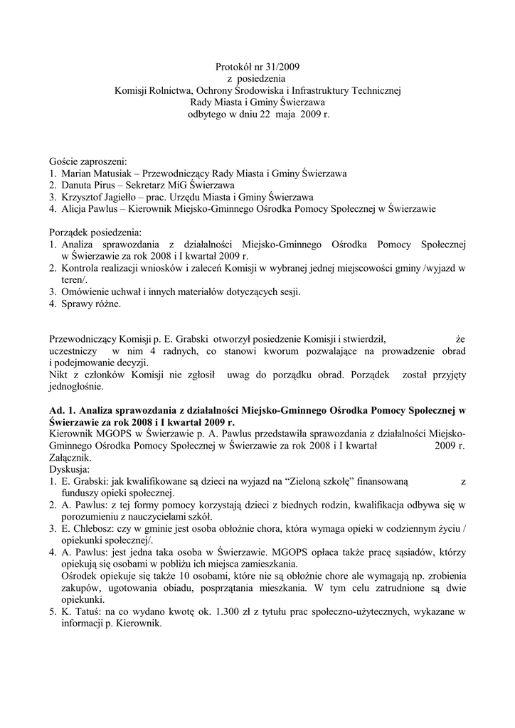 Protokół nr 31/2009 z posiedzenia Komisji Rolnictwa, Ochrony Środowiska i Infrastruktury Technicznej Rady Miasta i Gminy Świerzawa odbytego w dniu 22 maja 2009 r. Goście zaproszeni: 1. Marian Matusiak – Przewodniczący Rady Miasta i Gminy Świerzawa 2. Danuta Pirus – Sekretarz MiG Świerzawa 3. Krzysztof Jagiełło – prac. Urzędu Miasta i Gminy Świerzawa 4. Alicja Pawlus – Kierownik Miejsko-Gminnego Ośrodka Pomocy Społecznej w Świerzawie Porządek posiedzenia: 1. Analiza sprawozdania z działalności Miejsko-Gminnego Ośrodka Pomocy Społecznej w Świerzawie za rok 2008 i I kwartał 2009 r. 2. Kontrola realizacji wniosków i zaleceń Komisji w wybranej jednej miejscowości gminy /wyjazd w teren/. 3. Omówienie uchwał i innych materiałów dotyczących sesji. 4. Sprawy różne. Przewodniczący Komisji p. E. Grabski otworzył posiedzenie Komisji i stwierdził, że uczestniczy w nim 4 radnych, co stanowi kworum pozwalające na prowadzenie obrad i podejmowanie decyzji. Nikt z członków Komisji nie zgłosił uwag do porządku obrad. Porządek został przyjęty jednogłośnie. Ad. 1. Analiza sprawozdania z działalności Miejsko-Gminnego Ośrodka Pomocy Społecznej w Świerzawie za rok 2008 i I kwartał 2009 r. Kierownik MGOPS w Świerzawie p. A. Pawlus przedstawiła sprawozdania z działalności MiejskoGminnego Ośrodka Pomocy Społecznej w Świerzawie za rok 2008 i I kwartał 2009 r. Załącznik. Dyskusja: 1. E. Grabski: jak kwalifikowane są dzieci na wyjazd na “Zieloną szkołę” finansowaną z funduszy opieki społecznej. 2. A. Pawlus: z tej formy pomocy korzystają dzieci z biednych rodzin, kwalifikacja odbywa się w porozumieniu z nauczycielami szkół. 3. E. Chlebosz: czy w gminie jest osoba obłożnie chora, która wymaga opieki w codziennym życiu / opiekunki społecznej/. 4. A. Pawlus: jest jedna taka osoba w Świerzawie. MGOPS opłaca także pracę sąsiadów, którzy opiekują się osobami w pobliżu ich miejsca zamieszkania. Ośrodek opiekuje się także 10 osobami, które nie są obłożnie chore ale wymagają np. zrobienia zakupów, ugotowania obiadu, posprzątania mieszkania. W tym celu zatrudnione są dwie opiekunki. 5. K. Tatuś: na co wydano kwotę ok. 1.300 zł z tytułu prac społeczno-użytecznych, wykazane w informacji p. Kierownik. - 2 6. A. Pawlus: MGOPS otrzymał środki na opłacenie prac społecznie użytecznych. Ponieważ jednak nie zatrudniał takich osób, środki zostały z powrotem przekazane do Urzędu MiG. 7. K. Tatuś: ile osób w 2008 r. było objętych Niebieską Kartą. 8. A. Pawlus: w 2008 r., głównie na wniosek samych zainteresowanych, założono 11 Niebieskich Kart. Wykonywano także dalsze czynności zmierzające do objęcia pomocą osób, które tego wymagały. 9. K. Tatuś: na co została wydana kwota 3 tys. zł przedstawiona w informacji p. Kierownik jako wydatek “dofinansowanie sprzętu piłkarskiego dla dzieci z Klubu Sportowego “Pogoń Trampkarze”. 10.A. Pawlus: za te środki zakupiono sprzęt piłkarski. Dodatkowo gmina przekazała kwotę 3 tys. zł /z funduszy na promocję gminy/ na zakup koszulek z logo gminy dla trampkarzy. 11.K. Tatuś: czy MGOPS jako realizujący projekt “Czas na zmiany” wie, co dzieje się teraz z osobami, które uczestniczyły w projekcie. 12.A. Pawlus: jedna z osób podjęła naukę, pozostałe osoby nie znalazły jeszcze zatrudnienia, jednak poprzez udział w projekcie wyszły z domów, łatwiej nawiązują kontakty z innymi ludźmi. To także był jeden z celów projektu. W roku bieżącym projekt będzie kontynuowany, kwalifikowane będą nowe osoby. 13.K. Tatuś: z jakich powodów umieszczane są osoby w domach pomocy społecznej, ile kosztuje pobyt w takim ośrodku. 14.A. Pawlus: najczęściej są to osoby samotne, jest też jedno dziecko porzucone przez matkę, wymagające całodobowej opieki. Nie ma ono żadnej rodziny, w związku z czym, na mocy wyroku sądowego dziecko to zostało umieszczone w domu opieki społecznej. Miesięczny koszt pobytu w takiej placówce wynosi ok. 2 tys. złotych. 15.K. Tatuś: jaki jest koszt wynajmu sali gimnastycznej dla dzieci objętych pomocą społeczną. 16.A. Pawlus: jeszcze nie opłacano wynajmu sali. Zgodnie z umową z dyrektorem ZSZP w Świerzawie, MGOPS płaci tylko za te godziny, w których dzieci korzystają z sali. 17.K. Tatuś: kiedy będzie wyposażony plac zabaw w Sokołowcu i za jaką kwotę. Wszystko jest juz przygotowane do montażu urządzeń. 18.E. Chlebosz: sołtys, radny lub mieszkańcy powinni wystąpić w tej sprawie z pismem do Kierownika MGOPS. 19.K. Tatuś: już dwa lata temu mówiono na Komisji o potrzebie wyposażenia placu zabaw w Sokołowcu. Poprzednia p. Kierownik MGOPS była na miejscu, zaakceptowała zaproponowane miejsce placu zabaw i do tej pory nic się nie dzieje. 20.A. Pawlus: prosi w tej sprawie o pismo z Sokołowca. Można byłoby zastosować także i takie wyjście, że kwotę zaplanowaną na ten cel podzielić na wszystkie wsie i dla każdej wsi zakupić jakieś urządzenie na plac zabaw. Lepiej jednak chyba jest wyposażyć jeden plac w roku, ale dobrze. 21.E. Grabski i pozostali członkowie Komisji: lepiej wyposażyć tylko jeden plac zabaw ale dobrze, w odpowiednią ilość urządzeń. Ad. 2. Kontrola realizacji wniosków i zaleceń Komisji w wybranej jednej miejscowości gminy /wyjazd w teren/. Komisja wyjechała do Sokołowca w celu skontrolowania sposobu realizacji wniosków Komisji przesłanych do Burmistrza Miasta Gminy w dniu 20 maja 2008 r. Wnioski wskazywały na potrzebę remontów dróg gminnych, w tym m.in. remontu drogi gminnej w Sokołowcu – w kierunku cmentarza i drogi k. Kopcia w Sokołowcu. Po wizji w terenie Komisja stwierdziła, że drogę do cmentarza w Sokołowcu naprawiono tylko częściowo, w dwóch miejscach, natomiast remontu drogi k.Kopcia nie wykonano wcale. Po analizie stopnia realizacji wszystkich zgłoszonych wniosków Komisja stwierdza, że do dnia kontroli nie wykonano 