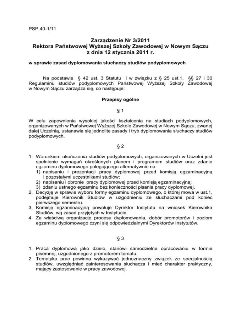 PSP.40-1/11 Zarządzenie Nr 3/2011 Rektora Państwowej Wyższej Szkoły Zawodowej w Nowym Sączu z dnia 12 stycznia 2011 r. w sprawie zasad dyplomowania słuchaczy studiów podyplomowych Na podstawie § 42 ust. 3 Statutu i w związku z § 25 ust.1, §§ 27 i 30 Regulaminu studiów podyplomowych Państwowej Wyższej Szkoły Zawodowej w Nowym Sączu zarządza się, co następuje: Przepisy ogólne §1 W celu zapewnienia wysokiej jakości kształcenia na studiach podyplomowych, organizowanych w Państwowej Wyższej Szkole Zawodowej w Nowym Sączu, zwanej dalej Uczelnią, ustanawia się jednolite zasady i tryb dyplomowania słuchaczy studiów podyplomowych. §2 1. Warunkiem ukończenia studiów podyplomowych, organizowanych w Uczelni jest spełnienie wymagań określonych planem i programem studiów oraz zdanie egzaminu dyplomowego polegającego alternatywnie na: 1) napisaniu i prezentacji pracy dyplomowej przed komisją egzaminacyjną i pozostałymi uczestnikami studiów; 2) napisaniu i obronie pracy dyplomowej przed komisją egzaminacyjną; 3) zdaniu ustnego egzaminu bez konieczności pisania pracy dyplomowej. 2. Decyzję w sprawie wyboru formy egzaminu dyplomowego, o której mowa w ust.1, podejmuje Kierownik Studiów w uzgodnieniu ze słuchaczami pod koniec pierwszego semestru. 3. Komisję egzaminacyjną powołuje Dyrektor Instytutu na wniosek Kierownika Studiów, wg zasad przyjętych w Instytucie. 4. Za właściwą organizację procesu dyplomowania, dobór promotorów i poziom egzaminu dyplomowego czyni się odpowiedzialnymi Dyrektorów Instytutów. §3 1. Praca dyplomowa jako dzieło, stanowi samodzielne opracowanie w formie pisemnej, uzgodnionego z promotorem tematu. 2. Tematyka prac powinna wykazywać jednoznaczny związek ze specjalnością studiów, uwzględniać zainteresowania słuchacza i mieć charakter praktyczny, mający zastosowanie w pracy zawodowej. 3. Praca powinna stanowić dowód na to, że dyplomant opanował podstawową wiedzę z zakresu specjalności studiów oraz nabył niezbędne umiejętności do wykorzystania tej wiedzy w praktyce. 4. Praca dyplomowa stanowi własność słuchacza. Wybór tematu pracy dyplomowej §4 1. Na początku drugiego lub trzeciego semestru wszyscy nauczyciele akademiccy, prowadzący zajęcia, mogą zgłaszać Kierownikowi Studiów tematy prac dyplomowych z zakresu przedmiotów nauczania przez siebie realizowanych. 2. Słuchacze mogą również zgłaszać propozycje własnych tematów prac dyplomowych. 3. Ostateczny wykaz tematów prac dyplomowych, na wniosek Kierownika Studiów, zatwierdza Dyrektor Instytutu. §5 1. Słuchacz wybierając temat pracy dyplomowej, wybiera tym samym promotora. 2. W szczególnych przypadkach, promotor może odmówić przyjęcia dyplomanta. Sprawy sporne rozstrzyga dyrektor instytutu. Obowiązki promotora i dyplomanta §6 1. Do obowiązków promotora w szczególności należy: 1) określenie tematyki i zakresu pracy dyplomowej; 2) udzielanie regularnych, indywidualnych konsultacji w miejscu i czasie uzgodnionym z dyplomantem; 3) ukierunkowanie sposobu myślenia dyplomanta i pomoc we wszystkich kluczowych sprawach dotyczących stawiania tez, planowania pracy, metodologii zbierania informacji, opracowywania wyników badań itp.; 4) omówienie zasad korzystania z literatury oraz prac osób trzecich i poinformowania o konsekwencjach w przypadku naruszenia praw autorskich; 5) zapoznanie z zasadami prezentacji prac dyplomowych na egzaminie dyplomowym oraz z zasadami zdawania egzaminu dyplomowego; 6) dbałość o terminowe realizowanie przez dyplomanta wszystkich etapów wykonywania pracy; 7) terminowe dokonanie recenzji pracy dyplomanta. 2. Do obowiązków dyplomanta należy: 1) wykonanie pracy dyplomowej zgodnie z tematem; 2) terminowe konsultowanie z promotorem poszczególnych etapów wykonywanej pracy; 3) natychmiastowe zawiadamianie promotora o wszelkich problemach i zmianach w przygotowywanej pracy; 4) w razie dłuższej nieobecności promotora pracy dyplomowej, która mogłaby wpłynąć na opóźnienie terminu złożenia pracy dyplomowej, zwrócenie się do Dyrektora Instytutu o wyznaczenie innego promotora; 5) złożenie pracy dyplomowej w regulaminowym terminie. Struktura pracy dyplomowej §7 1. Praca dyplomowa powinna obejmować od 25 do 35 stron bez uwzględnienia strony tytułowej, spisu treści, bibliografii, aneksów. 2. Praca powinna składać się z następujących części: 1) strona tytułowa (wzór: załącznik Nr 1); 2) spis treści; 3) wstęp – cele pracy, uzasadnienie wyboru tematyki, krótka charakterystyka zawartości merytorycznej pracy w poszczególnych rozdziałach, opis problemów występujących przy pisaniu pracy; 4) rozdział I – podbudowa teoretyczna realizowanego tematu, w której słuchacz powinien wykazać się wiedzą merytoryczną, wynikającą z literatury przedmiotu, stanowiącą podstawę do opracowania części praktycznej; 5) rozdział II – część praktyczna pracy (opis rozwiązania konkretnego problemu mającego zastosowanie w praktyce; projekty zmian, diagnozy, ewaluacje w zakresie wybranego obszaru funkcjonowania instytucji, firmy, szkoły, przedszkola, analizy studium przypadku); 6) rozdział III – podsumowanie pracy: własne refleksje, wnioski dotyczące tematu dyplomowania, przydatność pracy i studiów w pracy zawodowej; 7) bibliografia – spis wykorzystanej literatury w układzie alfabetycznym w następującej kolejności: a) nazwisko autora, b) pierwsze litery imion, c) tytuł, d) wydawnictwo, e) miejsce i rok wydania, oraz spis wykorzystanych aktów prawnych; 8) aneks – wzory narzędzi badawczych, spisy tabel, wykresów itp. Wymagania edytorskie §8 1. Praca powinna być napisana jednostronnie, czcionką podstawową dla tekstu pracy w języku polskim: Times New Roman. 2. Ustala się rozmiar czcionki: 1) 12 pkt dla tekstu podstawowego; 2) 11 pkt dla podpisów i opisów rysunków, tabel, wykazów; 3) 10 pkt dla przypisów, numeracji stron. 3. Inne wymogi ok