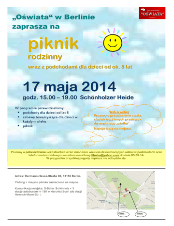 „Oświata“ w Berlinie zaprasza na piknik rodzinny w wrraazz zz p pood dcchhood daam mii d dllaa d dzziieeccii ood d ookk.. 88 llaatt 17 maja 2014 godz. 15.00 – 19.00 Schönholzer Heide W programie przewidzieliśmy: podchody dla dzieci od lat 8 zabawy towarzyszące dla dzieci w każdym wieku piknik W Wssttęęp pw woollnnyy PPrroossiim myy oo pprrzzyynniieessiieenniiee cciiaassttaa,, cciiaasstteekk bbąąddźź iinnnnyycchh pprrzzeekkąąsseekk ddoo w wssppóóllnneeggoo „„uużżyyttkkuu““ N Naappoojjee bbąąddąą nnaa m miieejjssccuu.. Prosimy o potwierdzenie uczestnictwa wraz imionami i wiekiem dzieci biorących udział w podchodach oraz telefonem kontaktowym na adres e-mailowy [email protected] do dnia 05.05.14. W przypadku brzydkiej pogody impreza nie odbędzie się. m Adres: Hermann-Hesse-Straße 80, 13156 Berlin. Parking + miejsce pikniku zaznaczone na mapce. Komunikacja miejska: S-Bahn: Schönholz + 3 stacje autobusem nr 150 w kierunku Buch (do stacji Heinrich-Mann-Str. ) piknik parking