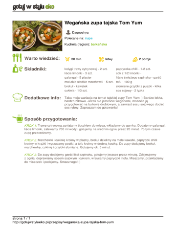 Wegańska zupa tajska Tom Yum Dagooshya Polecane na: zupa Kuchnia (region): bałkańska Warto wiedzieć: 30 min. łatwy 2 porcje Składniki: łodygi trawy cytrynowej - 2 szt. liście limonki - 3 szt. galangal - 5 plaster malutkie słodkie marchewki - 5 szt. brokuł - kawałek cukinia - 1/3 szt. Dodatkowe info: Taka moja wariacja na temat tajskiej zupy Tom Yum :) Bardzo lekka, bardzo zdrowa. Jeżeli nie jesteście weganami, możecie ją przygotować na bulionie drobiowym, a zamiast sosu sojowego dodać sos rybny. Zapraszam do gotowania! papryczka chilli - 1-2 szt. sok z 1/2 limonki liście świeżego szpinaku - garść tofu - 100 g słomiane grzybki z puszki - kilka sos sojowy - 2 łyżka Sposób przygotowania: KROK 1: Trawę cytrynową zgniatamy tłuczkiem do mięsa, wkładamy do garnka. Dodajemy galangal, liście limonki, zalewamy 700 ml wody i gotujemy na średnim ogniu przez 20 minut. Po tym czasie zupę przecedzamy. KROK 2: Marchewki i cukinię kroimy w plastry, brokuł dzielimy na małe kawałki, papryczki chilli kroimy w krążki i wyrzucamy pestki, a tofu kroimy w drobną kostkę. Do zupy dodajemy brokuł, marchewkę, cukinię i grzybki słomiane. Gotujemy ok. 5 minut. KROK 3: Do zupy dodajemy garść liści szpinaku, gotujemy jeszcze przez minutę. Zdejmujemy z ognia, doprawiamy sosem sojowym i cukrem, wrzucamy papryczki i tofu. Mieszamy, przekładamy do miseczek i podajemy. Smacznego! :) strona 1 / 1 http://gotujwstylueko.pl/przepisy/weganska-zupa-tajska-tom-yum Powered by TCPDF (www.tcpdf.org)