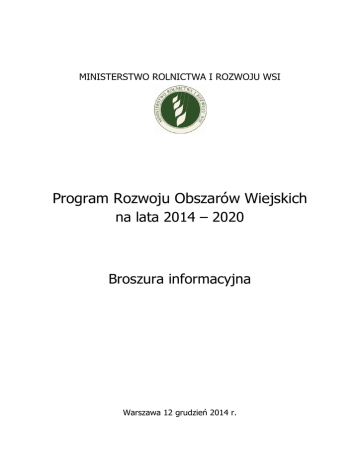 MINISTERSTWO ROLNICTWA I ROZWOJU WSI Program Rozwoju Obszarów Wiejskich na lata 2014 – 2020 Broszura informacyjna Warszawa 12 grudzień 2014 r. Spis treści WSTĘP...................................................................................................................................................... 1 I. Transfer wiedzy i działalność informacyjna ..................................................................................... 1 II. Usługi doradcze, usługi z zakresu zarządzania gospodarstwem rolnym i usługi z zakresu zastępstw ................................................................................................................................................. 2 III. Systemy jakości produktów rolnych i środków spożywczych ......................................................... 3 IV. Inwestycje w środki trwałe .............................................................................................................. 4 V. Przywracanie potencjału produkcji rolnej zniszczonego w wyniku klęsk żywiołowych i katastrof oraz wprowadzanie odpowiednich działań zapobiegawczych ................................................................ 8 VI. Rozwój gospodarstw i działalności gospodarczej .......................................................................... 10 VII. Podstawowe usługi i odnowa miejscowości na obszarach wiejskich ............................................ 14 VIII. Zalesianie i tworzenie terenu zalesionego .................................................................................... 16 IX. Tworzenie grup i organizacji producentów ................................................................................... 17 X. Działanie rolnośrodowiskowo‐klimatyczne ................................................................................... 17 XI. Rolnictwo ekologiczne ................................................................................................................... 19 XII. Płatności dla obszarów z ograniczeniami naturalnymi lub innymi szczególnymi ograniczeniami (ONW) .................................................................................................................................................... 20 XIII. Współpraca .................................................................................................................................... 21 XIV. LEADER .......................................................................................................................................... 22 Plan finansowy dla PROW 2014‐2020 (wg działań, poddziałań) ........................................................... 25 WSTĘP Głównym celem Programu Rozwoju Obszarów Wiejskich na lata 2014-2020 (PROW 2014-2020) będzie wzrost konkurencyjności rolnictwa z uwzględnieniem celów środowiskowych. PROW 2014 – 2020 będzie realizował wszystkie sześć priorytetów wyznaczonych dla unijnej polityki rozwoju obszarów wiejskich na lata 2014 – 2020. 1. Ułatwianie transferu wiedzy i innowacji w rolnictwie i leśnictwie oraz na obszarach wiejskich. 2. Zwiększenie rentowności gospodarstw i konkurencyjności wszystkich rodzajów rolnictwa we wszystkich regionach oraz promowanie innowacyjnych technologii w gospodarstwach i zrównoważonego zarządzania lasami. 3. Wspieranie organizacji łańcucha żywnościowego, w tym przetwarzania i wprowadzania do obrotu produktów rolnych, dobrostanu zwierząt oraz zarządzania ryzykiem w rolnictwie. 4. Odtwarzanie, ochrona i wzbogacanie ekosystemów związanych z rolnictwem i leśnictwem. 5. Promowanie efektywnego gospodarowania zasobami i wspieranie przechodzenia w sektorach rolnym, spożywczym i leśnym na gospodarkę niskoemisyjną i odporną na zmianę klimatu. 6. Promowanie włączenia społecznego, zmniejszania ubóstwa oraz rozwoju gospodarczego na obszarach wiejskich. Łączne środki publiczne przeznaczone na realizację Programu Rozwoju Obszarów Wiejskich na lata 2014-2020 wyniosą 13 513 295 000 euro z czego: • • 8 598 280 814 euro będą to środki UE (EFRROW), 4 915 014 186 euro wyniesie wkład krajowy. W ramach PROW 2014-2020 realizowane będą następujące działania i poddziałania. I. Transfer wiedzy i działalność informacyjna Poddziałania 1. Wsparcie kształcenia zawodowego i nabywania umiejętności. 2. Wsparcie na demonstracje i działania informacyjne. Zakres: 1 - - szkolenia ukierunkowane na rozwój wiedzy i umiejętności zawodowych rolników, właścicieli lasów, w zakresie związanym z prowadzeniem działalności rolniczej i związanej z rolnictwem oraz leśnictwem; demonstracje służące upowszechnianiu innowacji i dobrych praktyk w zakresie produkcji rolnej lub leśnej lub przetwórstwa rolno-spożywczego. Beneficjent: − jednostki naukowe i uczelnie, − publiczne podmioty doradcze rolniczego, izby rolnicze), (CDR, wojewódzkie ośrodki doradztwa − szkoły rolnicze lub szkoły leśne, lub centra kształcenia ustawicznego, lub centra kształcenia praktycznego prowadzone przez JST lub organy administracji rządowej, − inne podmioty prowadzące działalność szkoleniową, − konsorcja tworzone przez ww. podmioty. Wsparcie: − 100% kosztów kwalifikowalnych operacji. II. Usługi doradcze, usługi z zakresu zarządzania gospodarstwem rolnym i usługi z zakresu zastępstw Poddziałania 1. Wsparcie dla korzystających z usług doradczych. Zakres: − świadczenie kompleksowej porady dla rolnika, − świadczenie kompleksowej porady dla właściciela lasu. 2. Wsparcie na szkolenia doradców. Poddziałanie 1 - Wsparcie dla korzystających z usług doradczych. Wsparcie: 100 % kosztów kwalifikowalnych operacji i nie więcej niż: − równowartość 1 500 euro za poradę – opracowanie i zrealizowanie 3-letniego programu doradczego dla rolnika / grupy rolników, − równowartość 1 050 euro za poradę – opracowanie i zrealizowanie 2-letniego programu doradczego dla rolnika / grupy
