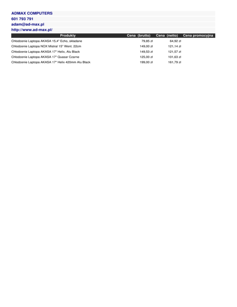 ADMAX COMPUTERS 601 793 791 [email protected] http://www.ad-max.pl/ Produkty Cena (brutto) Cena (netto) Chłodzenie Laptopa AKASA 15,4" Echo, składane 79,85 zł 64,92 zł Chłodzenie Laptopa NOX Mistral 15" Went. 22cm 149,00 zł 121,14 zł Chłodzenie Laptopa AKASA 17" Helix, Alu Black 149,53 zł 121,57 zł Chłodzenie Laptopa AKASA 17" Quasar Czarne 125,00 zł 101,63 zł Chłodzenie Laptopa AKASA 17" Helix 420mm Alu Black 199,00 zł 161,79 zł Cena promocyjna