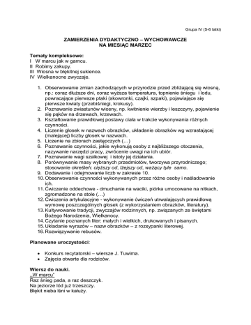 Grupa IV (5-6 latki) ZAMIERZENIA DYDAKTYCZNO – WYCHOWAWCZE NA MIESIĄC MARZEC Tematy kompleksowe: I W marcu jak w garncu. II Robimy zakupy. III Wiosna w błękitnej sukience. IV Wielkanocne zwyczaje. 1. Obserwowanie zmian zachodzących w przyrodzie przed zbliżającą się wiosną, np.: coraz dłuższe dni, coraz wyższa temperatura, topnienie śniegu i lodu, powracające pierwsze ptaki (skowronki, czajki, szpaki), pojawiające się pierwsze kwiaty (przebiśniegi, krokusy). 2. Poznawanie zwiastunów wiosny, np. kwitnienie wierzby i leszczyny, pojawienie się pąków na drzewach, krzewach. 3. Kształtowanie prawidłowej postawy ciała w trakcie wykonywania różnych czynności. 4. Liczenie głosek w nazwach obrazków, układanie obrazków wg wzrastającej (malejącej) liczby głosek w nazwach. 5. Liczenie na zbiorach zastępczych (…) 6. Poznawanie czynności, jakie wykonują osoby z najbliższego otoczenia, nazywanie narzędzi pracy, zwrócenie uwagi na ich ubiór. 7. Poznawanie wagi szalkowej i istoty jej działania. 8. Porównywanie masy wybranych przedmiotów, tworzywa przyrodniczego; stosowanie określeń: cięższy od, lżejszy od, ważący tyle samo. 9. Dodawanie i odejmowanie liczb w zakresie 10. 10. Obserwowanie czynności wykonywanych przez różne osoby i naśladowanie ich. 11. Ćwiczenie oddechowe - dmuchanie na waciki, piórka umocowane na nitkach, zgromadzone na stole (…) 12. Ćwiczenia artykulacyjne - wykonywanie ćwiczeń utrwalających prawidłową wymowę poszczególnych głosek (z wykorzystaniem obrazków, literatury). 13. Kultywowanie tradycji, zwyczajów rodzinnych, np. związanych ze świętami Bożego Narodzenia, Wielkanocy. 14. Czytanie poznanych liter: małych i wielkich, drukowanych i pisanych. 15. Układanie wyrazów – nazw obrazków – z rozsypanki literowej. 16. Rozwiązywanie rebusów. Planowane uroczystości: Konkurs recytatorski – wiersze J. Tuwima. Zajęcia otwarte dla rodziców. Wiersz do nauki. ,,W marcu” Raz śnieg pada, a raz deszczyk. Na jeziorze lód już trzeszczy. Błękit nieba lśni w kałuży. Bałwan w słońcu oczy mruży. Koniec zimy! Przerwa. Dzwonek. To nie dzwonek. To skowronek. Piosenka do nauki. ,,Zbudź się rzeczko” Była rzeczka, nie ma rzeczki skryła się pod lodem ale marzec, ciepły marzec zbudził śpiącą wodę Ref. Zbudź się rzeczko, zbudź się rzeczko obudź swoje fale otwórz oczy swe niebieskie płyń przed siebie dalej Wiatr przefrunie, wiatr przebiegnie znad zielonej łąki i przyniesie liść zielony i kwiatowe pąki. Ref. Zbudź się rzeczko… I przybiegną latem dzieci z bosymi nogami wejdą w wodę przezroczystą baw się rzeczko z nami. Ref. Zbudź się rzeczko…