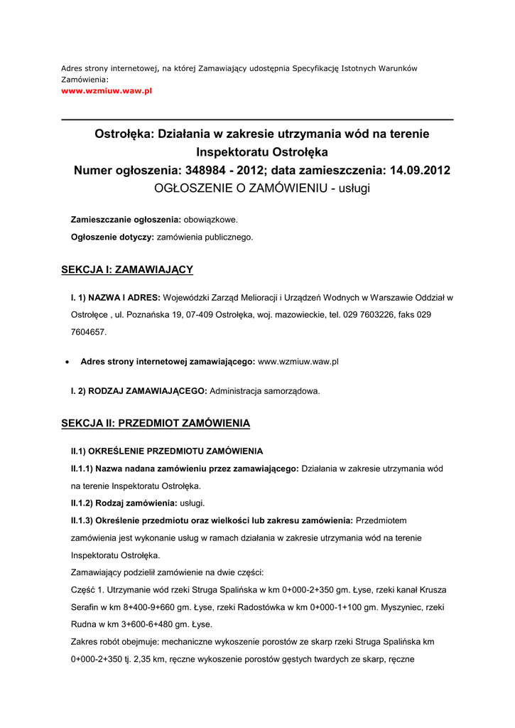 Adres strony internetowej, na której Zamawiający udostępnia Specyfikację Istotnych Warunków Zamówienia: www.wzmiuw.waw.pl Ostrołęka: Działania w zakresie utrzymania wód na terenie Inspektoratu Ostrołęka Numer ogłoszenia: 348984 - 2012; data zamieszczenia: 14.09.2012 OGŁOSZENIE O ZAMÓWIENIU - usługi Zamieszczanie ogłoszenia: obowiązkowe. Ogłoszenie dotyczy: zamówienia publicznego. SEKCJA I: ZAMAWIAJĄCY I. 1) NAZWA I ADRES: Wojewódzki Zarząd Melioracji i Urządzeń Wodnych w Warszawie Oddział w Ostrołęce , ul. Poznańska 19, 07-409 Ostrołęka, woj. mazowieckie, tel. 029 7603226, faks 029 7604657. Adres strony internetowej zamawiającego: www.wzmiuw.waw.pl I. 2) RODZAJ ZAMAWIAJĄCEGO: Administracja samorządowa. SEKCJA II: PRZEDMIOT ZAMÓWIENIA II.1) OKREŚLENIE PRZEDMIOTU ZAMÓWIENIA II.1.1) Nazwa nadana zamówieniu przez zamawiającego: Działania w zakresie utrzymania wód na terenie Inspektoratu Ostrołęka. II.1.2) Rodzaj zamówienia: usługi. II.1.3) Określenie przedmiotu oraz wielkości lub zakresu zamówienia: Przedmiotem zamówienia jest wykonanie usług w ramach działania w zakresie utrzymania wód na terenie Inspektoratu Ostrołęka. Zamawiający podzielił zamówienie na dwie części: Część 1. Utrzymanie wód rzeki Struga Spalińska w km 0+000-2+350 gm. Łyse, rzeki kanał Krusza Serafin w km 8+400-9+660 gm. Łyse, rzeki Radostówka w km 0+000-1+100 gm. Myszyniec, rzeki Rudna w km 3+600-6+480 gm. Łyse. Zakres robót obejmuje: mechaniczne wykoszenie porostów ze skarp rzeki Struga Spalińska km 0+000-2+350 tj. 2,35 km, ręczne wykoszenie porostów gęstych twardych ze skarp, ręczne wykoszenie porostów z dna, wygrabienie wykoszonych porostów, wycinka zakrzaczeń, mechaniczne wykoszenie porostów ze skarp rzeki Kanał Krusza Serafin km 8+400-9+660 tj. 1,26 km, ręczne wykoszenie porostów gęstych twardych ze skarp, ręczne wykoszenie porostów z dna, wygrabienie wykoszonych porostów, usunięcie przetamowań z koryta cieku, mechaniczne wykoszenie porostów ze skarp rzeki Rudna km 3+600-6+480 tj. 2,88 km, ręczne wykoszenie porostów gęstych twardych ze skarp, wygrabienie wykoszonych porostów, odmulenie dna rzeki warstwą 30 cm, rozplantowanie urobku z odmulenia, ręczne wykoszenie porostów gęstych twardych ze skarp rzeki Radostówka km 0+000-1+100 tj. 1,10 km, ręczne wykoszenie porostów z dna, wygrabienie wykoszonych porostów. Część 2. Utrzymanie wód rzeki Kanał A Obierwia w km 0+000-8+560 gm. Lelis, Kadzidło. Zakres robót obejmuje: mechaniczne wykoszenie porostów ze skarp, ręczne wykoszenie i wygrabienie porostów gęstych twardych ze skarp, ręczna wycinka zakrzaczeń ze skarp i dna, usunięcie przetamowań, wydobycie z dna cieku roślin korzeniących się przy zarośnięciu lustra wody do 30%, ręczne wykaszanie porostów z dna wraz z wygrabieniem. Szczegółowy opis poszczególnych części zamówienia i zakres robót związanych z ich realizacją z podaniem lokalizacji (kilometrażu cieków) został przedstawiony w uproszczonej dokumentacji projektowej składającej się z wytycznych wykonania i odbioru robót w zakresie konserwacji rzek i kanałów oraz przedmiarów robót (załącznik nr 2 do SIWZ).. II.1.4) Czy przewiduje się udzielenie zamówień uzupełniających: nie. II.1.5) Wspólny Słownik Zamówień (CPV): 90.72.18.00-5. II.1.6) Czy dopuszcza się złożenie oferty częściowej: tak, liczba części: 2. II.1.7) Czy dopuszcza się złożenie oferty wariantowej: nie. II.2) CZAS TRWANIA ZAMÓWIENIA LUB TERMIN WYKONANIA: . SEKCJA III: INFORMACJE O CHARAKTERZE PRAWNYM, EKONOMICZNYM, FINANSOWYM I TECHNICZNYM III.1) WADIUM Informacja na temat wadium: Zamawiający nie wymaga wniesienia wadium III.2) ZALICZKI Czy przewiduje się udzielenie zaliczek na poczet wykonania zamówienia: nie III.3) WARUNKI UDZIAŁU W POSTĘPOWANIU ORAZ OPIS SPOSOBU DOKONYWANIA OCENY SPEŁNIANIA TYCH WARUNKÓW III.3.2) Wiedza i doświadczenie Opis sposobu dokonywania oceny spełniania tego warunku o Zamawiający uzna warunek za spełniony o ile wykonawca wykaże, iż w okresie ostatnich trzech latach przed upływem terminu składania ofert, a jeżeli okres prowadzenia działalności jest krótszy -to w tym okresie wykonał min. 2 konserwację cieku (tj. odmulenie oraz wykoszenie). Warunek wiedzy i doświadczenia oceniony zostanie na podstawie wykazu wykonanych prac z podaniem ich rodzaju i wartości, daty i miejsca wykonania oraz załączeniem dokumentu potwierdzającego, że roboty zostały wykonane zgodnie z zasadami sztuki i prawidłowo ukończone. Na potwierdzenie spełnienia przez Wykonawcę tego warunku należy przedłożyć dokument określony w pkt X 2 SIWZ - form. nr 5 III.3.3) Potencjał techniczny Opis sposobu dokonywania oceny spełniania tego warunku o O zamówienie mogą ubiegać się wykonawcy, których potencjał techniczny pozwoli na prawidłowe i terminowe wykonanie zamówienia. Ocena spełnienia warunku zostanie dokonana na podstawie złożonego oświadczenia zgodnie z form nr 2. do SIWZ. III.3.4) Osoby zdolne do wykonania zamówienia Opis sposobu dokonywania oceny spełniania tego warunku o O zamówienie mogą ubiegać się wykonawcy, których potencjał osobowy pozwoli na prawidłowe i terminowe wykonanie zamówienia. Ocena spełnienia warunku zostanie dokonana na podstawie złożonego oświadczenia zgodnie z form nr 2. do SIWZ. III.3.5) Sytuacja ekonomiczna i finansowa Opis sposobu dokonywania oceny spełniania tego warunku o O zamówienie mogą ubiegać się wykonawcy, których sytuacja ekonomiczna i finansowa pozwoli na prawidłowe i terminowe wykonanie. Ocena spełnienia warunku zostanie dokonana na podstawie złożonego oświadczenia zgodnie z form nr 2. do SIWZ III.4) INFORMACJA O OŚWIADCZENIACH LUB DOKUMENTACH, JAKIE MAJĄ DOSTARCZYĆ WYKONAWCY W CELU POTWIERDZENIA SPEŁNIANIA WARUNKÓW UDZIAŁU W POSTĘPOWANIU ORAZ NIEPODLEGANIA WYKLUCZENIU NA PODSTAWIE ART. 24 UST. 1 USTAWY III.4.1) W zakresie wykazania spełniania