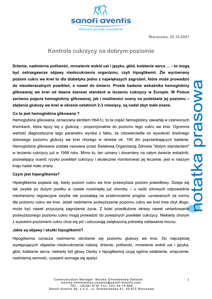 Warszawa, 25.10.2007 Kontrola cukrzycy na dobrym poziomie Drżenie, nadmierna potliwość, mrowienie wokół ust i języka, głód, kołatanie serca … - to mogą być ostrzegawcze objawy niedocukrzenia organizmu, czyli hipoglikemii. Źle wyrównany poziom cukru we krwi to dla diabetyka jedno z największych zagrożeń, które może prowadzić do nieodwracalnych powikłań, a nawet do śmierci. Proste badanie wskaźnika hemoglobiny glikowanej we krwi od dawna stanowi standard w leczeniu cukrzycy w Europie. W Polsce zarówno pojęcie hemoglobiny glikowanej, jak i możliwości oceny na podstawie jej poziomu – stężenia glukozy we krwi w okresie ostatnich 2-3 miesięcy, są nadal zbyt mało znane. Co to jest hemoglobina glikowana ? Hemoglobina glikowana, oznaczana skrótem HbA1c, to ta część hemoglobiny zawartej w czerwonych krwinkach, która łączy się z glukozą - proporcjonalnie do poziomu tego cukru we krwi. Ogromna wartość diagnostyczna tego parametru wynika z faktu, że odzwierciedla on wysokość średniego dobowego poziomu glukozy we krwi chorego w okresie ok. 100 dni poprzedzających badanie. Hemoglobina glikowana została nazwana przez Światową Organizację Zdrowia "złotym standardem" w leczeniu cukrzycy już w 1999 roku. Mimo to, ten uznany i doceniany na całym świecie wskaźnik, pozwalający ocenić ryzyko powikłań cukrzycy i skutecznie monitorować jej leczenie, jest w naszym kraju nadal mało znany . Czym jest hiperglikemia? Hiperglikemia pojawia się, kiedy poziom cukru we krwi przewyższa poziom prawidłowy. Dzieje się tak zwykle po dużym posiłku w czasie rozwiniętej już choroby – u osób zdrowych odpowiednie mechanizmy regulacyjne zwykle nie pozwalają na przekroczenie progów, uznawanych za normy dla poziomu cukru we krwi. Jeżeli nadmierne podwyższenie poziomu cukru we krwi trwa zbyt długo, może być nawet przyczyną zagrożenia życia. Z kolei przedłużone okresy nawet umiarkowanie podwyższonego poziomu cukru mogą prowadzić do poważnych powikłań cukrzycy. Niekiedy chorym z wysokimi poziomami cukru chce się pić i odczuwają zwiększoną potrzebę oddawania moczu. Jakie są objawy i skutki hipoglikemii? Hipoglikemia oznacza nadmierne obniżenie się poziomu glukozy we krwi. Do najczęściej występujących objawów niedocukrzenia należą: drżenie, potliwość, mrowienie wokół ust i języka, głód, kołatanie serca, niekiedy ból głowy Osoby z hipoglikemią czują ogólne osłabienie, zmęczenie, nadmierną senność, czasami wzmaga się apetyt. Communication Manager: Monika Chmielewska-Żehaluk [email protected] T E L . : ( 22) 541 47 53 F A X : ( 2 2 ) 5 4 - 1 4 - 8 8 8 Sanofi-Aventis Sp. z o.o., ul. Domaniewska 41, 02-672 Warszawa 1 Gwałtowne spadki glukozy we krwi mogą prowadzić do nieodwracalnych uszkodzeń mózgu, a nawet do śmierci.. Są to objawy ostrzegawcze. Niestety połowa wszystkich hipoglikemii występuje nocą, gdy chory śpi. 70 % hipoglikemii zdarzających się w nocy to hipoglikemie nieuświadomione. Według światowych standardów poziom HbA1c u chorych na cukrzycę nie powinien przekraczać 7 %. Tymczasem w Polsce u blisko 80 % chorych poziom ten jest znacznie wyższy1. Specjaliści podkreślają, że obniżenie poziomu hemoglobiny glikowanej już o 1 % wiąże się z 5 % redukcją ryzyka udaru mózgu, redukcją ryzyka zgonu o 12 %, a ryzyka amputacji kończyny - aż o 43%. Z kolei źle wyrównana cukrzyca, której oznakami są: zbyt wysoki poziom cukru we krwi na czczo oraz poziom HbA1c powyżej 7 %, może prowadzić do groźnych powikłań, jak utrata wzroku, zawał serca, udar mózgu, uszkodzenie nerek czy amputacje…Potwierdzają to dane statystyczne. 8 na 10 pacjentów chorych na cukrzycę umiera z powodu chorób układu krążenia. Zawał serca występuje u nich cztery razy częściej niż u chorych bez cukrzycy, udar mózgu – 5 razy częściej, a do amputacji stopy dochodzi aż 40 razy częściej. Jak się bronić przed powikłaniami cukrzycy ? Dla utrzymania prawidłowego poziomu HbA1c i zmniejszenia ryzyka powikłań, oprócz systematycznych badań, kluczowe znaczenie ma również odpowiedni tryb życia oraz skuteczna terapia. U chorych wymagających leczenia insuliną optymalnym rozwiązaniem jest terapia odtwarzająca prawidłowe wydzielanie insuliny, oparta na podawaniu krótko działającej insuliny przed posiłkami oraz długo działającego analogu insuliny, naśladującego tak zwane podstawowe wydzielanie insuliny. *** Informacje o firmie Sanofi-Aventis Sanofi-Aventis jest jedną z największych na świecie firm farmaceutycznych. Dysponując ogólnoświatową organizacją badań i rozwoju, firma Sanofi-Aventis zajmuje czołowe pozycje w siedmiu głównych obszarach terapeutycznych: leków stosowanych w chorobach układu krążenia, zakrzepicy, onkologii, chorobach metabolicznych, chorobach ośrodkowego układu nerwowego, chorobach wewnętrznych oraz szczepionek. Firma Sanofi-Aventis jest notowana na giełdach w Paryżu (EURONEXT: SAN) oraz w Nowym Jorku (NYSE: SNY). W Polsce, w wyniku formalnoprawnego połączenia spółek Sanofi-Synthelabo i Aventis Pharma 4 kwietnia 2006 roku, została powołana nowa spółka o nazwie Sanofi-Aventis Sp. z o.o. W wyniku połączenia powstał trzeci co do wielkości koncern farmaceutyczny w Polsce. Firma zatrudnia blisko 900 osób, w tym 180 we własnym zakładzie produkcyjnym, w Rzeszowie. 1 Na podstawie badania PolDiab przeprowadzonego przez Polskie Towarzystwo Diabetologiczne oraz Polskie Stowarzyszenie Diabetyków 13.05.2005 roku. Communication Manager: Monika Chmielewska-Żehaluk 2 [email protected] T E L . : ( 22) 541 47 53 F A X : ( 2 2 ) 5 4 - 1 4 - 8 8 8 Sanofi-Aventis Sp. z o.o., ul. Domaniewska 41, 02-672 Warszawa