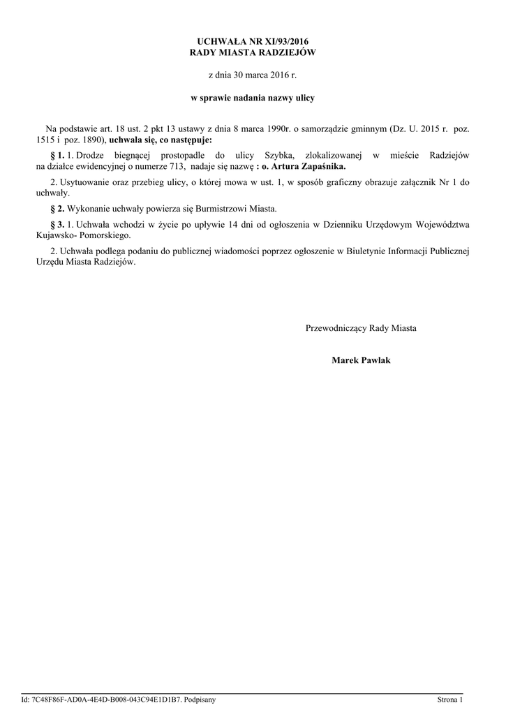 UCHWAŁA NR XI/93/2016 RADY MIASTA RADZIEJÓW z dnia 30 marca 2016 r. w sprawie nadania nazwy ulicy Na podstawie art. 18 ust. 2 pkt 13 ustawy z dnia 8 marca 1990r. o samorządzie gminnym (Dz. U. 2015 r. poz. 1515 i poz. 1890), uchwala się, co następuje: § 1. 1. Drodze biegnącej prostopadle do ulicy Szybka, zlokalizowanej na działce ewidencyjnej o numerze 713, nadaje się nazwę : o. Artura Zapaśnika. w mieście Radziejów 2. Usytuowanie oraz przebieg ulicy, o której mowa w ust. 1, w sposób graficzny obrazuje załącznik Nr 1 do uchwały. § 2. Wykonanie uchwały powierza się Burmistrzowi Miasta. § 3. 1. Uchwała wchodzi w życie po upływie 14 dni od ogłoszenia w Dzienniku Urzędowym Województwa Kujawsko- Pomorskiego. 2. Uchwała podlega podaniu do publicznej wiadomości poprzez ogłoszenie w Biuletynie Informacji Publicznej Urzędu Miasta Radziejów. Przewodniczący Rady Miasta Marek Pawlak Id: 7C48F86F-AD0A-4E4D-B008-043C94E1D1B7. Podpisany Strona 1 Id: 7C48F86F-AD0A-4E4D-B008-043C94E1D1B7. Podpisany Strona 1 UZASADNIENIE Na podstawie art. 18 ust. 2 pkt 13 ustawy z dnia 8 marca 1990r. o samorządzie gminnym (Dz. U. 2015 poz. 1515 i poz. 1890), do wyłącznej właściwości rady gminy należy podejmowanie uchwał w sprawie nazw ulic i placów publicznych. Ze względów porządkowych oraz w celu ułatwienia orientacji w terenie nadaje się nazwę ulicy prostopadle biegnącej do ul. Szybka w Radziejowie zgodnie z załącznikiem graficznym. Rada Miasta na patrona nowej ulicy wybrała postać ojca Artura Zapaśnika. O. Artur Zapaśnik spędził w Radziejowie 25 lat kapłańskiego życia. Po raz pierwszy przybył tu jako młody, 31-letni zakonnik, podejmując pracę rekolekcjonisty, katechety, a także organizatora i inicjatora życia młodzieży. Nauczał religii w szkole podstawowej i liceum. Dzięki niezwykłej umiejętności nawiązywania kontaktów, udało mu się zebrać duże grono młodych osób, silnie związanych z klasztorem. W czasach stalinizmu, gdy Związek Młodzieży Polskiej krystalizował i intensyfikował komunistyczną działalność, o. Artur zaproponował miejscowej młodzieży alternatywną formę spędzania czasu: teatr i piłkę nożną. Niestrudzony w pasji „pozyskiwania” młodych talentów, zakupił nie tylko pierwszą w Radziejowie prawdziwą piłkę, ale i profesjonalną książkę o trenowaniu futbolu i nauczył chłopców zasad gry. Można by rzec, iż w ten sposób stworzył podwaliny pod rozwój radziejowskiego klubu piłkarskiego. Dla zainteresowanych teatrem, organizował przedstawienia (jasełka i rozmaite widowiska), do których samodzielnie wykonywał scenografie. Szczególnie chętnie uczestniczyły w nich dzieci. Był więc też prekursorem miejscowego życia kulturalnego, zdecydowanie przeciwstawnego - z racji repertuaru przedstawień - rozrywkom oferowanym młodzieży przez ówczesne władze. W 1968 roku powrócił do Radziejowa. Pokochał to miasto i stał się częścią jego pejzażu. Ci, którzy znali o. Artura, pamiętają, że z każdym się przywitał, każdego pozdrowił, z każdym porozmawiał i z każdym pożartował. Mimo ciężkiej choroby był niezwykle komunikatywnym, pełnym humoru i werwy człowiekiem. Uwielbiał malarstwo, a życie miasta, jego mieszkańców i widoki utrwalał w licznych obrazach, które rozdawał mniej lub bardziej zaprzyjaźnionym znajomym. I to poświadcza jego bezbrzeżne umiłowanie Radziejowa. Choć nie był „stąd”, często mawiał: „Moim marzeniem jest spocząć na tutejszym cmentarzu. W Niepokalanowie jest jedna mogiła i kto mi tam zapali lampkę? A tu wszyscy mnie znają i pewnie ktoś będzie pamiętał o mnie”. Zmarł w czerwcu 1991 roku. Id: 7C48F86F-AD0A-4E4D-B008-043C94E1D1B7. Podpisany Strona 1