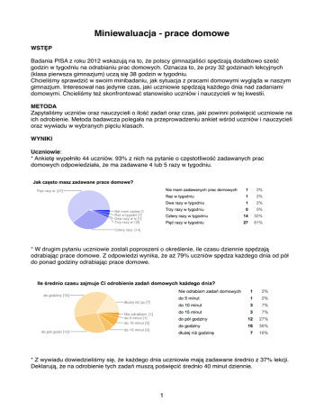 Miniewaluacja - prace domowe WSTĘP Badania PISA z roku 2012 wskazują na to, że polscy gimnazjaliści spędzają dodatkowo sześć godzin w tygodniu na odrabianiu prac domowych. Oznacza to, że przy 32 godzinach lekcyjnych (klasa pierwsza gimnazjum) uczą się 38 godzin w tygodniu. Chcieliśmy sprawdzić w swoim minibadaniu, jak sytuacja z pracami domowymi wygląda w naszym gimnazjum. Interesował nas jedynie czas, jaki uczniowie spędzają każdego dnia nad zadaniami domowymi. Chcieliśmy też skonfrontować stanowisko uczniów i nauczycieli w tej kwestii. METODA Zapytaliśmy uczniów oraz nauczycieli o ilość zadań oraz czas, jaki powinni poświęcić uczniowie na ich odrobienie. Metoda badawcza polegała na przeprowadzeniu ankiet wśród uczniów i nauczycieli oraz wywiadu w wybranych pięciu klasach. WYNIKI Uczniowie: * Ankietę wypełniło 44 uczniów. 93% z nich na pytanie o częstotliwość zadawanych prac domowych odpowiedziała, że ma zadawane 4 lub 5 razy w tygodniu. * W drugim pytaniu uczniowie zostali poproszeni o określenie, ile czasu dziennie spędzają odrabiając prace domowe. Z odpowiedzi wynika, że aż 79% uczniów spędza każdego dnia od pół do ponad godziny odrabiając prace domowe. * Z wywiadu dowiedzieliśmy się, że każdego dnia uczniowie mają zadawane średnio z 37% lekcji. Deklarują, że na odrobienie tych zadań muszą poświęcić średnio 40 minut dziennie. 1 Nauczyciele Ankietę ewaluacyjną wypełniło 15 nauczycieli. Z ich odpowiedzi wynika, że prace domowe zadawane są przez nich średnio na co drugiej godzinie lekcyjnej - 73% odpowiedzi. Według ankietowanych nauczycieli czas jaki uczniowie powinni poświęcić na odrobienie zadanej przez nich pracy domowej waha się między 15 minut a pół godziny (66%). WNIOSKI Uczniowie mają zadawane prace domowe każdego dnia. Jeżeli mają zadane pięć razy w tygodniu, to na odrobienie zadań powinni poświęcić czas również w weekend. Zarówno z ankiet wypełnionych wśród uczniów, jak i z analizy wywiadu przeprowadzonego w pięciu klasach wynika, że uczniowie spędzają w ciągu tygodnia od 2,5 do 5 i więcej godzin nad odrabianiem prac domowych, co daje średnią w tygodniu 3 godz. 20 minut. Z ankiet wypełnionych przez nauczycieli można wyciągnąć wniosek, że uczniowie powinni spędzać więcej czasu nad pracami domowymi. Mnożąc średni współczynnik zadawanych każdego dnia prac domowych (37%) przez czas potrzebny na ich odrobienie (od 15 min. do pół godziny) otrzymujemy wynik między 50 minut do 101 minut. Oznacza to, że przez pięć dni uczniowie powinni spędzić odrabiając prace domowe od 4 godz. 10 minut do 8 godz. 41 minut. Przeprowadzający wywiad dowiedzieliśmy się, że prace domowe zadawane są również w sytuacji, kiedy uczniowie mają kolejnego dnia sprawdzian lub pracę klasową. REKOMENDACJE - dokonać zmian w ZWSO w ten sposób, aby ze wszystkich przedmiotów, których wymiar tygodniowy jest większy niż jedna godzina, nie można było zadawać prac domowych na weekend. - wprowadzić zasadę „nie zadaję pracy domowej na kolejny dzień, jeżeli w tym dniu klasa ma zapowiedziany sprawdzian/pracę klasową” - planując zadania dla uczniów, warto pamiętać o tym, że przygotowują się oni do lekcji, nie tylko odrabiając pisemne prace domowe. Zespół badawczy Magdalena Gazdecka-Goślinowska Lila Kluza-Howil Waldemar Howil 2