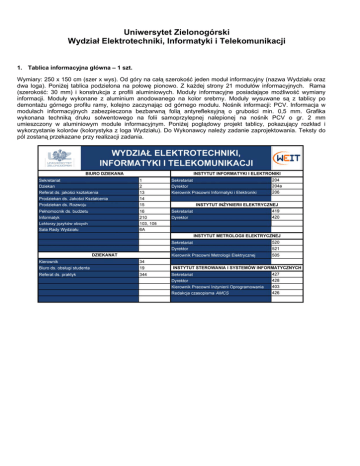 Uniwersytet Zielonogórski Wydział Elektrotechniki, Informatyki i Telekomunikacji 1. Tablica informacyjna główna – 1 szt. Wymiary: 250 x 150 cm (szer x wys). Od góry na całą szerokość jeden moduł informacyjny (nazwa Wydziału oraz dwa loga). Poniżej tablica podzielona na połowę pionowo. Z każdej strony 21 modułów informacyjnych. Rama (szerokość: 30 mm) i konstrukcja z profili aluminiowych. Moduły informacyjne posiadające możliwość wymiany informacji. Moduły wykonane z aluminium anodowanego na kolor srebrny. Moduły wysuwane są z tablicy po demontażu górnego profilu ramy, kolejno zaczynając od górnego modułu. Nośnik informacji: PCV. Informacja w modułach informacyjnych zabezpieczona bezbarwną folią antyrefleksyjną o grubości min. 0,5 mm. Grafika wykonana techniką druku solwentowego na folii samoprzylepnej nalepionej na nośnik PCV o gr. 2 mm umieszczony w aluminiowym module informacyjnym. Poniżej poglądowy projekt tablicy, pokazujący rozkład i wykorzystanie kolorów (kolorystyka z loga Wydziału). Do Wykonawcy należy zadanie zaprojektowania. Teksty do pól zostaną przekazane przy realizacji zadania. 2. Tablice informacyjne dla piętra – Parter (2 szt.) Wymiary: 120 x 150 cm (szer x wys). Trzy różne wysokości modułów informacyjnych. Od góry największy (nazwa Wydziału, logo), następnie numer piętra i kolejno 17 modułów informacyjnych (w sumie 19 modułów o rożnych wysokościach). Rama i konstrukcja z profili aluminiowych; Moduły informacyjne posiadające możliwość wymiany informacji; Moduły wykonane z aluminium anodowanego na kolor srebrny. Moduły wysuwane są z tablicy po demontażu górnego profilu ramy, kolejno zaczynając od górnego modułu. Nośnik informacji: PCV. Informacja w modułach informacyjnych zabezpieczona bezbarwną folią antyrefleksyjną o grubości min. 0,5 mm. Grafika wykonana techniką druku solwentowego na folii samoprzylepnej nalepionej na nośnik PCV o gr. 2 mm umieszczony w aluminiowym module informacyjnym. Poniżej poglądowy projekt tablicy, pokazujący rozkład i wykorzystanie kolorów. Do Wykonawcy należy zadanie zaprojektowania. Teksty i loga do pól zostaną przekazane przy realizacji zadania. 3. Tablice informacyjne dla piętra – I pietro (2 szt.) Wymiary: 120 x 120 cm (szer x wys). Trzy różne wysokości modułów informacyjnych. Od góry największy (nazwa Wydziału, logo), następnie numer piętra i kolejno 11 modułów informacyjnych (w sumie 13 modułów o rożnych wysokościach). Rama i konstrukcja z profili aluminiowych; Moduły informacyjne posiadające możliwość wymiany informacji; Moduły wykonane z aluminium anodowanego na kolor srebrny. Moduły wysuwane są z tablicy po demontażu górnego profilu ramy, kolejno zaczynając od górnego modułu. Nośnik informacji: PCV. Informacja w modułach informacyjnych zabezpieczona bezbarwną folią antyrefleksyjną o grubości min. 0,5 mm. Grafika wykonana techniką druku solwentowego na folii samoprzylepnej nalepionej na nośnik PCV o gr. 2 mm umieszczony w aluminiowym module informacyjnym. Poniżej poglądowy projekt tablicy, pokazujący rozkład i wykorzystanie kolorów. Do Wykonawcy należy zadanie zaprojektowania. Teksty i loga do pól zostaną przekazane przy realizacji zadania. 4. Tablice informacyjne dla piętra – II piętro (2 szt.) Wymiary: 120 x 170 cm (szer x wys). Trzy różne wysokości modułów informacyjnych. Od góry największy (nazwa Wydziału, logo), następnie numer piętra i kolejno 18 modułów informacyjnych (w sumie 20 modułów o rożnych wysokościach). Rama i konstrukcja z profili aluminiowych; Moduły informacyjne posiadające możliwość wymiany informacji; Moduły wykonane z aluminium anodowanego na kolor srebrny; Moduły wysuwane są z tablicy po demontażu górnego profilu ramy, kolejno zaczynając od górnego modułu. Nośnik informacji: PCV. Informacja w modułach informacyjnych zabezpieczona bezbarwną folią antyrefleksyjną o grubości min. 0,5 mm. Grafika wykonana techniką druku solwentowego na folii samoprzylepnej nalepionej na nośnik PCV o gr. 2 mm umieszczony w aluminiowym module informacyjnym. Poniżej poglądowy projekt tablicy, pokazujący rozkład i wykorzystanie kolorów. Do Wykonawcy należy zadanie zaprojektowania. Teksty i loga do pól zostaną przekazane przy realizacji zadania. 5. Tablice informacyjne dla piętra – III piętro (2 szt.) Wymiary: 120 x 130 cm (szer x wys). Trzy różne wysokości modułów informacyjnych. Od góry największy (nazwa Wydziału, logo), następnie numer piętra i kolejno 13 modułów informacyjnych (w sumie 15 modułów o rożnych wysokościach). Rama i konstrukcja z profili aluminiowych; Moduły informacyjne posiadające możliwość wymiany informacji; Moduły wykonane z aluminium anodowanego na kolor srebrny; Moduły wysuwane są z tablicy po demontażu górnego profilu ramy, kolejno zaczynając od górnego modułu. Nośnik informacji: PCV. Informacja w modułach informacyjnych zabezpieczona bezbarwną folią antyrefleksyjną o grubości min. 0,5 mm. Grafika wykonana techniką druku solwentowego na folii samoprzylepnej nalepionej na nośnik PCV o gr. 2 mm umieszczony w aluminiowym module informacyjnym. Poniżej poglądowy projekt tablicy, pokazujący rozkład i wykorzystanie kolorów. Do Wykonawcy należy zadanie zaprojektowania. Teksty i loga do pól zostaną przekazane przy realizacji zadania. 6. Tablice informacyjne dla piętra – IV piętro (2 szt.) Wymiary: 120 x 150 cm (szer x wys). Trzy różne wysokości modułów informacyjnych. Od góry największy (nazwa Wydziału, logo), następnie numer piętra i kolejno 18 modułów informacyjnych (w sumie 20 modułów o rożnych wysokościach). Rama i konstrukcja z profili aluminiowych; Moduły informacyjne posiadające możliwość wymiany informacji; Moduły wykonane z aluminium anodowanego na kolor srebrny; Moduły wysuwane są z tablicy po demontażu górnego profilu ramy, kolejno zaczynając 