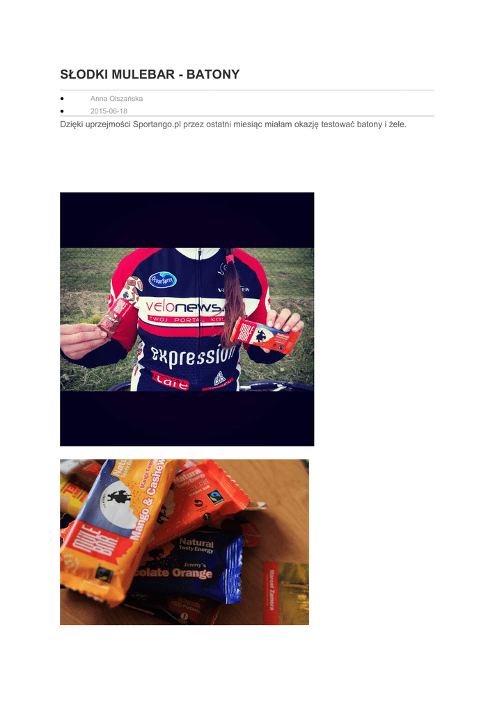SŁODKI MULEBAR - BATONY Anna Olszańska 2015-06-18 Dzięki uprzejmości Sportango.pl przez ostatni miesiąc miałam okazję testować batony i żele. Mule Bar produkowany jest w Wielkiej Brytanii z naturalnych składników wytwarzanych i uprawianych zgodnie z zasadami etyki, od najlepszych światowych producentów. Produkty nie zawierają żadnych składników syntetycznych, konserwantów, oleju palmowego, sztucznych barwników czy dodatków smakowych. Z produktów MuleBar korzystają najlepsi sportowcy na świecie: zwycięzcy Tour de France, uczestnicy Mistrzostw Świata Ultraman, uczestnicy zawodów triatlonowych Ironman, zwycięzcy Pucharu Świata w rugby czy wspinacze wysokogórscy. Z ciekawostek - Mule Bar był na Evereście, przejechał i sponsorował także Absa Cape Epic! (ŹRÓDŁO: http://sportango.pl/) Przedstawiamy pierwszą część testów MuleBar - BATONY Na pierwszy ogień poszedł baton Summer Pudding o smaku malina-żurawina-czarna porzeczka. W składzie faktycznie brak sztuczności. Pierwsze co da się wyczuć to konsystencja – jest nieco bardziej miękki niż poprzednie batony z których korzystałam do tej pory. Na plus, bo przy maratonowym zmęczeniu nie trzeba się tyle wysilać z jedzeniem. Smak nieco kwaskowy, czyli taki jaki jak w rzeczywistości połączenie malin, żurawiny i czarnej porzeczki - maliny zdecydowanie biorą górę. Brak sztucznego posmaku. Możliwe, że nieco zbyt kwaśny, ale o gustach się nie dyskutuje – jednym przeszkodzi, dla innych będzie fajnym „przerywnikiem” od słodkiego izotoniku. Skład: przede wszystkim jabłka, syrop ryżowy, owies – ale też amarantus! Energia – działa tak, jak powinien działać dobry baton energetyczny. Mango Tango Pomimo tego, że nie przepadam za mango, baton był dobry. Idealnie wyważony smak – ani za słodki, ani za kwaśny. Wyczuwalne, duże kawałki owoców – w sam raz na trening, na maratonie mogą sprawiać nieco problemów z pogryzieniem. I baton od kuchni: syrop ryżowy, mango, owies, orzechy nerkowca, amarantus i mąka sojowa. Lubimy! Eastern Express Szczerze mówiąc, to zastanawiałam się na co to komu. Najnowszy wynalazek MuleBar, lekko gryzący w język, z przyprawą Garam Masala. Na pierwszym miejscu jednak orzechy – pistacje, migdały, nerkowce, słonecznik. Spróbowałam – i już wiem, przecież są tacy, którzy nie lubią zaklejających buzię słodkości. Baton w sam raz dla nich, a także dla wszystkich odważnych, nie bojących się eksperymentów. W batonie znajdziemy także czarnuszkę oraz pieprz Cayenne – potrafi wybudzić z uśpienia po 2 godzinach jazdy w tlenie :) Chocolate Orange Baton, który na jednym z treningów uratował mnie przed setną już nienawiścią do roweru z powodu wygłodzenia ;) Obawiałam się połączenia pomarańczy z czekoladą – zraziłam się kiedyś, spodziewałam się sztucznego i drażniącego smaku. Ale się myliłam! Wbrew pozorom nic się nie rozpuściło, pomarańcze były lekko wyczuwalne zza smaku pysznego kakao. Zdecydowanie najlepszy z batonów, gdyby się tylko dało jadłabym go codziennieJ Poza pomarańczą doszukać się można rodzynek, tradycyjnie płatków owsianych. Są też chrupki ryżowe, ciemna czekolada i wspomniane wcześniej kakao. Baton proteinowy Chocolate Date Refuel Nie jest to już ta czekolada co w poprzednim batonie, co nie znaczy że jest zły. Nie udało mi się jeszcze zjeść niedobrego batona proteinowego. Mogłabym się przyczepić do konsystencji – jak na powyścigowe zmęczenie, jego zjedzenie przysporzyło mi trochę wysiłku. Lekki, czekoladowy smak przełamują daktyle i migdały. Jeśli zajrzeć mu „pod fartuch” to są też dropsy czekoladowe (z cukru trzcinowego), kakao. Zawartość białka – ponad 20%. Wkrótce druga część - porównanie żeli energetycznych