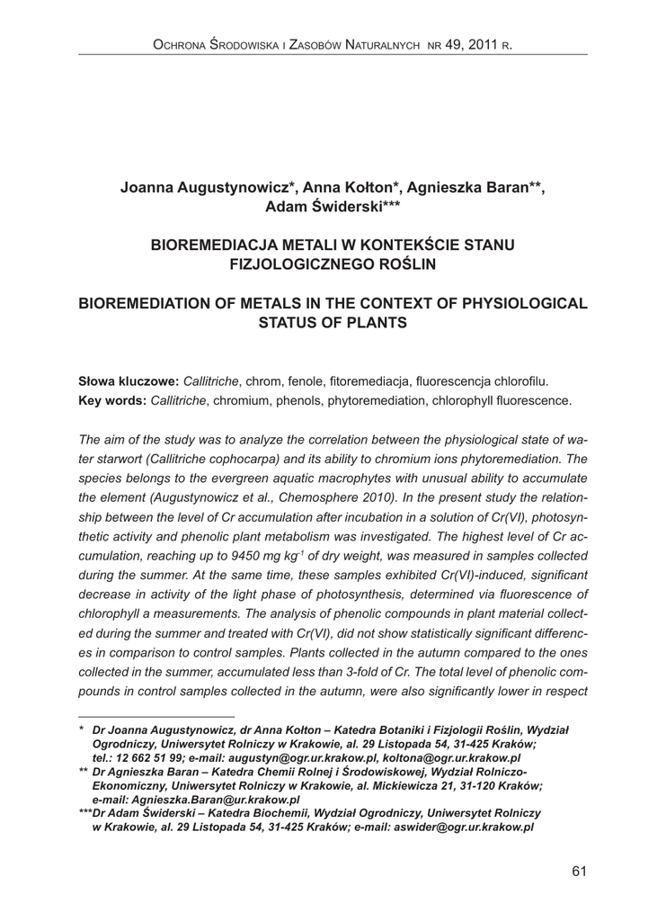 Ochrona Środowiska i Zasobów Naturalnych nr 49, 2011 r. Joanna Augustynowicz*, Anna Kołton*, Agnieszka Baran**, Adam Świderski*** Bioremediacja metali w kontekście stanu fizjologicznego roślin Bioremediation of metals in the context of physiological status of plants Słowa kluczowe: Callitriche, chrom, fenole, fitoremediacja, fluorescencja chlorofilu. Key words: Callitriche, chromium, phenols, phytoremediation, chlorophyll fluorescence. The aim of the study was to analyze the correlation between the physiological state of water starwort (Callitriche cophocarpa) and its ability to chromium ions phytoremediation. The species belongs to the evergreen aquatic macrophytes with unusual ability to accumulate the element (Augustynowicz et al., Chemosphere 2010). In the present study the relationship between the level of Cr accumulation after incubation in a solution of Cr(VI), photosynthetic activity and phenolic plant metabolism was investigated. The highest level of Cr accumulation, reaching up to 9450 mg kg-1 of dry weight, was measured in samples collected during the summer. At the same time, these samples exhibited Cr(VI)-induced, significant decrease in activity of the light phase of photosynthesis, determined via fluorescence of chlorophyll a measurements. The analysis of phenolic compounds in plant material collected during the summer and treated with Cr(VI), did not show statistically significant differences in comparison to control samples. Plants collected in the autumn compared to the ones collected in the summer, accumulated less than 3-fold of Cr. The total level of phenolic compounds in control samples collected in the autumn, were also significantly lower in respect * Dr Joanna Augustynowicz, dr Anna Kołton – Katedra Botaniki i Fizjologii Roślin, Wydział Ogrodniczy, Uniwersytet Rolniczy w Krakowie, al. 29 Listopada 54, 31-425 Kraków; tel.: 12 662 51 99; e-mail: [email protected], [email protected] ** Dr Agnieszka Baran – Katedra Chemii Rolnej i Środowiskowej, Wydział RolniczoEkonomiczny, Uniwersytet Rolniczy w Krakowie, al. Mickiewicza 21, 31-120 Kraków; e-mail: [email protected] ***Dr Adam Świderski – Katedra Biochemii, Wydział Ogrodniczy, Uniwersytet Rolniczy w Krakowie, al. 29 Listopada 54, 31-425 Kraków; e-mail: [email protected] 61 Joanna Augustynowicz i in. to the summer ones. However, plants derived from the autumn season showed significantly high levels of Cr(VI)-induced phenolic compounds. Furthermore, due to detailed HPLC analysis, the highest increase of phenolic compounds in these samples was related to the pool of free flavonoids and their glycosides. Stimulation of the Cr(VI)-induced synthesis of phenols in plants collected in autumn was correlated with high resistance of photosynthetic apparatus to Cr(VI) influence. High, negative correlation between the activity of photosynthetic apparatus and accumulation of the element (r = -0.97) was observed. The role of phenolic compounds in the Cr accumulation by C. cophocarpa is difficult to clearly assess and requires further examination. 1. WPROWADZENIE Metale należą do najbardziej trwałych, migrujących zanieczyszczeń środowiska naturalnego. Zanieczyszczenia związkami chromu stanowią poważny problem środowiskowy na świecie (USA, Indie, Chiny), a na obszarach naszego kraju obejmują uprzemysłowiony Śląsk oraz – bardzo dotkliwie – południową Małopolskę. Z wykorzystaniem naturalnej rudy chromowej syntetyzowanych jest kilkaset różnorodnych związków Cr stosowanych w przemyśle – m.in. w metalurgii, galwanotechnice, garbowaniu skór, produkcji barwników i środków do impregnacji drewna. Polska jest znaczącym europejskim producentem, wykorzystywanych przemysłowo związków Cr. W konsekwencji działalności człowieka do środowiska naturalnego przedostają się często bardzo duże ilości tego pierwiastka. W skali światowej roczna emisja Cr do rzek i mórz wynosi ok. trzydziestu pięciu tysięcy ton, co stanowi 10% jego wydobycia [Kabata-Pendias i Mukherjee 2007, Kabata-Pendias i Pendias 1999]. Cr występuje na kilku stopniach utlenienia, z czego najbardziej stabilne i powszechne są III i VI. Te dwie formy różnią się znacząco własnościami fizykochemicznymi i rolą fizjologiczną. Cr(III) występuje w postaci kationów (np. CrOH2+), jest słabiej rozpuszczalny, ulega łatwemu wytrącaniu i koordynacyjnemu wiązaniu przez organiczne sorbenty gleby i osadów dennych. Cr(III) jest niezbędnym mikroelementem w diecie człowieka, biorącym udział w budowie tzw. czynnika tolerancji glukozy (z ang. Glucose Tolerance Factor – GTF). Cr(VI) ma postać anionów (np. Cr2O72-), jest łatwo rozpuszczalny i słabo sorbowany. Ze względu na wysoki potencjał redox wykazuje niezwykle silne własności utleniające, równo- cześnie ma łatwość do penetracji błon biologicznych. Cr(VI) wywiera kancerogenny wpływ na człowieka i zwierzęta [Kotaś i Stasicka 2000]. Fitoremediacja metali w naturalnych systemach wodnych, oparta na wodnych roślinach naczyniowych (makrofity), jest strategią konkurencyjną w porównaniu z innymi metodami bioremediacyjnymi, wykorzystującymi żywą lub martwą (biosorpcja) biomasę mikroorganizmów pro- i eukariotycznych. Wysoki potencjał fitoremediacyjny makrofitów wodnych, w szczególności występujących w strefach klimatu gorącego, jest w literaturze dobrze udo- 62 Bioremediacja metali w kontekście stanu fizjologicznego roślin kumentowany [Dhote i Dixit 2009]. Jakkolwiek, co należy podkreślić, dane literaturowe dotyczące fitoremediacji Cr, w stosunku do innych metali ciężkich, są stosunkowo ograniczone. Callitriche cophocarpa jest kosmopolitycznym, zimozielonym makrofitem, którego niezwykłe zdolności do akumulacji chromu zostały ostatnio odkryte i opisane przez autorów niniejszej pracy. Zachowując porównywalny z kontrolnymi status fizjologiczny, rośliny badanego gatunku były w stanie zakumulować ponad 1000 mg Cr na kg suche
