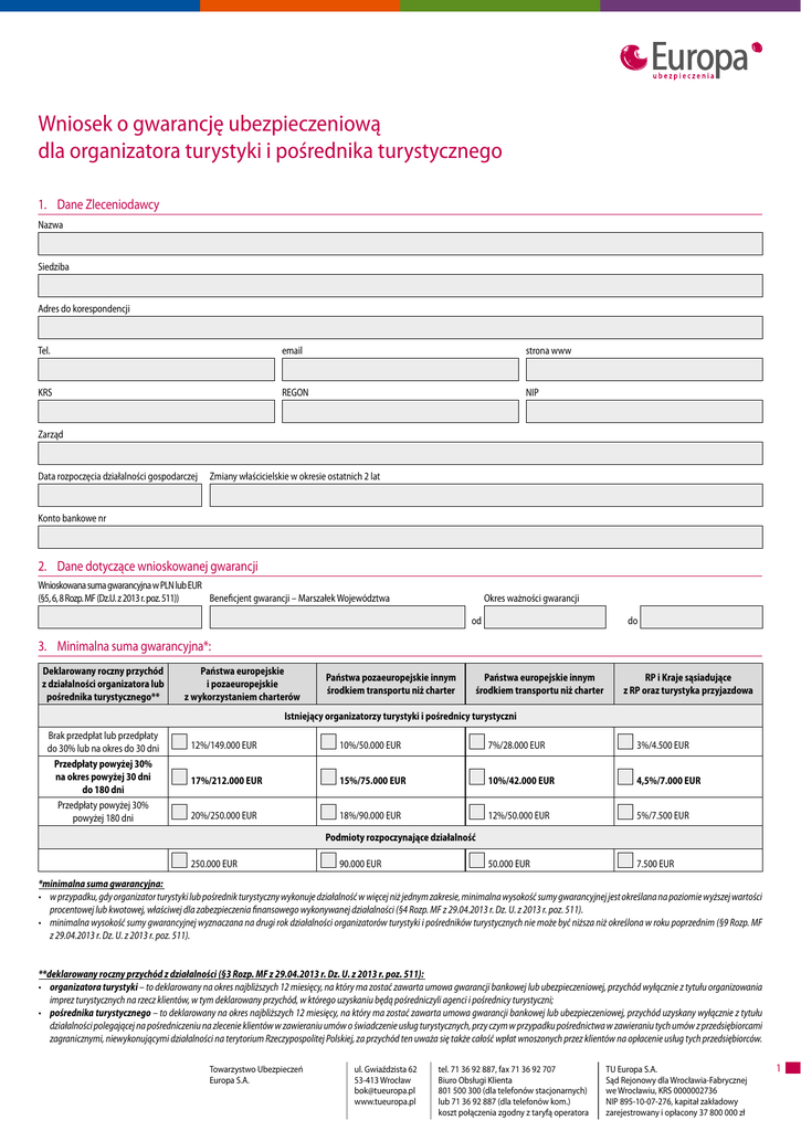 Wniosek o gwarancję ubezpieczeniową dla organizatora turystyki i pośrednika turystycznego 1. Dane Zleceniodawcy Nazwa Siedziba Adres do korespondencji Tel. email strona www KRS REGON NIP Zarząd Data rozpoczęcia działalności gospodarczej Zmiany właścicielskie w okresie ostatnich 2 lat Konto bankowe nr 2. Dane dotyczące wnioskowanej gwarancji Wnioskowana suma gwarancyjna w PLN lub EUR (§5, 6, 8 Rozp. MF (Dz.U. z 2013 r. poz. 511)) Beneficjent gwarancji – Marszałek Województwa Okres ważności gwarancji od do 3. Minimalna suma gwarancyjna*: Deklarowany roczny przychód z działalności organizatora lub pośrednika turystycznego** Państwa europejskie i pozaeuropejskie z wykorzystaniem charterów Państwa pozaeuropejskie innym środkiem transportu niż charter Państwa europejskie innym środkiem transportu niż charter RP i Kraje sąsiadujące z RP oraz turystyka przyjazdowa Istniejący organizatorzy turystyki i pośrednicy turystyczni Brak przedpłat lub przedpłaty do 30% lub na okres do 30 dni Przedpłaty powyżej 30% na okres powyżej 30 dni do 180 dni Przedpłaty powyżej 30% powyżej 180 dni 12%/149.000 EUR 10%/50.000 EUR 7%/28.000 EUR 3%/4.500 EUR 17%/212.000 EUR 15%/75.000 EUR 10%/42.000 EUR 4,5%/7.000 EUR 20%/250.000 EUR 18%/90.000 EUR 12%/50.000 EUR 5%/7.500 EUR 50.000 EUR 7.500 EUR Podmioty rozpoczynające działalność 250.000 EUR 90.000 EUR *minimalna suma gwarancyjna: •w przypadku, gdy organizator turystyki lub pośrednik turystyczny wykonuje działalność w więcej niż jednym zakresie, minimalna wysokość sumy gwarancyjnej jest określana na poziomie wyższej wartości procentowej lub kwotowej, właściwej dla zabezpieczenia finansowego wykonywanej działalności (§4 Rozp. MF z 29.04.2013 r. Dz. U. z 2013 r. poz. 511). •minimalna wysokość sumy gwarancyjnej wyznaczana na drugi rok działalności organizatorów turystyki i pośredników turystycznych nie może być niższa niż określona w roku poprzednim (§9 Rozp. MF z 29.04.2013 r. Dz. U. z 2013 r. poz. 511). **deklarowany roczny przychód z działalności (§3 Rozp. MF z 29.04.2013 r. Dz. U. z 2013 r. poz. 511): • organizatora turystyki – to deklarowany na okres najbliższych 12 miesięcy, na który ma zostać zawarta umowa gwarancji bankowej lub ubezpieczeniowej, przychód wyłącznie z tytułu organizowania imprez turystycznych na rzecz klientów, w tym deklarowany przychód, w którego uzyskaniu będą pośredniczyli agenci i pośrednicy turystyczni; • pośrednika turystycznego – to deklarowany na okres najbliższych 12 miesięcy, na który ma zostać zawarta umowa gwarancji bankowej lub ubezpieczeniowej, przychód uzyskany wyłącznie z tytułu działalności polegającej na pośredniczeniu na zlecenie klientów w zawieraniu umów o świadczenie usług turystycznych, przy czym w przypadku pośrednictwa w zawieraniu tych umów z przedsiębiorcami zagranicznymi, niewykonującymi działalności na terytorium Rzeczypospolitej Polskiej, za przychód ten uważa się także całość wpłat wnoszonych przez klientów na opłacenie usług tych przedsiębiorców. Towarzystwo Ubezpieczeń Europa S.A. ul. Gwiaździsta 62 53-413 Wrocław [email protected] www.tueuropa.pl tel. 71 36 92 887, fax 71 36 92 707 Biuro Obsługi Klienta 801 500 300 (dla telefonów stacjonarnych) lub 71 36 92 887 (dla telefonów kom.) koszt połączenia zgodny z taryfą operatora TU Europa S.A. Sąd Rejonowy dla Wrocławia-Fabrycznej we Wrocławiu, KRS 0000002736 NIP 895-10-07-276, kapitał zakładowy zarejestrowany i opłacony 37 800 000 zł 1 4. Organizator Turystyki i/lub pośrednik turystyczny Średnia cena podróży Planowana ilość klientów w okresie ważności gwarancji Maksymalna cena podróży Polska Kraje sąsiadujące z Polską Europa Świat Razem 5. Informacja o pożyczkach, kredytach, udzielonych poręczeniach i gwarancjach wystawionych na zlecenie organizatora turystyki/pośrednika turystycznego: 6. Czy w okresie prowadzenia działalności cofnięto zezwolenie TAK NIE (prosimy podać podstawę cofnięcia) Czy takie postępowanie jest prowadzone w chwili obecnej TAK NIE 7. Maksymalna liczba klientów, jednorazowo korzystających z usług Zleceniodawcy w tym samym czasie: w Polsce za granicą 8. Czy do dnia złożenia niniejszego wniosku: a. dokonano wypłaty w tytułu odszkodowań w wysokości: TAK NIE b. zgłoszono roszczenia TAK na kwotę: NIE c. toczy się postępowanie w prokuraturze, sądzie, UOKiK lub innym organie administracji państwowej przeciw Zleceniodawcy w zakresie prowadzonej działalności NIE TAK (prosimy podać podstawy zarzutu) 9. Ilość klientów a. Planowana ilość klientów w okresie ważności gwarancji: b. Planowana ilość klientów w okresach najwyższego sezonu (podać miesiące, ilość klientów, wartość sprzedaży): c. Ilość klientów obsłużonych w roku poprzednim: Towarzystwo Ubezpieczeń Europa S.A. ul. Gwiaździsta 62 53-413 Wrocław [email protected] www.tueuropa.pl tel. 71 36 92 887, fax 71 36 92 707 Biuro Obsługi Klienta 801 500 300 (dla telefonów stacjonarnych) lub 71 36 92 887 (dla telefonów kom.) koszt połączenia zgodny z taryfą operatora TU Europa S.A. Sąd Rejonowy dla Wrocławia-Fabrycznej we Wrocławiu, KRS 0000002736 NIP 895-10-07-276, kapitał zakładowy zarejestrowany i opłacony 37 800 000 zł 2 10. Charakterystyka prowadzonej działalności (najczęściej obsługiwane kraje, charakterystyka oferty turystycznej: Czy właściciel/osoba zarządzająca pełniła w przeszłości podobne funkcje w innych podmiotach turystycznych (kiedy, na jakim stanowisku i w jakiej firmie): 11. Dotychczasowy ubezpieczyciel: Składka ubezpieczeniowa zainkasowana z ubezpieczeń turystycznych w okresie ważności dotychczasowej gwarancji u dotychczasowego ubezpieczyciela: Pkt. 11 uzupełnia Zleceniodawca, który w poprzednim okresie nie miał gwarancji w TU Europa S.A. Wraz z Wnioskiem składamy załączniki zgodnie z poniższą listą. Jednocześnie mając świadomość