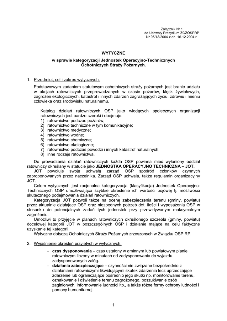 Załącznik Nr 1 do Uchwały Prezydium ZGZOSPRP Nr 95/18/2004 z dn. 16.12.2004 r. WYTYCZNE w sprawie kategoryzacji Jednostek Operacyjno-Technicznych Ochotniczych StraŜy PoŜarnych. 1. Przedmiot, cel i zakres wytycznych. Podstawowym zadaniem statutowym ochotniczych straŜy poŜarnych jest branie udziału w akcjach ratowniczych przeprowadzanych w czasie poŜarów, klęsk Ŝywiołowych, zagroŜeń ekologicznych, katastrof i innych zdarzeń zagraŜających Ŝyciu, zdrowiu i mieniu człowieka oraz środowisku naturalnemu. Katalog działań ratowniczych OSP jako wiodących społecznych organizacji ratowniczych jest bardzo szeroki i obejmuje: 1) ratownictwo podczas poŜarów; 2) ratownictwo techniczne w tym komunikacyjne; 3) ratownictwo medyczne; 4) ratownictwo wodne; 5) ratownictwo chemiczne; 6) ratownictwo ekologiczne; 7) ratownictwo podczas powodzi i innych katastrof naturalnych; 8) inne rodzaje ratownictwa. Do prowadzenia działań ratowniczych kaŜda OSP powinna mieć wyłoniony oddział ratowniczy określany w statucie jako JEDNOSTKA OPERACYJNO TECHNICZNA – JOT. JOT powołuje swoją uchwałą zarząd OSP spośród członków czynnych zaproponowanych przez naczelnika. Zarząd OSP uchwala, takŜe regulamin organizacyjny JOT. Celem wytycznych jest racjonalna kategoryzacja (klasyfikacja) Jednostek OperacyjnoTechnicznych OSP umoŜliwiająca szybkie określenie ich wartości bojowej tj. moŜliwości skutecznego podejmowania działań ratowniczych. Kategoryzacja JOT pozwoli takŜe na ocenę zabezpieczenia terenu (gminy, powiatu) przez aktualnie działające OSP oraz niezbędnych potrzeb dot. ilości i wyposaŜenia OSP w stosunku do potencjalnych zadań tych jednostek przy przewidywanym maksymalnym zagroŜeniu. UmoŜliwi to przyjęcie w planach ratowniczych określonego szczebla (gminy, powiatu) docelowej kategorii JOT w poszczególnych OSP i działanie mające na celu faktyczne uzyskanie tej kategorii. Wytyczne dotyczą Ochotniczych StraŜy PoŜarnych zrzeszonych w Związku OSP RP. 2. Wyjaśnienie określeń przyjętych w wytycznych. − czas dysponowania – czas ustalony w gminnym lub powiatowym planie ratowniczym liczony w minutach od zadysponowania do wyjazdu zadysponowanych załóg. − działania zabezpieczające – czynności nie związane bezpośrednio z działaniami ratowniczymi likwidującymi skutek zdarzenia lecz uprzedzające zdarzenie lub ograniczające pośrednio jego skutki np. monitorowanie terenu, oznakowanie i oświetlenie terenu zagroŜonego, poszukiwanie osób zaginionych, informowanie ludności itp., a takŜe róŜne formy ochrony ludności i pomocy humanitarnej. 1 − własny teren chroniony – teren, na którym JOT zobowiązana jest podjąć działania z dyspozycji własnej lub uprawnionego ośrodka dyspozycyjnego − sekcja – zespół członków czynnych OSP powołanych do JOT liczący 10 osób − pluton – pododdział składający się z 2-3 sekcji − załoga – normatywna obsada osobowa samochodu (pojazdu, środka transportu) − ratownik OSP – członek OSP powołany do JOT posiadający niezbędne wyszkolenie oraz badania lekarskie, a takŜe ubezpieczenie od następstw nieszczęśliwych wypadków w czasie wykonywania zadań statutowych. 3. Kategorie JOT Kategoria I – JOT zdolna do podjęcia w czasie dysponowania do 5 min. n/w działań: 1) działania ratownicze w czasie poŜarów 2) działania ratownicze w czasie katastrof, wypadków i awarii technicznych, szczególnie komunikacyjnych 3) działania ratownicze w czasie jednego z n/w zagroŜeń: a) zagroŜenia powodziowego i wodnego b) zagroŜenia chemicznego i ekologicznego 4) udzielenie zgodnie z obowiązującymi procedurami pierwszej pomocy medycznej 5) działania zabezpieczające w czasie innych działań ratowniczych. JOT w sile plutonu z własnym obszarem chronionym obejmującym teren powiatu. Kategoria II – JOT zdolna do podjęcia w czasie dysponowania do 5 min. n/w działań: 1) działania ratownicze w czasie poŜarów 2) działania ratownicze w czasie katastrof, wypadków i awarii technicznych, szczególnie komunikacyjnych 3) udzielanie zgodnie z obowiązującymi procedurami pierwszej pomocy medycznej 4) działania zabezpieczające w czasie innych działań ratowniczych JOT w sile plutonu z własnym obszarem chronionym obejmującym teren powiatu. Kategoria III – JOT zdolna do podjęcia w czasie dysponowania do 5 min. n/w działań: 1) działania ratownicze w czasie poŜarów 2) udzielanie zgodnie z obowiązującymi procedurami pierwszej pomocy medycznej 3) czynności zabezpieczające w czasie innych działań ratowniczych JOT w sile sekcji z własnym obszarem chronionym obejmującym teren gminy. Kategoria IV – JOT w OSP lokalnego działania zdolna do podjęcia w czasie dysponowania do 10 min. ograniczonych działań ratowniczych w czasie poŜarów oraz ograniczonych działań zabezpieczających. JOT w sile sekcji z własnym obszarem chronionym obejmującym teren miejscowości będącej siedzibą OSP. JOT specjalistyczna – przygotowana do specjalistycznych działań ratowniczych i zabezpieczających w czasie klęsk Ŝywiołowych, katastrof, awarii i innych zagroŜeń. 2 4. Wymogi organizacyjno-techniczne poszczególnych kategorii JOT. 5. Ustalenie kategorii JOT oraz inne uwarunkowania, wymogi i uwagi. 1) aktualna i planowana kategoria JOT ustalana jest w gminnym i powiatowym planie ratowniczym; 2) kategoria JOT moŜe stanowić (być równoznaczna) kategorię OSP; 3) JOT I i II kategorii mają priorytet w zabezpieczeniu finansowym; 3 4) członkowie czynni OSP powołani do JOT powinni być wyposaŜeni w środki ochrony osobistej indywidualnej; 5) członkowie czynni OSP powołani do JOT noszą na umundurowaniu bojowym oznaczenie kategorii JOT; 6) członkowie czynni OSP powołani do JOT powinni posiadać odpowiedni stan zdrowia oraz obowiązujące przeszkolenie z zakresu BHP; 7) naczelnicy, d-cy plutonów i sekcji powinni posiadać uzupełniające przeszkolenie dowódcze a ratownicy OSP obsługu