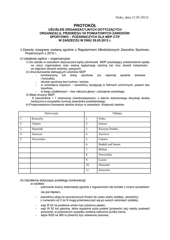 Nisko, dnia 11.05.2012r. PROTOKÓŁ UŚCIŚLEŃ ORGANIZACYJNYCH DOTYCZĄCYCH ORGANIZACJI, PRZEBIEGU VII POWIATOWYCH ZAWODÓW SPORTOWO – POŻARNICZYCH DLA MDP CTiF W ZARZECZU W DNIU 26.05.2012 r. I) Zawody rozegrane zostaną zgodnie z Regulaminem Młodzieżowych Zawodów Sportowo- Pożarniczych z 2010 r. II) Ustalenia ogólno – organizacyjne: 1) Do udziału w zawodach dopuszczeni będą członkowie MDP posiadający potwierdzenie wpłaty na rzecz organizatora oraz ważną legitymację szkolną lub inny dowód tożsamości ze zdjęciem (dowód osobisty, paszport). 2) Umundurowanie startujących członków MDP - kombinezony lub dresy sportowe (co najmniej spodnie dresowe i koszulka), - obuwie sportowe bez korków i kolców, - w rozwinięciu bojowym – zawodnicy występują w hełmach ochronnych, pasach bez toporków, - w biegu sztafetowym – bez nakrycia głowy i uzbrojenia osobistego 3) Skład drużyny MDP: 9 zawodników + 1 rezerwowy (nieobowiązkowo), o starcie rezerwowego decyduje służba medyczna w przypadku kontuzji zawodnika podstawowego. 4) Przeprowadzono losowanie startów drużyn w zawodach. Kolejność startów: Dziewczęta Chłopcy 1. Krzeszów 1. Nisko 2. Ulanów 2. Jeżowe 3. Harasiuki 3. Kurzyna Średnia 4. Zarzecze 4. Zarzecze 5. Nowosielec 5. Ulanów 6. Rudnik nad Sanem 7. Bieliny 8. Nowosielec 9. Łazory 10. Harasiuki 11. Krzeszów III) Uściślenia dotyczące przebiegu konkurencji: a) sztafeta: - pokonanie ściany drabiniastej zgodnie z regulaminem ale kontakt z innymi szczeblami nie jest błędem, - zawodnicy stoją na wyznaczonych liniach do czasu startu sztafety, zawodnicy z numerami od 2 do 9 mogą przemieszczać się po swoich odcinkach sztafety, - wąż W 52 na podeście winien być położony płasko, wąż W 52 lub gaśnicę, która wypadnie poza podest (przewróci się) należy postawić ponownie, w przeciwnym wypadku zostaną naliczone punkty karne, węże W52 na 380 m powinny być ustawione pionowo, - b) ćwiczenia bojowe: - węże ustawione są łącznikami w kierunku biegu, łączniki nie dotykają ziemi, a wąż nie posiada zakładek, - za skręt węża uważa się każdy pełny 360 stopniowy obrót węża wokół osi, na stanowisku z hydronetkami, przy liniach bocznych toru ustawione są wiadra 10 l z rezerwową wodą prądowniczka położona jest na hydronetce, skierowana pyszczkiem w kierunku natarcia, - na stanowisku węzłów dopuszcza się przewieszenie węża przez belkę na stanowisku nr 7, - nie jest błędem podjęcie węży przez zawodników nr 6,7,8,9 przed wejściem w tor, - po wykonaniu zadania zawodnicy udają się do miejsca ustawienia drużyny po zakończeniu ćwiczenia i ustawiają się zgodnie z regulaminem, twarzą do linii startu. IV) Przyjazd drużyn na parkingi wokół stadionu w Zarzeczu. Godzina przyjazdu w dniu zawodów do godz.11.45. V) Drużyny startują na własnym sprzęcie, hydronetki i gaśnice natomiast zapewnia organizator. VI) Oznakowanie funkcyjnych (zgodne z regulaminem) drużyny zapewniają sobie samodzielnie. VII) Data naliczenia wieku członków MDP ustalona jest na dzień zawodów powiatowych czyli 26-05-2012 r. VIII) Z powyższymi ustaleniami należy zapoznać zawodników. IX) Za dyscyplinę i punktualność na zawodach odpowiadają opiekunowie poszczególnych drużyn. X) Organizator nie odpowiada za rzeczy zagubione i pozostawione. XI) Drużyny proszone są o wchodzenie do startu na stadion zgodnie z listą startową i zapowiedziami spikera. Przed wejściem drużyna z opiekunem udaje się do stanowiska weryfikacji. XII) Ustala się czas przygotowania drużyn do poszczególnych konkurencji na 5 minut. XIII) Start drużyn rozpoczyna się od sztafety pożarniczej, a następnie drużyny przechodzą do ćwiczenia bojowego. W sztafecie nie obowiązuje numeracja zawodników. XIV) W przypadku nie dotarcia na zawody drużyny kolejność startów pozostaje tak jak ustalono w załączniku. XV) Posiłek (obiad) dla startujących przewidziano na miejscu zawodów. XVI) Powyższych ustaleń dokonano na odprawie z kierownikami w dniu 11-05-2012 r. w Nisku (lista obecności w załączeniu). drużyn MDP właściwe podpisy na oryginale Sędzia Główny Zawodów mł. bryg. K. Skrzypek ......................................... Za organizatora st. bryg. R. Sieńko – Komendant Powiatowy ................................