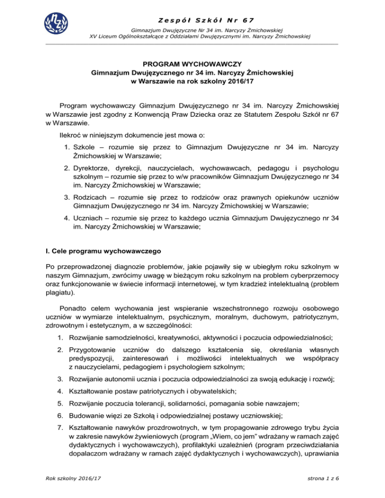 Zespół Szkół Nr 67 Gimnazjum Dwujęzyczne Nr 34 im. Narcyzy Żmichowskiej XV Liceum Ogólnokształcące z Oddziałami Dwujęzycznymi im. Narcyzy Żmichowskiej _________________________________________________________________________________________ PROGRAM WYCHOWAWCZY Gimnazjum Dwujęzycznego nr 34 im. Narcyzy Żmichowskiej w Warszawie na rok szkolny 2016/17 Program wychowawczy Gimnazjum Dwujęzycznego nr 34 im. Narcyzy Żmichowskiej w Warszawie jest zgodny z Konwencją Praw Dziecka oraz ze Statutem Zespołu Szkół nr 67 w Warszawie. Ilekroć w niniejszym dokumencie jest mowa o: 1. Szkole – rozumie się przez to Gimnazjum Dwujęzyczne nr 34 im. Narcyzy Żmichowskiej w Warszawie; 2. Dyrektorze, dyrekcji, nauczycielach, wychowawcach, pedagogu i psychologu szkolnym – rozumie się przez to w/w pracowników Gimnazjum Dwujęzycznego nr 34 im. Narcyzy Żmichowskiej w Warszawie; 3. Rodzicach – rozumie się przez to rodziców oraz prawnych opiekunów uczniów Gimnazjum Dwujęzycznego nr 34 im. Narcyzy Żmichowskiej w Warszawie; 4. Uczniach – rozumie się przez to każdego ucznia Gimnazjum Dwujęzycznego nr 34 im. Narcyzy Żmichowskiej w Warszawie; I. Cele programu wychowawczego Po przeprowadzonej diagnozie problemów, jakie pojawiły się w ubiegłym roku szkolnym w naszym Gimnazjum, zwrócimy uwagę w bieżącym roku szkolnym na problem cyberprzemocy oraz funkcjonowanie w świecie informacji internetowej, w tym kradzież intelektualną (problem plagiatu). Ponadto celem wychowania jest wspieranie wszechstronnego rozwoju osobowego uczniów w wymiarze intelektualnym, psychicznym, moralnym, duchowym, patriotycznym, zdrowotnym i estetycznym, a w szczególności: 1. Rozwijanie samodzielności, kreatywności, aktywności i poczucia odpowiedzialności; 2. Przygotowanie uczniów do dalszego kształcenia się, określania własnych predyspozycji, zainteresowań i możliwości intelektualnych we współpracy z nauczycielami, pedagogiem i psychologiem szkolnym; 3. Rozwijanie autonomii ucznia i poczucia odpowiedzialności za swoją edukację i rozwój; 4. Kształtowanie postaw patriotycznych i obywatelskich; 5. Rozwijanie poczucia tolerancji, solidarności, pomagania sobie nawzajem; 6. Budowanie więzi ze Szkołą i odpowiedzialnej postawy uczniowskiej; 7. Kształtowanie nawyków prozdrowotnych, w tym propagowanie zdrowego trybu życia w zakresie nawyków żywieniowych (program „Wiem, co jem” wdrażany w ramach zajęć dydaktycznych i wychowawczych), profilaktyki uzależnień (program przeciwdziałania dopalaczom wdrażany w ramach zajęć dydaktycznych i wychowawczych), uprawiania Rok szkolny 2016/17 strona 1 z 6 PROGRAM WYCHOWAWCZY G i m n a z j u m D wu j ę z y c z ne g o nr 3 4 i m . N a r c y z y Ż m i c ho ws k i e j _________________________________________________________________________________________ sportu i podejmowania działań zmierzających do zredukowania liczby zwolnień z zajęć wychowania fizycznego; 8. Kształtowanie nawyku dbałości o bezpieczeństwo swoje i innych, zwłaszcza zapobieganie przejawom przemocy i agresji; 9. Wspieranie uczniów przez nauczycieli, w tym uwzględnianie potrzeb osób niepełnosprawnych; 10. Zachęcanie do uczestniczenia w wydarzeniach kulturalnych; 11. Utrwalanie podstawowych zasad savoir-vivre. II. Ideał absolwenta Gimnazjum Dwujęzycznego nr 34 im. Narcyzy Żmichowskiej w Warszawie Uczeń kończący Gimnazjum Dwujęzyczne w Warszawie powinien starać się być: nr 34 im. Narcyzy Żmichowskiej 1. Odpowiedzialny, kreatywny i pracowity, tj.: a) Przewiduje skutki swoich działań, wykorzystuje wcześniejsze doświadczenia i gotów jest ponieść konsekwencje swoich czynów. b) Stara się rozwiązywać napotkane problemy. c) W razie potrzeby potrafi poszukiwać i znajdować pomoc i korzysta z niej. d) Wykorzystuje nowe źródła wiedzy i dąży do opanowania nowych wiadomości. e) Kształtuje w sobie poczucie odpowiedzialności. 2. Komunikatywny, tj.: a) W grupie potrafi działać zgodnie z obowiązującymi w niej zasadami. b) Nawiązuje współpracę z innymi ludźmi. c) Potrafi prezentować swój punkt widzenia. d) Bierze pod uwagę poglądy innych. 3. Rozważny, tj.: a) Umie dokonywać istotnych dla jego najbliższej przyszłości wyborów. b) Selekcjonuje i porządkuje zdobyte informacje by móc planować swoje działania. c) Zna zagrożenia występujące w jego środowisku i wie, do kogo zwrócić się o pomoc w przeciwstawianiu się im. d) Zna swoje mocne i słabe strony. e) Próbuje radzić sobie ze stresem. f) Nie ulega nałogom. 4. Przestrzegający norm społecznych, tj.: a) Postępuje zgodnie z zasadami moralnymi i etycznymi. Rok szkolny 2016/17 strona 2 z 6 PROGRAM WYCHOWAWCZY G i m n a z j u m D wu j ę z y c z ne g o nr 3 4 i m . N a r c y z y Ż m i c ho ws k i e j _________________________________________________________________________________________ b) Rozróżnia zachowania dobre i złe. c) Wykazuje postawę obywatelską i patriotyczną. d) W różnych sytuacjach życiowych zachowuje się zgodnie z obowiązującymi normami. e) Potrafi prezentować swój punkt widzenia i bronić swoich racji bez uciekania się do agresji słownej i przemocy. f) Szanuje własność intelektualną i przestrzega prawa autorskiego. 5. Tolerancyjny, tj.: a) Nawiązuje przyjazne kontakty z ludźmi, współdziała z nimi i akceptuje ich odmienność. b) Szanuje poglądy innych. c) Rozumie, że różnice pomiędzy ludźmi są czymś normalnym i pożądanym. 6. Aktywny, tj.: a) Interesuje się otaczającym go światem. b) Poszerza swoje zainteresowania i wiedzę. c) Lubi ruch i chętnie uprawia sport. 7. Empatyczny, tj.: a) Jest wrażliwy na krzywdę innych. b) Reaguje na zło. c) Jest wrażliwy na otaczający go świat, porządek i przyrodę. III. Integralność wychowania Przez integralność wychowania rozumie się wszystkie formy działania mające funkcję wychowawczą. Szczególną rolę odgrywają tu: 1. Działania wychowawcy, który: a) Re