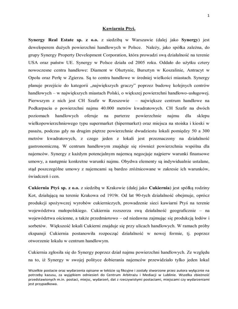 1 Kawiarnia Ptyś. Synergy Real Estate sp. z o.o. z siedzibą w Warszawie (dalej jako Synergy) jest deweloperem dużych powierzchni handlowych w Polsce. Należy, jako spółka zależna, do grupy Synergy Property Development Corporation, która prowadzi swą działalność na terenie USA oraz państw UE. Synergy w Polsce działa od 2005 roku. Oddało do użytku cztery nowoczesne centra handlowe: Diament w Olsztynie, Bursztyn w Koszalinie, Antracyt w Opolu oraz Perłę w Zgierzu. Są to centra handlowe w średniej wielkości miastach. Synergy planuje przejście do kategorii „największych graczy” poprzez budowę kolejnych centrów handlowych – w największych miastach Polski, o większej powierzchni handlowo-usługowej. Pierwszym z nich jest CH Szafir w Rzeszowie – największe centrum handlowe na Podkarpaciu o powierzchni najmu 40.000 metrów kwadratowych. CH Szafir na dwóch poziomach handlowych oferuje na parterze powierzchnie najmu dla sklepu wielkopowierzchniowego typu supermarket (hipermarket) oraz miejsca na stoiska i kioski w pasażu, podczas gdy na drugim piętrze powierzchnie dwudziestu lokali pomiędzy 50 a 300 metrów kwadratowych, z czego jeden z lokali jest przeznaczony na działalność gastronomiczną. W centrum handlowym znajduje się również powierzchnia wspólna dla najemców. Synergy z każdym potencjalnym najemcą negocjuje najpierw warunki finansowe umowy, a następnie konkretne warunki najmu. Obydwa elementy są indywidualnie ustalane, stąd poszczególne umowy z najemcami są bardzo zróżnicowane w zakresie ich warunków, świadczeń i cen. Cukiernia Ptyś sp. z o.o. z siedzibą w Krakowie (dalej jako Cukiernia) jest spółką rodziny Kot, działającą na terenie Krakowa od 1919r. Od lat 90-tych działalność obejmuje, oprócz produkcji spożywczej wyrobów cukierniczych, prowadzenie sieci kawiarni Ptyś na terenie województwa małopolskiego. Cukiernia rozszerza swą działalność geograficznie – na województwa ościenne, a także przedmiotowo – od niedawna zajmując się produkcją lodów i sorbetów. Większość lokali Cukierni znajduje się przy ulicach handlowych. W ramach próby ekspansji Cukiernia postanowiła rozpocząć działalność w nowej formie, tj. poprzez otworzenie lokalu w centrum handlowym. Cukiernia zgłosiła się do Synergy poprzez dział najmu powierzchni handlowych. Ze względu na to, iż Synergy w swojej polityce dobierania najemców przewidziało tylko jeden lokal Wszelkie postacie oraz wydarzenia opisane w tekście są fikcyjne i zostały stworzone przez autora wyłącznie na potrzeby kazusu, za wyjątkiem odniesień do Centrum Arbitrażu i Mediacji w Lublinie. Wszelka zbieżność przedstawionych m.in. postaci, miejsc, wydarzeń, dat z rzeczywistymi postaciami, miejscami czy wydarzeniami jest przypadkowa. 2 gastronomiczny wstępne ustalenia miały charakter jednoczesnych rokowań z dwoma potencjalnymi najemcami, o czym zostali oni poinformowani. W efekcie, Cukiernia, konkurująca z lokalnym przedsiębiorcom prowadzącym sieć pizzerii i planującym otwarcie kolejnej w CH Szafir, przedstawiła propozycję wynajmu nie tylko lokalu o powierzchni 30 mkw wraz z zapleczem (12 mkw) na drugim piętrze, ale także stoiska w pasażu na parterze o powierzchni 5mkw. Synergy wybrało Cukiernię i przystąpiło do wyłącznych negocjacji odnośnie warunków umowy najmu. Ustalono, iż zostanie zawarta umowa najmu lokalu na czas oznaczony wynoszący 2 lata (do 30 czerwca 2015r.). Czynsz najmu miał być płacony częściowo na podstawie stawki w euro a częściowo w złotych do 10. dnia każdego miesiąca. Składało się na to zsumowanie komponentów: 1) Czynsz najmu lokalu o powierzchni 42 mkw przy stawce: a. 30 mkw za 70 euro za mkw (2.100 euro); b. 12 mkw za 50 euro za mkw (600 euro) 2) Czynsz najmu stoiska o powierzchni 5 mkw przy stawce 80 euro za mkw (400 euro); 3) Partycypacja w kosztach utrzymania powierzchni wspólnej liczona jako udział powierzchni najmu w stosunku do całościowej powierzchni najmu, tj. łącznie 47 mkw na 8.000 mkw, tj. 0,59% z kwoty ustalonej na 100.000zł miesięcznie, tj. 590zł Łącznie, comiesięczne opłaty wynikające z najmu wynosiły 3.100 euro oraz 590zł. Dodatkowo, najemca przy zawarciu umowy zobowiązał się do złożenia 5.000 euro tytułem kaucji, co zostało dokonane z dniem 1 maja 2013r. Umowę podpisano w dniu 7 kwietnia 2013r., gdy CH Szafir przechodziło finalne „odbiory”. W tym czasie nie wszystkie dostępne powierzchnie były już wynajęte. Oficjalne otwarcie CH Szafir zaplanowano na 1 lipca 2013r. Okres najmu rozpoczynał się 1 czerwca 2013r., kiedy to lokal (m.in. do odpowiednich warunków sanitarnych dla produkcji i sprzedaży żywności) zaczęli przygotowywać wynajęci przez Cukiernię specjaliści z zakresu robót wykończeniowych. Wszelkie postacie oraz wydarzenia opisane w tekście są fikcyjne i zostały stworzone przez autora wyłącznie na potrzeby kazusu, za wyjątkiem odniesień do Centrum Arbitrażu i Mediacji w Lublinie. Wszelka zbieżność przedstawionych m.in. postaci, miejsc, wydarzeń, dat z rzeczywistymi postaciami, miejscami czy wydarzeniami jest przypadkowa. 3 Cukiernia Ptyś w CH Szafir rozwijała się prężnie, tak w zakresie lokalu głównego jak i stanowiska z lodami. Rodzina Kot nie żałowała swojej decyzji o rozwoju w nowym segmencie rynku – planowała dalszy rozwój w sektorze centrów handlowych. Ażeby sprostać zwiększonemu zapotrzebowaniu na wyroby marki Ptyś w czerwcu 2013r. Cukiernia zainwestowała 200.000zł w nową linię produkcyjną maszyn do wyrobu lodów, chcąc rozszerzyć działalność w tym zakresie. Był to znaczny wydatek w rocznym budżecie przedsiębiorstwa, którego zyski na okres drugiego półrocza 2014r. i pierwszego półrocza 2015r. miały być minimalne (lub nie występować), ze względu na spłatę inwestycji. Jednocześnie, większe moce produkcyjne powodowały, iż Ptyś mógł inwestować w większą liczb