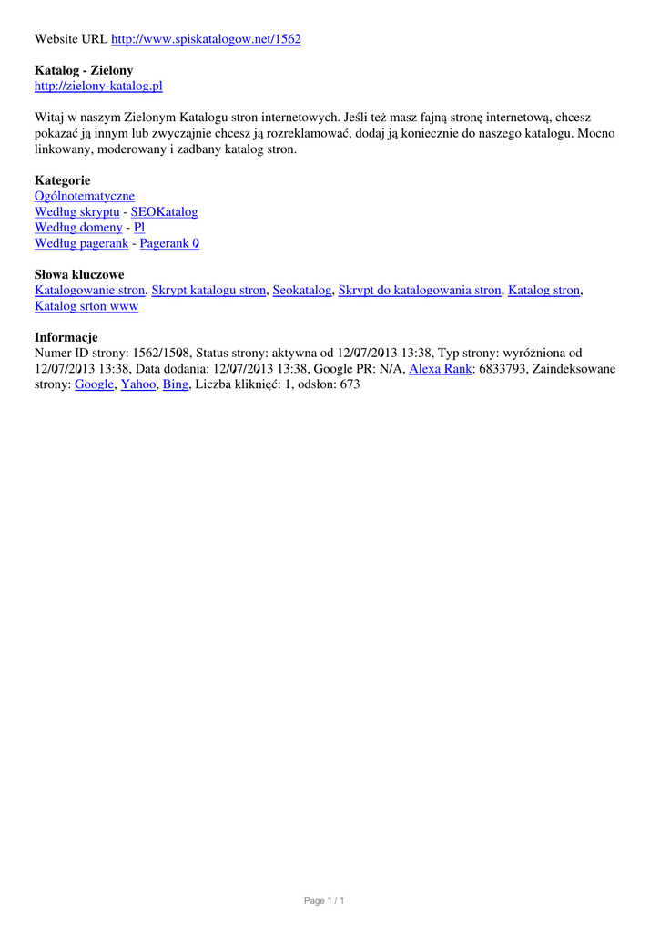Website URL http://www.spiskatalogow.net/1562 Katalog - Zielony http://zielony-katalog.pl Witaj w naszym Zielonym Katalogu stron internetowych. Jeśli też masz fajną stronę internetową, chcesz pokazać ją innym lub zwyczajnie chcesz ją rozreklamować, dodaj ją koniecznie do naszego katalogu. Mocno linkowany, moderowany i zadbany katalog stron. Kategorie Ogólnotematyczne Według skryptu - SEOKatalog Według domeny - Pl Według pagerank - Pagerank 0 Słowa kluczowe Katalogowanie stron, Skrypt katalogu stron, Seokatalog, Skrypt do katalogowania stron, Katalog stron, Katalog srton www Informacje Numer ID strony: 1562/1508, Status strony: aktywna od 12/07/2013 13:38, Typ strony: wyróżniona od 12/07/2013 13:38, Data dodania: 12/07/2013 13:38, Google PR: N/A, Alexa Rank: 6833793, Zaindeksowane strony: Google, Yahoo, Bing, Liczba kliknięć: 1, odsłon: 673 Page 1 / 1