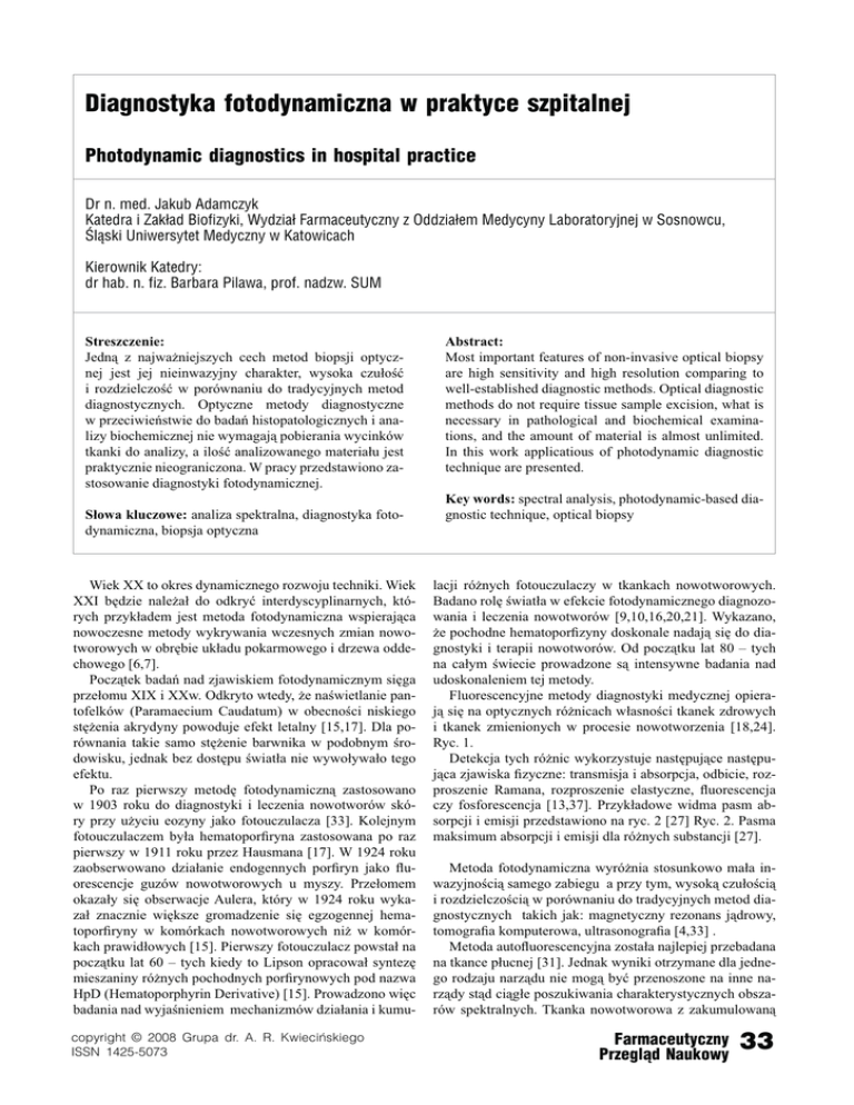 $IAGNOSTYKAFOTODYNAMICZNAWPRAKTYCESZPITALNEJ 0HOTODYNAMICDIAGNOSTICSINHOSPITALPRACTICE $RNMED*AKUB!DAMCZYK +ATEDRAI:AKAD"IOFIZYKI7YDZIA&ARMACEUTYCZNYZ/DDZIAEM-EDYCYNY,ABORATORYJNEJW3OSNOWCU gLSKI5NIWERSYTET-EDYCZNYW+ATOWICACH +IEROWNIK+ATEDRY DRHABNFIZ"ARBARA0ILAWAPROFNADZW35- Streszczenie: Jedną z najważniejszych cech metod biopsji optycznej jest jej nieinwazyjny charakter, wysoka czułość i rozdzielczość w porównaniu do tradycyjnych metod diagnostycznych. Optyczne metody diagnostyczne w przeciwieństwie do badań histopatologicznych i analizy biochemicznej nie wymagają pobierania wycinków tkanki do analizy, a ilość analizowanego materiału jest praktycznie nieograniczona. W pracy przedstawiono zastosowanie diagnostyki fotodynamicznej. Słowa kluczowe: analiza spektralna, diagnostyka fotodynamiczna, biopsja optyczna Wiek XX to okres dynamicznego rozwoju techniki. Wiek XXI będzie należał do odkryć interdyscyplinarnych, których przykładem jest metoda fotodynamiczna wspierająca nowoczesne metody wykrywania wczesnych zmian nowotworowych w obrębie układu pokarmowego i drzewa oddechowego [6,7]. Początek badań nad zjawiskiem fotodynamicznym sięga przełomu XIX i XXw. Odkryto wtedy, że naświetlanie pantofelków (Paramaecium Caudatum) w obecności niskiego stężenia akrydyny powoduje efekt letalny [15,17]. Dla porównania takie samo stężenie barwnika w podobnym środowisku, jednak bez dostępu światła nie wywoływało tego efektu. Po raz pierwszy metodę fotodynamiczną zastosowano w 1903 roku do diagnostyki i leczenia nowotworów skóry przy użyciu eozyny jako fotouczulacza [33]. Kolejnym fotouczulaczem była hematoporfiryna zastosowana po raz pierwszy w 1911 roku przez Hausmana [17]. W 1924 roku zaobserwowano działanie endogennych porfiryn jako fluorescencje guzów nowotworowych u myszy. Przełomem okazały się obserwacje Aulera, który w 1924 roku wykazał znacznie większe gromadzenie się egzogennej hematoporfiryny w komórkach nowotworowych niż w komórkach prawidłowych [15]. Pierwszy fotouczulacz powstał na początku lat 60 – tych kiedy to Lipson opracował syntezę mieszaniny różnych pochodnych porfirynowych pod nazwa HpD (Hematoporphyrin Derivative) [15]. Prowadzono więc badania nad wyjaśnieniem mechanizmów działania i kumuCOPYRIGHT'RUPADR!2+WIECIÊSKIEGO )33. Abstract: Most important features of non-invasive optical biopsy are high sensitivity and high resolution comparing to well-established diagnostic methods. Optical diagnostic methods do not require tissue sample excision, what is necessary in pathological and biochemical examinations, and the amount of material is almost unlimited. In this work applicatious of photodynamic diagnostic technique are presented. Key words: spectral analysis, photodynamic-based diagnostic technique, optical biopsy lacji różnych fotouczulaczy w tkankach nowotworowych. Badano rolę światła w efekcie fotodynamicznego diagnozowania i leczenia nowotworów [9,10,16,20,21]. Wykazano, że pochodne hematoporfizyny doskonale nadają się do diagnostyki i terapii nowotworów. Od początku lat 80 – tych na całym świecie prowadzone są intensywne badania nad udoskonaleniem tej metody. Fluorescencyjne metody diagnostyki medycznej opierają się na optycznych różnicach własności tkanek zdrowych i tkanek zmienionych w procesie nowotworzenia [18,24]. Ryc. 1. Detekcja tych różnic wykorzystuje następujące następująca zjawiska fizyczne: transmisja i absorpcja, odbicie, rozproszenie Ramana, rozproszenie elastyczne, fluorescencja czy fosforescencja [13,37]. Przykładowe widma pasm absorpcji i emisji przedstawiono na ryc. 2 [27] Ryc. 2. Pasma maksimum absorpcji i emisji dla różnych substancji [27]. Metoda fotodynamiczna wyróżnia stosunkowo mała inwazyjnością samego zabiegu a przy tym, wysoką czułością i rozdzielczością w porównaniu do tradycyjnych metod diagnostycznych takich jak: magnetyczny rezonans jądrowy, tomografia komputerowa, ultrasonografia [4,33] . Metoda autofluorescencyjna została najlepiej przebadana na tkance płucnej [31]. Jednak wyniki otrzymane dla jednego rodzaju narządu nie mogą być przenoszone na inne narządy stąd ciągłe poszukiwania charakterystycznych obszarów spektralnych. Tkanka nowotworowa z zakumulowaną &ARMACEUTYCZNY 0RZEGLD.AUKOWY kU¤°°U Niezbędnym składnikiem diagnostyki i terapii fotodynamicznej nowotworów jest obecność w komórkach fotosensybilizatorów, czyli związków, które pod wpływem światła o odpowiedniej długości fali łatwo ulegają aktywacji [15,23,32]. Na świecie istnieją systemy do diagnostyki nowotworów metodą fotodynamiczną [30]. Są to wysoko wyspecjalizowane urządzenia wyposażone w źródło światła, monitory oraz systemy archiwizacji [13,14]. Jako źródła światła wykorzystywane są lasery niebieskie. Stwarza to problemy natury nie tylko finansowej ale również eksploatacyjnej gdyż technika budowy laserów niebieskich dużej mocy jest ciągle jeszcze udosko¬A'lJu|Rul¬oyRp}¬®J|ªRo7R®\| |¥A®¥q-A®-p|q|®lRq|y¬ |-®ªlJu|Rul¬oyR nalana. Alternatywą dla lap}¬Ai|Ro®|J-y¬u\| |¥A®¥q-A®Rup|q|A®Rª|y¬ <= serowych i żarowych źródeł światła jest zastosowanie elementów półprzewodniprotoporfiryną, po doprowadzeniu światła wzbudzającego kowych. Dioda elektroluminescencyjna jest prostym źrów zakresie ultrafioletu i fioletu emituje światło o czerwonej dłem światła. Niski strumień świetlny i mała różnorodność fluorescencji [1,6]. barw ograniczały jednak możliwości ich stosowania. OgraCzynnikiem determinującym głębokość wnikania wiązki niczeniami stosowania diod są: stosunkowo długi czas odpromieniowania świetlnego jest długość fali [11]. Maksipowiedzi oraz duża szerokość linii widmowej emitowanego mum transmitancji tkanek przypada na długości fal 8001200 nm. Przy długościach fal 400-500 nm (stosowanych światła. Zaletą jest liniowa zdolność mocy modulowanego 