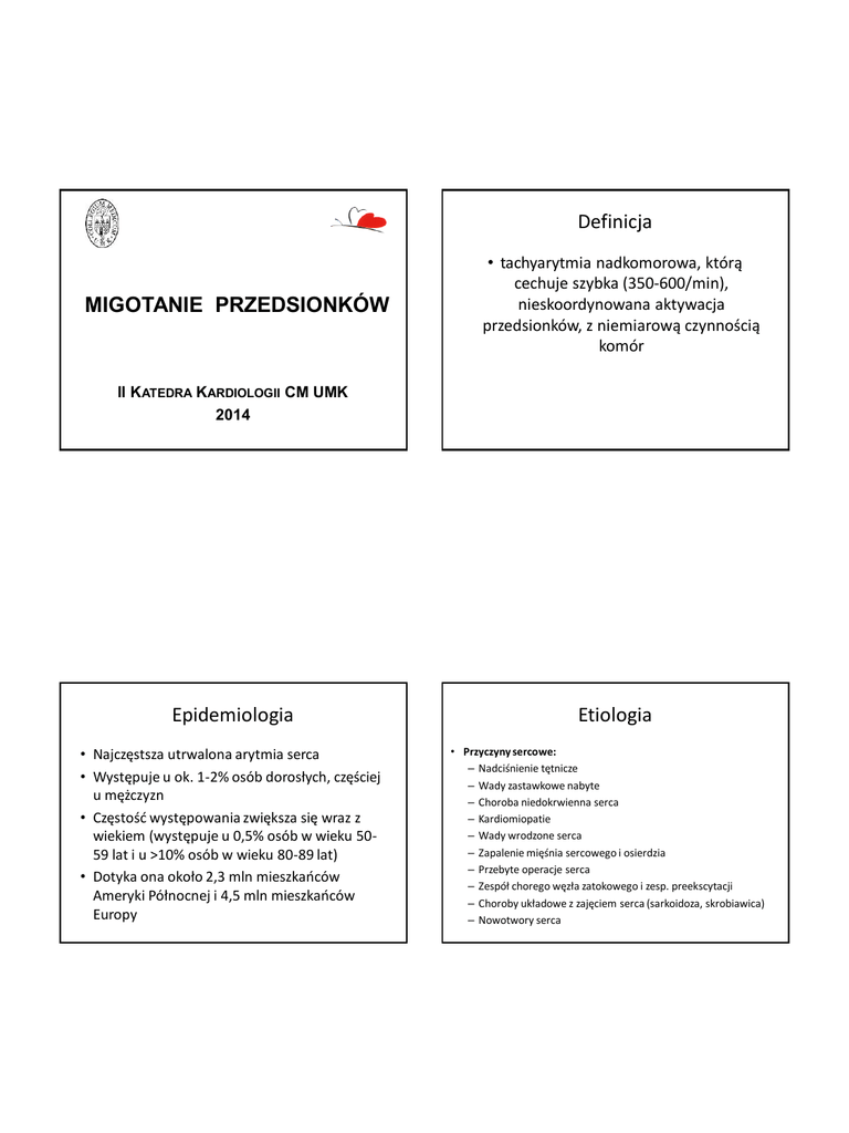 2015-04-23 Definicja MIGOTANIE PRZEDSIONKÓW • tachyarytmia nadkomorowa, którą cechuje szybka (350-600/min), nieskoordynowana aktywacja przedsionków, z niemiarową czynnością komór II KATEDRA KARDIOLOGII CM UMK II KATEDRA KARDIOLOGII CM UMK 2014 2014 Epidemiologia • Najczęstsza utrwalona arytmia serca • Występuje u ok. 1-2% osób dorosłych, częściej u mężczyzn • Częstość występowania zwiększa się wraz z wiekiem (występuje u 0,5% osób w wieku 5059 lat i u >10% osób w wieku 80-89 lat) • Dotyka ona około 2,3 mln mieszkańców Ameryki Północnej i 4,5 mln mieszkańców Europy Etiologia • Przyczyny sercowe: – Nadciśnienie tętnicze – Wady zastawkowe nabyte – Choroba niedokrwienna serca – Kardiomiopatie – Wady wrodzone serca – Zapalenie mięśnia sercowego i osierdzia – Przebyte operacje serca – Zespół chorego węzła zatokowego i zesp. preekscytacji – Choroby układowe z zajęciem serca (sarkoidoza, skrobiawica) – Nowotwory serca 1 2015-04-23 Etiologia – cd. • Przyczyny pozasercowe: – Nadczynność tarczycy (najczęściej) – Obturacyjny bezdech podczas snu – Ostre zakażenie – Znieczulenie ogólne – Choroby płuc – Guz chromochłonny – Różne substancje: alkohol, tlenek węgla, kofeina – Cukrzyca – Uwarunkowania genetyczne (szczególnie, gdy wczesny początek AF) Fale nawrotne w migotaniu przedsionków Patogeneza • U podłoża migotania przedsionków (AF) stoi mechanizm mikroreentry, czyli mnogich, małych fal nawrotnych - fal pobudzenia, krążących po przedsionkach, stale natrafiających na tkankę zdolną do pobudzenia. Daje to w efekcie ciągłą aktywność elektryczną przedsionków. Fale mikroreentry Zjawisko mikroreentry 2 2015-04-23 Patogeneza – cd. • Duża częstość skurczów przedsionków w migotaniu sprawia, że zostaje upośledzona ich funkcja tłocząca krew, co powoduje upośledzenie objętości minutowej serca nawet o 20-30%. • Na skutek braku skoordynowanego skurczu przedsionków w niektórych miejscach (szczególnie w lewym uszku) następuje zastój krwi. • Prowadzi to do zwiększonego prawdopodobieństwa powstania skrzeplin, które mogą ulec przeniesieniu do krwiobiegu i stać się źródłem zatorów, głównie w krążeniu mózgowym. • Udar niedokrwienny mózgu jest najczęstszym powikłaniem zakrzepowo-zatorowym migotania przedsionków. Patogeneza – cd. Rytm zatokowy – synchroniczna czynność przedsionków i komór Udar niedokrwienny mózgu jako powikłanie migotania przedsionków Migotanie przedsionków - chaotyczna, szybka czynność przedsionków i niemiarowa czynność komór 3 2015-04-23 Udar niedokrwienny mózgu • Skrzeplina w lewym uszku przedsionka u pacjenta z migotaniem przedsionków widoczna w echo przezprzełykowym. Obraz kliniczny Przebieg naturalny – różne typy AF • Objawy podmiotowe: – kołatanie serca – poty – osłabienie i upośledzona tolerancja wysiłku – omdlenia lub zawroty głowy – arytmia może przebiegać bezobjawowo • Objawy przedmiotowe: – niemiarowa czynność serca – ubytek tętna – objawy choroby podstawowej • Arytmia postępuje od postaci napadowej (samoograniczającej, zwykle < 48 h) do przetrwałej (nie ustępuje samoistnie lub wymaga kardiowersji), przetrwałej długotrwającej (ponad rok) oraz ostatecznie utrwalonej (akceptowanej). • Rozpoznane po raz pierwszy AF może być zarówno pierwszym z powtarzających się napadów, jak i od razu postacią utrwaloną 4 2015-04-23 Rozpoznanie • EKG – Niemiarowość zupełna – Brak załamka P, który zostaje zastąpiony nieregularną falą f – Częstotliwość fal migotania zawiera się w granicach 350-600/min • Badanie holterowskie – W przypadku napadowego AF, gdy rozpoznanie budzi wątpliwości – W przypadku obecności powikłań typowych dla AF (np. udar mózgu) i prawidłowych cyklicznych zapisów spoczynkowych EKG Rozpoznanie – cd. • Echokardiografia – pozwala wykryć przyczynę AF (np. choroba organiczna serca) lub powikłania (obecność skrzepliny) • TK lub MR – można wykorzystać przed planowanym zabiegiem ablacji przedsionka • Badania laboratoryjne – mogą ujawnić przyczynę AF, np. nadczynność tarczycy, zaburzenia elektrolitowe Zapisy ekg migotania przedsionków 5 2015-04-23 Badanie ECHO – skrzeplina w lewym przedsionku Badanie ECHO – skrzeplina w lewym przedsionku Leczenie • Cele leczenia: – Kontrola rytmu (przywrócenie i utrzymanie rytmu zatokowego) – Kontrola częstotliwości rytmu komór – Profilaktyka powikłań zakrzepowo-zatorowych 6 2015-04-23 Leczenia napadu Kardiowersja farmakologiczna FA o niedawnym początku • Jeśli objawy są umiarkowane – farmakologiczna kontrola częstotliwości rytmu komór, wyrównanie zaburzeń elektrolitowych • Jeśli arytmia się przedłuża (>24 godz.) – kardiowersja farmakologiczna lub elektryczna • Jeśli AF wywołuje istotne zaburzenia hemodynamiczne lub towarzyszy mu ból wieńcowy – w trybie pilnym kardiowersja elektryczna Napadowe FA – cd. Tabletka podręczna • Tabletka „podręczna” – jednorazowa dawka propafenonu 450-600 mg lub 200 – 300 mg flekainidu – Chorym z napadowym FA można w razie kolejnego nawrotu zalecić przyjęcie w warunkach ambulatoryjnych tabletki „podręcznej” – Wcześniej należy potwierdzić u chorego skuteczność i bezpieczeństwo takiej terapii 7 2015-04-23 Leki stosowane u chorych z AF w celu kontroli częstotliwości rytmu komór w stanach nagłych Leczenie u chorych z AF trwającym do 48 h • Chorzy bez preekscytacji – Metoprolol – Propranolol – Werapamil – Diltiazem • Chorzy bez preekscytacji z niewydolnością serca – Digoksyna – Amiodaron • Chorzy z preekscytacją – Amiodaron Kardiowersja elektryczna Kardiowersja elektryczna • Polega na dostarczeniu impulsu elektrycznego zsynchronizowanego z czynnością serca pacjenta • Chory powinien być na czczo, a zabieg przeprowadza się w zniecz