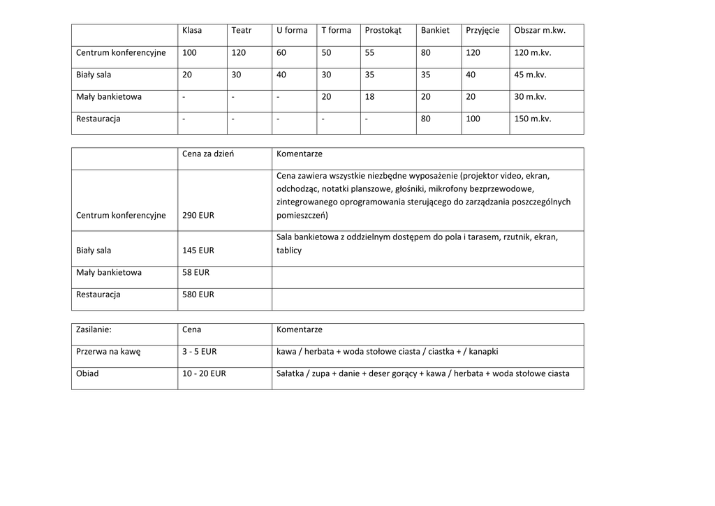 Klasa Teatr U forma T forma Prostokąt Bankiet Przyjęcie Obszar m.kw. Centrum konferencyjne 100 120 60 50 55 80 120 120 m.kv. Biały sala 20 30 40 30 35 35 40 45 m.kv. Mały bankietowa - - - 20 18 20 20 30 m.kv. Restauracja - - - - - 80 100 150 m.kv. Cena za dzień Komentarze 290 EUR Cena zawiera wszystkie niezbędne wyposażenie (projektor video, ekran, odchodząc, notatki planszowe, głośniki, mikrofony bezprzewodowe, zintegrowanego oprogramowania sterującego do zarządzania poszczególnych pomieszczeń) Biały sala 145 EUR Sala bankietowa z oddzielnym dostępem do pola i tarasem, rzutnik, ekran, tablicy Mały bankietowa 58 EUR Restauracja 580 EUR Zasilanie: Cena Komentarze Przerwa na kawę 3 - 5 EUR kawa / herbata + woda stołowe ciasta / ciastka + / kanapki Obiad 10 - 20 EUR Sałatka / zupa + danie + deser gorący + kawa / herbata + woda stołowe ciasta Centrum konferencyjne Uwaga: przerwy, lunch lub kolację połączoną z góry, według życzeń i pragnień klienta, więc ceny będą regulować, jak również indywidualnie na zamówienie, stosując wszystkie możliwe zniżki. Uczestników konferencji zniżki dla usług hotelowych. Nocleg i śniadanie od 25 EUR / osoba. Naszym klientom oferujemy 10% zniżki na usługi spa sanatorium „Tulpės. Ważne w dni powszednie, basenem i sauną i spa.