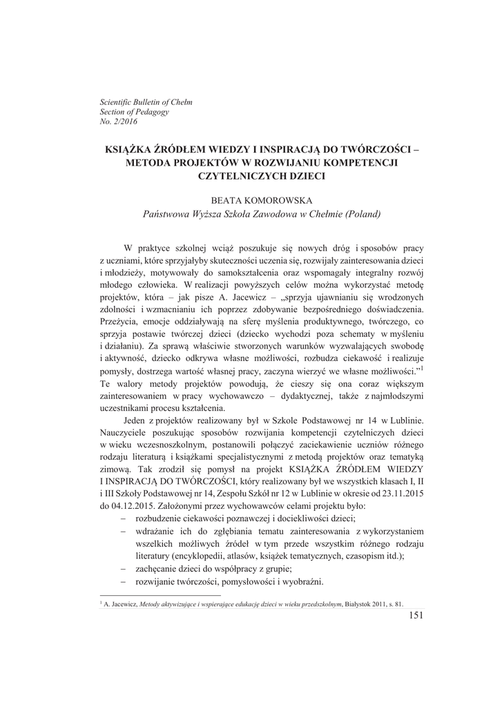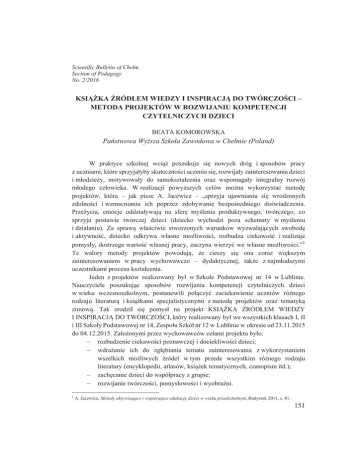 Scientific Bulletin of Chełm Section of Pedagogy No. 2/2016 KSIĄŻKA ŹRÓDŁEM WIEDZY I INSPIRACJĄ DO TWÓRCZOŚCI – METODA PROJEKTÓW W ROZWIJANIU KOMPETENCJI CZYTELNICZYCH DZIECI BEATA KOMOROWSKA Państwowa Wyższa Szkoła Zawodowa w Chełmie (Poland) W praktyce szkolnej wciąż poszukuje się nowych dróg i sposobów pracy z uczniami, które sprzyjałyby skuteczności uczenia się, rozwijały zainteresowania dzieci i młodzieży, motywowały do samokształcenia oraz wspomagały integralny rozwój młodego człowieka. W realizacji powyższych celów można wykorzystać metodę projektów, która – jak pisze A. Jacewicz – „sprzyja ujawnianiu się wrodzonych zdolności i wzmacnianiu ich poprzez zdobywanie bezpośredniego doświadczenia. Przeżycia, emocje oddziaływają na sferę myślenia produktywnego, twórczego, co sprzyja postawie twórczej dzieci (dziecko wychodzi poza schematy w myśleniu i działaniu). Za sprawą właściwie stworzonych warunków wyzwalających swobodę i aktywność, dziecko odkrywa własne możliwości, rozbudza ciekawość i realizuje pomysły, dostrzega wartość własnej pracy, zaczyna wierzyć we własne możliwości.”1 Te walory metody projektów powodują, że cieszy się ona coraz większym zainteresowaniem w pracy wychowawczo – dydaktycznej, także z najmłodszymi uczestnikami procesu kształcenia. Jeden z projektów realizowany był w Szkole Podstawowej nr 14 w Lublinie. Nauczyciele poszukując sposobów rozwijania kompetencji czytelniczych dzieci w wieku wczesnoszkolnym, postanowili połączyć zaciekawienie uczniów różnego rodzaju literaturą i książkami specjalistycznymi z metodą projektów oraz tematyką zimową. Tak zrodził się pomysł na projekt KSIĄŻKA ŹRÓDŁEM WIEDZY I INSPIRACJĄ DO TWÓRCZOŚCI, który realizowany był we wszystkich klasach I, II i III Szkoły Podstawowej nr 14, Zespołu Szkół nr 12 w Lublinie w okresie od 23.11.2015 do 04.12.2015. Założonymi przez wychowawców celami projektu było: - rozbudzenie ciekawości poznawczej i dociekliwości dzieci; - wdrażanie ich do zgłębiania tematu zainteresowania z wykorzystaniem wszelkich możliwych źródeł w tym przede wszystkim różnego rodzaju literatury (encyklopedii, atlasów, książek tematycznych, czasopism itd.); - zachęcanie dzieci do współpracy z grupie; - rozwijanie twórczości, pomysłowości i wyobraźni. 1 A. Jacewicz, Metody aktywizujące i wspierające edukację dzieci w wieku przedszkolnym, Białystok 2011, s. 81. 151 Szczegółowa tematyka projektu związana była z porą roku – zimą i charakterystycznymi dla niej częściami garderoby. Klasy I podjęły temat BUTY, klasy II – CZAPKA, klasy III – RĘKAWICZKA. Realizacja projektu przebiegała według trzech głównych etapów2: I – Wybór tematu, w tym ustalenie zasobu wiedzy dzieci na dany temat, formułowanie listy pytań, ustalenie sposobów realizacji projektu; II – Realizacja projektu, ze szczególnym zwróceniem uwagi na aktywność badawczą dzieci; III – Zakończenie projektu, w którym dokonuje się podsumowania zdobytej wiedzy i dzielenia się nią z innymi. W realizowanym projekcie, na jego pierwszym etapie, uczniowie przy pomocy nauczycieli przygotowywali „mapy myśli”, na których umieścili wszystkie interesujące ich pytania związane z tematem wiodącym. W klasach I postawiono następujące pytania: - kto nosi buty? - z czego mogą być zrobione buty? - kto nie nosi butów? - jakie buty noszą ludzie chorzy? - jakie są „butowe” zawody? - jakie są rodzaje butów i jakie zostawiają ślady? - w jakich butach chodzą ludzie w różnych krajach? - jakie zawody mają specjalne buty? - jakie buty są w bajkach? - jakie są przysłowia o butach? Uczniowie klas II poszukiwali odpowiedzi na następujące pytania: - Skąd pochodzi nazwa czapka? - Jakie są rodzaje czapek? - Z jakiego materiału można zrobić czapkę? - Jakie zawody mają specjalne czapki? - Jakie są przysłowia i powiedzenia o czapkach? - Czapka w literaturze i malarstwie. - W jakich czapkach chodzą ludzie w różnych krajach świata? Natomiast w klasach III uczniowie pracowali nad odpowiedzią na postawione przez siebie pytania, takie jak: - Jakie są rodzaje rękawiczek? - Co można zrobić z rękawiczek? - Czym kierują się ludzie przy wyborze rękawiczki? - Gdzie kupuje się rękawiczki? - Jak wyglądały pierwsze rękawiczki? - Z czego mogą być zrobione rękawiczki? - Co można robić bez rękawiczek? 2 Cf. L. Katz, J. Helm, Mali badacze. Metoda projektu w edukacji elementarnej, Warszawa 2003. 152 - Do czego służą rękawiczki? - Jakie są powiedzenia o rękawiczkach? - Rękawiczki w literaturze. Podczas drugiego etapu - realizacji projektu uczniowie wspólnie z nauczycielami podejmowali szereg działań. Wśród nich można wymienić, takie jak: - Doświadczenia: z jakich materiałów zrobione są: buty, czapki, rękawiczki, czy materiały te przemakają, rozciągają się, jakie ślady zostawiają buty itp.; - Wizyta w bibliotece w poszukiwaniu źródeł informacji na temat butów, czapki, rękawiczki; - Czytanie, zbieranie i porównywanie informacji z różnych materiałów źródłowych; - Spotkanie z młodszym inspektorem bhp, który udzielił dzieciom cennych wskazówek dotyczących zastosowania kasku w różnych zawodach; - Oglądanie filmów np. o pracy szewca; - Przygotowanie przedstawienia i inne. Podczas realizacji projektu uczniowie wykorzystali następujące pozycje wypożyczone z biblioteki i przyniesione z domu: Atlas wiedzy o świecie; Drążkowska A., Historia obuwia na ziemiach polskich od IX do końca XVIII wieku, Toruń 2011; Gogalin A., Grecja, Kielce 2014; Kindersley D., Stroje, Warszawa 1996; Kothe R., Człowiek pierwotny, Wrocław 2004; Macdonald F., Ciekawe dlaczego Rzymianie nosili togi, Wyd. Olesiejuk 2012; Polskie stroje ludowe. Czasopismo; Sport – obrazkowa encyklopedia dla dzieci, wyd. Firma księgarska Olesiejuk; Świat bez tajemnic. Człowie