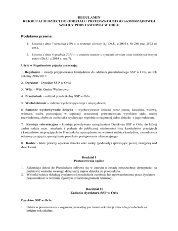 REGULAMIN REKRUTACJI DZIECI DO ODDZIAŁU PRZEDSZKOLNEGO SAMORZĄDOWEJ SZKOŁY PODSTAWOWEJ W ORLU Podstawa prawna: 1. Ustawa z dnia 7 września 1991 r. o systemie oświaty (t.j. Dz.U. z 2004 r. Nr 256 poz. 2572 ze zm.), 2. Ustawa z dnia 6 grudnia 2013 r. o zmianie ustawy o systemie oświaty oraz niektórych innych ustaw (Dz.U. z 2014 r. poz.7). UŜyte w Regulaminie pojęcia oznaczają: 1. Regulamin – zasady przyjmowania kandydatów do oddziału przedszkolnego SSP w Orlu, na rok szkolny 2016/2017; 2. Dyrektor – Dyrektor SS P w Orlu; 3. Wójt – Wójt Gminy Wejherowo; 4. Przedszkole – oddział przedszkolny SSP w Orlu , 5. Wielodzietność – rodzina wychowująca troje i więcej dzieci; 6. Samotne wychowywanie dziecka – wychowywanie dziecka przez pannę, kawalera, wdowę, wdowca, osobę pozostającą w separacji orzeczonej prawomocnym wyrokiem sądu, osobę rozwiedzioną, chyba Ŝe osoba taka wychowuje wspólnie co najmniej jedno dziecko z jego rodzicem; 7. Komisja rekrutacyjna – komisja powoływana zarządzeniem Dyrektora SSP w Orlu, do której zadań naleŜy m.in. ustalenie i podanie do publicznej wiadomości listy kandydatów przyjętych i kandydatów nieprzyjętych do Przedszkola, sporządzenie na wniosek rodzica kandydata, uzasadnienia odmowy przyjęcia, sporządzenie protokołu postępowania rekrutacyjnego. 8. Rodzic - takŜe prawny opiekun dziecka oraz osoby (podmioty) sprawujące pieczę zastępczą nad dzieckiem) Rozdział I Postanowienia ogólne 1. Rekrutacja dzieci do Przedszkola odbywa się w oparciu o zasadę powszechnej dostępności na podstawie wniosku zwanego dalej kartą zapisu dziecka do przedszkola. 2. Wnioski rodzice składają dyrektorowi przedszkola osobiście lub upowaŜnionemu przez dyrektora pracownikowi w terminie zgodnym z harmonogramem rekrutacji. Rozdział II Zadania dyrektora SSP w Orlu Dyrektor SSP w Orlu: 1. Ustala w porozumieniu z organem prowadzącym termin rekrutacji dzieci do przedszkola na kolejny rok szkolny. 2. Opracowuje w porozumieniu z organem prowadzącym kryteria przyjęcia dzieci słuŜące zaspokojeniu potrzeb społecznych środowiska lokalnego. 3. Ustala wartości punktowe kryteriom pierwszeństwa. 4. Powołuje komisję rekrutacyjną i przewodniczącego komisji. 5. Ustala kompletność wniosku i dokumentacji potwierdzającej spełnienie kryteriów pierwszeństwa. 6. Podaje do publicznej wiadomości: a) termin rekrutacji i zasady jej przeprowadzenia, b) regulamin rekrutacji, c) harmonogram działania komisji rekrutacyjnej, d) prawa i obowiązki rodziców kandydatów w procesie rekrutacyjnym ze szczególnym uwzględnieniem prawa do odwołania się od decyzji komisji. 7. Rozstrzyga odwołanie rodzica lub opiekuna prawnego od decyzji komisji rekrutacyjnej. 8. Powiadamia organ prowadzący o liczbie dzieci nieprzyjętych do przedszkola. 9. Zapewnia bezpieczeństwo danych osobowych i danych wraŜliwych kandydatów i ich rodziców zgromadzonych dla potrzeb postępowania rekrutacyjnego. 10. Archiwizuje dokumentację rekrutacyjną. 11. Przyjmuje dzieci do przedszkola na wolne miejsca w trakcie roku szkolnego. Rozdział III Zasady rekrutacji dzieci do przedszkola 1. JeŜeli liczba kandydatów do przedszkola nie przekracza liczby miejsc wolnych w przedszkolu o przyjęciu dzieci decyduje dyrektor. 2. JeŜeli liczba kandydatów do przedszkola przekracza liczbę miejsc wolnych w przedszkolu o przyjęciu dzieci decyduje komisja rekrutacyjna powołana przez dyrektora. 3. Liczba miejsc wolnych jest ustalana jako róŜnica liczby miejsc ogółem i liczby oświadczeń woli o kontynuacji edukacji w danym przedszkolu przez rodziców wychowanków uczęszczających do przedszkola. 4. Harmonogram prac komisji zgodny z zarządzeniem Wójta Gminy Wejherowo w tej sprawie ustala jej przewodniczący w porozumieniu z dyrektorem. 5. Komisja rekrutacyjna działa na podstawie Regulaminu rekrutacji i zarządzenia dyrektora określającego czas jej pracy w postępowaniu rekrutacyjnym. 6. Komisja rekrutacyjna przyjmuje kandydata do przedszkola, jeŜeli w wyniku postępowania rekrutacyjnego kandydat został zakwalifikowany oraz złoŜył wymagane dokumenty. Rozdział IV Komisja rekrutacyjna i jej zadania 1. Komisja rekrutacyjna działa w składzie: a) przewodniczący komisji – nauczyciel przedszkola, b) członek komisji – nauczyciel przedszkola, c) sekretarz komisji – pracownik administracji przedszkola. 2. Przewodniczący komisji rekrutacyjnej odpowiedzialny jest za: a) organizację i przebieg pracy komisji rekrutacyjnej, b) wystąpienie z wnioskiem do organu prowadzącego o potwierdzenie okoliczności podanych przez rodzica kandydata w oświadczeniach uprawniających do pierwszeństwa w przyjęciu dziecka do przedszkola, do rodzica z Ŝądaniem dokumentów potwierdzających okoliczności zawarte w oświadczeniu, c) dochowanie poufności danych o kandydatach i ich rodzinach w trakcie prac komisji i po ich zakończeniu, d) analizę przedłoŜonych wniosków wraz z dokumentacją potwierdzającą spełnienie kryteriów pierwszeństwa, e) podanie do publicznej wiadomości listy kandydatów zakwalifikowanych do przyjęcia i niezakwalifikowanych do przyjęcia, f) podanie do publicznej wiadomości listy kandydatów przyjętych i nieprzyjętych , g) sporządzenie uzasadnienia odmowy przyjęcia kandydata do przedszkola dokonanego na wniosek rodzica w terminie 7 dni od dnia wpłynięcia wniosku o uzasadnienie, h) organizację i przebieg rekrutacji uzupełniającej, i) zgodność rozstrzygnięć postępowania rekrutacyjnego z zapisem w protokole, j) podpisanie protokołu przez wszystkich członków komisji rekrutacyjnej k) przekazanie protokołu dyrektorowi przedszkola w raz z listami kandydatów zakwalifikowanych, niezakwalifikowanych, przyjętych i nieprzyjętych. 3. Zadaniem komisji rekrutacyjnej jest: a) procedowanie postępowania rekrutacyjnego zgodnie z niniejszym regulaminem i zasadą poufności informacji o kandydatach i ich rodzinach w trakcie prac komisji i po ich