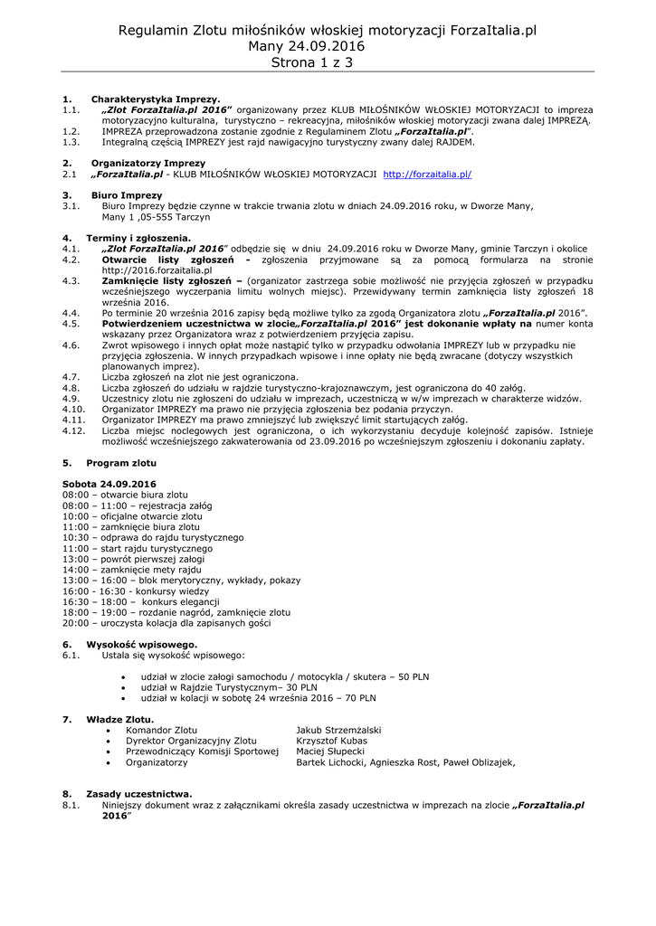 Regulamin Zlotu miłośników włoskiej motoryzacji ForzaItalia.pl Many 24.09.2016 Strona 1 z 3 1. 1.1. 1.2. 1.3. Charakterystyka Imprezy. „Zlot ForzaItalia.pl 2016” organizowany przez KLUB MIŁOŚNIKÓW WŁOSKIEJ MOTORYZACJI to impreza motoryzacyjno kulturalna, turystyczno – rekreacyjna, miłośników włoskiej motoryzacji zwana dalej IMPREZĄ. IMPREZA przeprowadzona zostanie zgodnie z Regulaminem Zlotu „ForzaItalia.pl”. Integralną częścią IMPREZY jest rajd nawigacyjno turystyczny zwany dalej RAJDEM. 2. 2.1 Organizatorzy Imprezy „ForzaItalia.pl - KLUB MIŁOŚNIKÓW WŁOSKIEJ MOTORYZACJI http://forzaitalia.pl/ 3. 3.1. Biuro Imprezy Biuro Imprezy będzie czynne w trakcie trwania zlotu w dniach 24.09.2016 roku, w Dworze Many, Many 1 ,05-555 Tarczyn 4. Terminy i zgłoszenia. 4.1. „Zlot ForzaItalia.pl 2016” odbędzie się w dniu 24.09.2016 roku w Dworze Many, gminie Tarczyn i okolice 4.2. Otwarcie listy zgłoszeń - zgłoszenia przyjmowane są za pomocą formularza na stronie http://2016.forzaitalia.pl 4.3. Zamknięcie listy zgłoszeń – (organizator zastrzega sobie możliwość nie przyjęcia zgłoszeń w przypadku wcześniejszego wyczerpania limitu wolnych miejsc). Przewidywany termin zamknięcia listy zgłoszeń 18 września 2016. 4.4. Po terminie 20 września 2016 zapisy będą możliwe tylko za zgodą Organizatora zlotu „ForzaItalia.pl 2016”. 4.5. Potwierdzeniem uczestnictwa w zlocie„ForzaItalia.pl 2016” jest dokonanie wpłaty na numer konta wskazany przez Organizatora wraz z potwierdzeniem przyjęcia zapisu. 4.6. Zwrot wpisowego i innych opłat może nastąpić tylko w przypadku odwołania IMPREZY lub w przypadku nie przyjęcia zgłoszenia. W innych przypadkach wpisowe i inne opłaty nie będą zwracane (dotyczy wszystkich planowanych imprez). 4.7. Liczba zgłoszeń na zlot nie jest ograniczona. 4.8. Liczba zgłoszeń do udziału w rajdzie turystyczno-krajoznawczym, jest ograniczona do 40 załóg. 4.9. Uczestnicy zlotu nie zgłoszeni do udziału w imprezach, uczestniczą w w/w imprezach w charakterze widzów. 4.10. Organizator IMPREZY ma prawo nie przyjęcia zgłoszenia bez podania przyczyn. 4.11. Organizator IMPREZY ma prawo zmniejszyć lub zwiększyć limit startujących załóg. 4.12. Liczba miejsc noclegowych jest ograniczona, o ich wykorzystaniu decyduje kolejność zapisów. Istnieje możliwość wcześniejszego zakwaterowania od 23.09.2016 po wcześniejszym zgłoszeniu i dokonaniu zapłaty. 5. Program zlotu Sobota 24.09.2016 08:00 – otwarcie biura zlotu 08:00 – 11:00 – rejestracja załóg 10:00 – oficjalne otwarcie zlotu 11:00 – zamknięcie biura zlotu 10:30 – odprawa do rajdu turystycznego 11:00 – start rajdu turystycznego 13:00 – powrót pierwszej załogi 14:00 – zamknięcie mety rajdu 13:00 – 16:00 – blok merytoryczny, wykłady, pokazy 16:00 - 16:30 - konkursy wiedzy 16:30 – 18:00 – konkurs elegancji 18:00 – 19:00 – rozdanie nagród, zamknięcie zlotu 20:00 – uroczysta kolacja dla zapisanych gości 6. Wysokość wpisowego. 6.1. Ustala się wysokość wpisowego: 7. Władze udział w zlocie załogi samochodu / motocykla / skutera – 50 PLN udział w Rajdzie Turystycznym– 30 PLN udział w kolacji w sobotę 24 września 2016 – 70 PLN Zlotu. Komandor Zlotu Dyrektor Organizacyjny Zlotu Przewodniczący Komisji Sportowej Organizatorzy Jakub Strzemżalski Krzysztof Kubas Maciej Słupecki Bartek Lichocki, Agnieszka Rost, Paweł Oblizajek, 8. Zasady uczestnictwa. 8.1. Niniejszy dokument wraz z załącznikami określa zasady uczestnictwa w imprezach na zlocie „ForzaItalia.pl 2016” Regulamin Zlotu miłośników włoskiej motoryzacji ForzaItalia.pl Many 24.09.2016 Strona 2 z 3 8.2. 8.3. 8.4. 9. 9.1. 9.2. 9.3. 9.4. 9.5. 9.6. Nadzór nad przebiegiem w/w prób sprawuje Komandor Zlotu i Komisja Sportowa, która zastrzega sobie prawo interpretacji niniejszych zasad. Jest jedyną władzą do rozpatrywania i rozstrzygania wszelkich rozbieżności i wątpliwości, które mogą powstać podczas stosowania niniejszych zasad. Komandor Zlotu i Komisja Sportowa decyduje o dopuszczeniu lub wykluczeniu zawodnika bądź pojazdu z udziału w IMPREZIE i może tego dokonać bez podawania przyczyny. Obowiązkiem każdego kierowcy jest udowodnienie, że jego pojazd odpowiada warunkom technicznym i bezpieczeństwa. Warunki techniczne, bezpieczeństwo oraz oznakowanie samochodów biorących udział w imprezach Zgłoszone do RAJDU pojazdy muszą być przedstawione do Badania Kontrolnego (BK) w dowolnym miejscu i czasie podanym przez organizatora w czasie trwania rajdu turystycznego .Pojazd nie spełniający wymogów regulaminu IMPREZY nie zostanie dopuszczony do startu – wykluczenie załogi; Pojazd przedstawiony do BK musi być oznakowany numerami startowymi oraz wymaganą reklamą sponsorską zgodnie z rysunkiem dostarczonym przez Organizatora przed BK lub opisem przekazanym na odprawie załóg. Pojazd musi być sprawny technicznie i posiadać wyposażenie zgodne z prawem o ruchu drogowym a kierowca obowiązany jest przedstawić wszystkie dokumenty uprawniające do prowadzenia pojazdu i dopuszczające do ruchu po drogach publicznych Pojazd musi być czysty zarówno na zewnątrz jak i wewnątrz; Pojazd, którego konstrukcja pozwala sądzić, że mogłaby zagrażać bezpieczeństwu, może nie zostać dopuszczony do udziału w IMPREZIE; Każdy startujący samochód musi być wyposażony w gaśnicę, trójkąt ostrzegawczy, apteczkę. 10. Załoga 10.1. Załogę stanowi kierowca i pilot (pozostali pasażerowie nie stanowią załogi). 10.2. Dopuszcza się możliwość startu bez pilota w RAJDZIE Turystycznym 10.3. Przez zgłoszenie do udziału w IMPREZIE załoga zobowiązuje się do całkowitego podporządkowania się przepisom niniejszego regulaminu oraz poleceniom i instrukcjom wydanym przez władze i Sędziów IMPREZY zarówno poprzez komunikaty jak i inne formy przekazu. Pod rygorem niedopuszczenia do startu lub wykluczenia z IMPREZY, każda 
