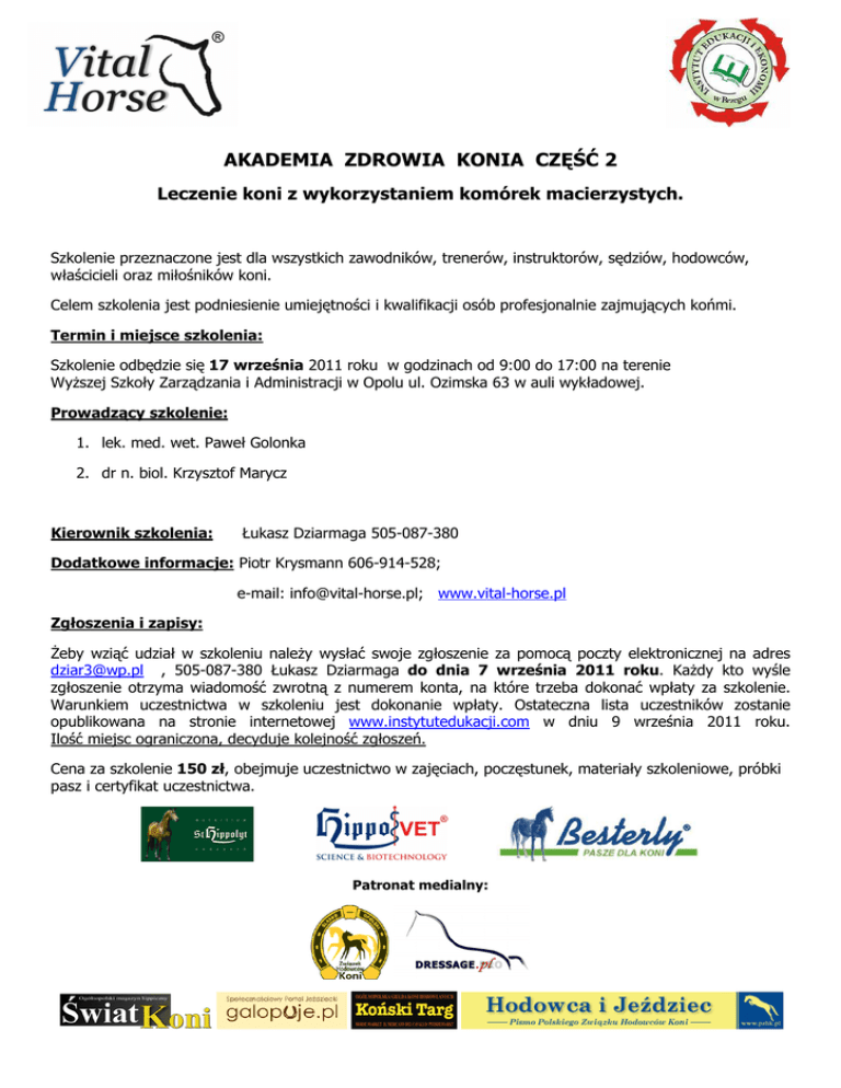 AKADEMIA ZDROWIA KONIA CZĘŚĆ 2 Leczenie koni z wykorzystaniem komórek macierzystych. Szkolenie przeznaczone jest dla wszystkich zawodników, trenerów, instruktorów, sędziów, hodowców, właścicieli oraz miłośników koni. Celem szkolenia jest podniesienie umiejętności i kwalifikacji osób profesjonalnie zajmujących końmi. Termin i miejsce szkolenia: Szkolenie odbędzie się 17 września 2011 roku w godzinach od 9:00 do 17:00 na terenie WyŜszej Szkoły Zarządzania i Administracji w Opolu ul. Ozimska 63 w auli wykładowej. Prowadzący szkolenie: 1. lek. med. wet. Paweł Golonka 2. dr n. biol. Krzysztof Marycz Kierownik szkolenia: Łukasz Dziarmaga 505-087-380 Dodatkowe informacje: Piotr Krysmann 606-914-528; e-mail: [email protected]; www.vital-horse.pl Zgłoszenia i zapisy: śeby wziąć udział w szkoleniu naleŜy wysłać swoje zgłoszenie za pomocą poczty elektronicznej na adres [email protected] , 505-087-380 Łukasz Dziarmaga do dnia 7 września 2011 roku. KaŜdy kto wyśle zgłoszenie otrzyma wiadomość zwrotną z numerem konta, na które trzeba dokonać wpłaty za szkolenie. Warunkiem uczestnictwa w szkoleniu jest dokonanie wpłaty. Ostateczna lista uczestników zostanie opublikowana na stronie internetowej www.instytutedukacji.com w dniu 9 września 2011 roku. Ilość miejsc ograniczona, decyduje kolejność zgłoszeń. Cena za szkolenie 150 zł, obejmuje uczestnictwo w zajęciach, poczęstunek, materiały szkoleniowe, próbki pasz i certyfikat uczestnictwa. Patronat medialny: Program szkolenia: 8:30 – 9:00 Rejestracja uczestników szkolenia 9:00 – 10:00 Sesja 1 Sposoby izolacji komórek macierzystych z tkanki tłuszczowej i ze szpiku kostnego – dr Krzysztof Marycz, Uniwersytet Przyrodniczy we Wrocławiu 10:00 – 10:15 Przerwa kawowa 10:15 – 11:15 Sesja 2 Behawior i morfologia komórek macierzystych izolowanych z tkanki tłuszczowej i ze szpiku kostnego – dr Krzysztof Marycz, Uniwersytet Przyrodniczy we Wrocławiu 11:15 – 11:30 Przerwa kawowa 11:30 – 12:30 Sesja 3 Zastosowanie terapeutycznych komórek macierzystych w wybranych schorzeniach u koni – dr Krzysztof Marycz, Uniwersytet Przyrodniczy we Wrocławiu 12:30 – 13:00 Dyskusja 13:00 – 14:00 Przerwa obiadowa 14:00 – 15:30 Sesja 4 Nowoczesne leczenie stawów i ścięgien u koni – lek. wet. Paweł Golonka, EQUIVET SZPITAL DLA KONI w Gliwicach Patronat medialny: 15:30 – 15:40 Przerwa kawowa 15:40 – 16:45 Nowoczesne leczenie stawów i ścięgien u koni – lek. wet. Paweł Golonka, EQUIVET SZPITAL DLA KONI w Gliwicach 16:45 – 17:00 Dyskusja 17:00 Podsumowanie szkolenia, wręczenie certyfikatów uczestnictwa i zakończenie. SERDECZNIE ZAPRASZAMY !!! Zespół Akademii Patronat medialny: