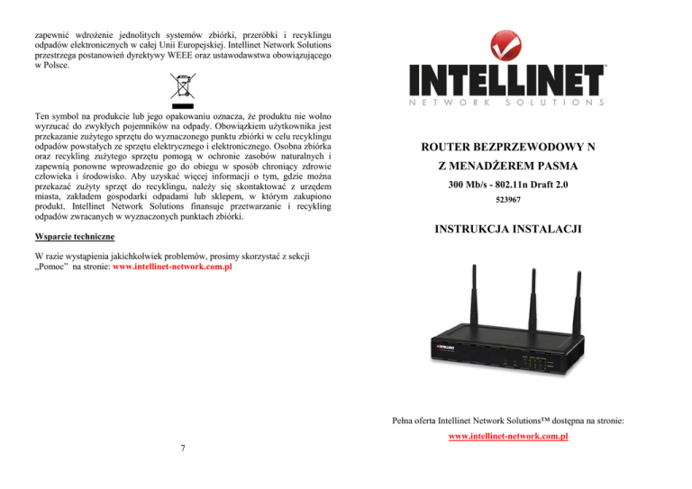 zapewnić wdroŜenie jednolitych systemów zbiórki, przeróbki i recyklingu odpadów elektronicznych w całej Unii Europejskiej. Intellinet Network Solutions przestrzega postanowień dyrektywy WEEE oraz ustawodawstwa obowiązującego w Polsce. Ten symbol na produkcie lub jego opakowaniu oznacza, Ŝe produktu nie wolno wyrzucać do zwykłych pojemników na odpady. Obowiązkiem uŜytkownika jest przekazanie zuŜytego sprzętu do wyznaczonego punktu zbiórki w celu recyklingu odpadów powstałych ze sprzętu elektrycznego i elektronicznego. Osobna zbiórka oraz recykling zuŜytego sprzętu pomogą w ochronie zasobów naturalnych i zapewnią ponowne wprowadzenie go do obiegu w sposób chroniący zdrowie człowieka i środowisko. Aby uzyskać więcej informacji o tym, gdzie moŜna przekazać zuŜyty sprzęt do recyklingu, naleŜy się skontaktować z urzędem miasta, zakładem gospodarki odpadami lub sklepem, w którym zakupiono produkt. Intellinet Network Solutions finansuje przetwarzanie i recykling odpadów zwracanych w wyznaczonych punktach zbiórki. ROUTER BEZPRZEWODOWY N Z MENADśEREM PASMA 300 Mb/s - 802.11n Draft 2.0 523967 INSTRUKCJA INSTALACJI Wsparcie techniczne W razie wystąpienia jakichkolwiek problemów, prosimy skorzystać z sekcji „Pomoc” na stronie: www.intellinet-network.com.pl Pełna oferta Intellinet Network Solutions™ dostępna na stronie: www.intellinet-network.com.pl 7 Dziękujemy za zakup produktów Intellinet Network Solutions™ Intellinet Network Solutions™ to stale aktualizowana, pełna linia aktywnych komponentów sieciowych, o najwyŜszym poziomie technologicznym, uznana w wielu krajach ze względu na swą niezawodność, objęta wieczystą gwarancją producenta. Starając się spełniać zróŜnicowane potrzeby naszych klientów, umieściliśmy w ofercie produkty, począwszy od prostych kart i przełączników 10/100 Mb/s, aŜ do zarządzalnych przełączników gigabitowych oraz sieciowych rozwiązań bezprzewodowych 108 Mb/s. Intellinet Network Solutions™ - OŜywiamy sieci! • • Działanie reguł podlega priorytetyzacji – najwaŜniejsza i w pierwszej kolejności egzekwowana reguła oznaczona jest priorytetem „1” (oznaczenia priorytetów znajdują się w kolumnie „Priority”). Priorytety moŜemy dowolnie zmieniać - zaznaczamy daną regułę w kolumnie „Select” i uŜywamy poleceń „Move Up”, „Move Down”. PoniŜej znajduje się zestawienie portów, na jakich działają najpopularniejsze usługi: Application Protocol Port Number Telnet TCP 23 Zapraszamy więc do dalszych zakupów !!! Wprowadzenie Bezprzewodowy Internet Router Intellinet Network Solutions™ jest wysoko wydajnym urządzeniem, oferującym transmisję bezprzewodową w standardzie 802.11g N Draft 2.0, przeznaczonym do pracy w małych i średnich grupach roboczych. Pracuje na dystansie do 100 m wewnątrz budynków oraz do 600 m na zewnątrz, w oparciu o 3 anteny w systemie 2T3R MIMO (2 nadajniki, 3 odbiorniki) o zysku 3 dBi kaŜda. Ogólna charakterystyka współpraca z urządzeniami w standardach 802.11b, g, n moŜliwość udostępniania połączenia internetowego dla klientów sieci przewodowej i bezprzewodowej technologia 2T3R MIMO zapewniająca lepszy zasięg i obszar pokrycia gwarancja „Lifetime Warranty” FTP TCP 21 SMTP TCP 25 POP3 TCP 110 H.323 TCP 1720 SNMP UCP 161 SNMP Trap UDP 162 HTTP TCP 80 PPTP TCP 1723 PC Anywhere TCP 5631 PC Anywhere UDP 5632 Warunki eksploatacji Urządzenie powinno być uŜytkowane w warunkach, w których temperatura i wilgotność nie przekraczają dopuszczalnych wartości. Podłączanie urządzenia Specyfikacja techniczna obsługiwane standardy: IEEE 802.11g/b, 802.1x, tryby pracy: Access Point klonowanie Mac adresu dla trybu Dynamic IP na porcie WAN obsługa QoS – kontrola przepustowości dla adresów/grup adresów IP szyfrowanie: WEP,WPA, WPA2 i Radius szybkość transmisji bezprzewodowej: do 300 Mb/s 1 Połączenie musi być wykonane w oparciu o urządzenia radiowe, zgodne ze standardem IEEE 802.11b, g, n pracujące w częstotliwości 2,4GHz, z zachowaniem zasad fizyki i właściwości fali radiowej o długości 12 cm. Recycling Zagadnienia ochrony środowiska są dla naszej firmy bardzo waŜne. Unia Europejska (UE) opracowała dyrektywę WEEE (on Waste Electrical and Electronic Equipment – o zuŜytym sprzęcie elektronicznym), aby 6 Remote IP Address – definiujemy zakres adresów IP lub pojedynczy adres z sieci lokalnej bądź z sieci WAN, z którym będą się łączyć komputery z sieci lokalnej i dla którego połączenia chcemy ustanowić regułę. MoŜemy zdefiniować adres serwera lub konkretnej strony www, aby zagwarantować uŜytkownikom LAN-u odpowiednią przepustowość przy kaŜdorazowym połączeniu z tym serwerem lub stroną. Jeśli zdefiniujemy jedynie „Remote IP Address”, a pole „Local IP Address” pozostawimy puste, reguła ta będzie wtedy dotyczyć wszystkich uŜytkowników sieci lokalnej przy połączeniu ze zdefiniowanym adresem „Remote”. sygnalizacja: diodowa: Power, WLAN Link/Act, WAN Link/Act, LAN 1-4 Link/Act, LAN 1-4 10/100 Mb/s moc wyjściowa transmisji: 16 dBm (50 mW) temperatura pracy: 0 - 50°C wilgotność: 10 – 95% (bez kondensacji) emisja: certyfikaty FCC Class B & CE Mark, RoHS Zawartość opakowania Router bezprzewodowy 802.11 n Zasilacz zewnętrzny Instrukcja instalacji Instrukcja uŜytkowania na CD Podstawka i kabel Ethernet RJ-45 1m Remote Port Range – podobnie jak w „Local Port Range” tyle, Ŝe definiujemy porty dla adresów „Remote”, bądź po prostu pod konkretną usługę przy połączeniach z siecią WAN. Ograniczamy transfer dla połączeń P2P, które z reguły posługują się określonymi portami, jak port 4661 (TCP) i 4671 (UDP) dla popularnego programu „e-Mule”. 1 szt. 1 szt. 1 szt. 1 szt. 1 szt. Instalacja Routera Wireless Traffic Type – moŜemy wybrać z predefiniowanej listy określoną usługę, której dotyczyć ma reguła, na tej samej z