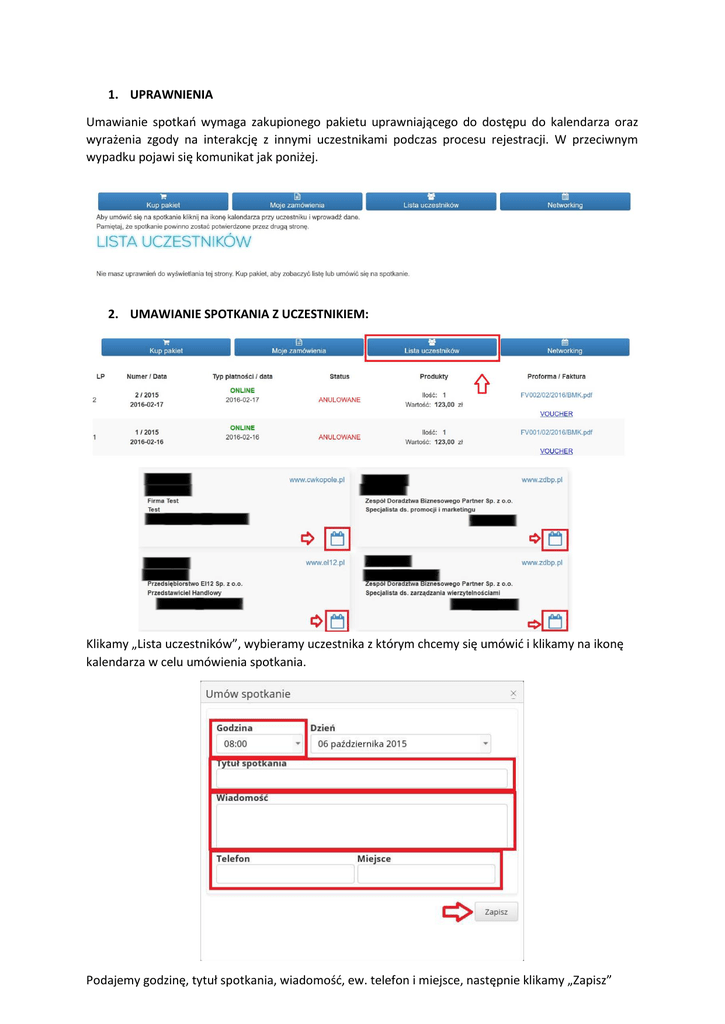 1. UPRAWNIENIA Umawianie spotkań wymaga zakupionego pakietu uprawniającego do dostępu do kalendarza oraz wyrażenia zgody na interakcję z innymi uczestnikami podczas procesu rejestracji. W przeciwnym wypadku pojawi się komunikat jak poniżej. 2. UMAWIANIE SPOTKANIA Z UCZESTNIKIEM: Klikamy „Lista uczestników”, wybieramy uczestnika z którym chcemy się umówić i klikamy na ikonę kalendarza w celu umówienia spotkania. Podajemy godzinę, tytuł spotkania, wiadomość, ew. telefon i miejsce, następnie klikamy „Zapisz” 3. KALENDARZ SPOTKAŃ Wszystkie spotkania możemy podglądnąć z widoku kalendarza spotkań klikając na „Giełda Kooperacyjna” Kolorami oznaczone są statusy umówionych spotkań zgodnie z legendą u góry kalendarza
