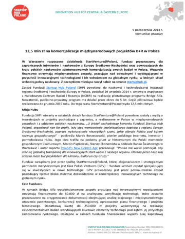 9 października 2014 r. Komunikat prasowy 12,5 mln zł na komercjalizacje międzynarodowych projektów B+R w Polsce W Warszawie rozpoczyna działalność StartVenture@Poland, fundusz przeznaczony dla zagranicznych inżynierów i naukowców z Europy Środkowo-Wschodniej oraz powracających do kraju polskich naukowców zainteresowanych komercjalizacją swoich badań w Polsce. Wsparcie finansowe otrzymają międzynarodowe zespoły, pracujące nad odważnymi i wybiegającymi w przyszłość innowacyjnymi technologiami i ich wdrożeniem na globalnym rynku, w których skład wchodzą polscy naukowcy. Z początkiem miesiąca ruszył nabór na stronie startuphub.pl. Zarząd Fundacji Startup Hub Poland (SHP) powołanej do naukowej i technologicznej integracji regionu środkowej i wschodniej Europy w Polsce, podpisał 29 września 2014 r. umowę o współpracy z Narodowym Centrum Badań i Rozwoju (NCBiR) na realizację pilotażowego programu Bridge Alfa. Nowatorski, publiczno-prywatny program ma działać przez okres do 5 lat. Część pilotażowa będzie realizowana do grudnia 2015 roku. Do tego czasu StartVenture@Poland wyda 12,5 mln złotych. Misja Hubu Fundacja SHP i otwarty w ostatnich dniach fundusz StartVenture@Poland powołane zostały z myślą o inwestycjach w projekty pochodzące z zagranicy, a realizowane w Polsce w międzynarodowych zespołach i z udziałem polskich naukowców. „U źródeł wschodniego kierunku Fundacji Startup Hub Poland, organizacji non-for-profit, leży idea wzmocnienia intelektualnego kapitału z regionu Europy Środkowo-Wschodniej, poprzez wykorzystanie niezwykłych szans, jakie oferuje Polska pod kątem rozwoju gospodarczego” - podkreśla Marek Borzestowski, pionier polskiego Internetu, inwestor i pomysłodawca Hubu. Jego idea trafiła na podatny grunt w historycznym dla Polski momencie gospodarczym i kulturowym. Marcin Piątkowski, Starszy Ekonomista w oddziale Banku Światowego w Warszawie i autor raportu Poland’s New Golden Age przekonuje: “Polska ma wielki potencjał, aby stać się globalną trampoliną dla innowacyjnych start-upów z naszego regionu. Obrana przez nasz kraj ścieżka może być przykładem dla Ukrainy, Białorusi czy Gruzji.” Fundusz zarządzany jest przez spółkę StartVenture@Poland, której akcjonariuszem i strategicznym partnerem merytorycznym jest Giza Polish Ventures (GPV) – fundusz venture capital specjalizujący się w inwestycjach w nowe technologie. GPV prowadzony jest przez polsko-izraelski zespół posiadający łącznie blisko stuletnie doświadczenie w komercjalizacji innowacyjnych technologii na globalnym rynku. Cele Funduszu W ramach Bridge Alfa wyselekcjonowane zespoły pracujące nad innowacyjnymi rozwiązaniami otrzymają finansowanie do 50.000 zł na analityczną weryfikację technologii, które zostanie przeznaczone na przygotowanie dokumentacji obejmującej analizę krajowego i międzynarodowego otoczenia patentowego, konkurencji technologicznej, opracowanie planu finansowego i projektu biznesowego. Dodatkową kwotę do 250.000 zł projekty wykorzystają na realizację eksperymentalnych badań weryfikujących kluczowe elementy technologii pod kątem jej przyszłego zastosowania rynkowego. Dostępne w ramach funduszu finansowanie wypełni lukę kapitałową pomiędzy badaniami podstawowymi i badaniami stosowanymi, na którą, z powodu wysokiego ryzyka i znacznych kosztów najtrudniej jest zdobyć finansowanie. „Naszym celem jest merytoryczne i finansowe wsparcie kilkunastu najlepszych projektów, znajdujących się we wczesnej fazie rozwoju oraz powołanie ok. 10 spółek technologicznych, które otrzymają dalsze finansowanie z GPV i bezzwrotne wsparcie z NCBiR.” – mówi Maciej Sadowski, zarządzający Funduszem. „Łączne wsparcie, jakie w ramach Bridge Alfa uzyskać może projekt, to 1,5 mln zł” – dodaje Sadowski. Warszawa – Polska – Europa! SHP swoją działalność prowadzi we współpracy z partnerami z całej Polski: uczelniami, parkami naukowymi, firmami R+D poszukującymi rozwiązań technologicznych wśród małych firm. Siedzibą SHP jest stołeczny Mokotów, który bliskością wiodących ośrodków naukowych i finansowego city jest idealnym miejscem dla wynalazców i pionierów innowacyjnego biznesu. Wybór Warszawy na siedzibę Hubu uzasadnia Michał Olszewski, Zastępca Prezydent Warszawy: “Stajemy się nowoczesnym smart-city, gościnnym dla każdego. To Warszawę wybrała firma Google na siedzibę pierwszego Google Campus w tej części świata. Nasze miasto jest gotowe do objęcia roli nie tylko start-upowej stolicy Polski, ale i bycia ważnym punktem na mapie wynalazców z Ukrainy i innych sąsiednich krajów.” Wsparcie, jakie NCBiR udziela w ramach programu Bridge Alfa dla międzynarodowych zespołów badawczych, a w szczególności naukowców i inżynierów z regionu Środkowej i Wschodniej Europy, jest doskonałym narzędziem zachęcającym do transgranicznej współpracy naukowo-technologicznej w regionie. „Chcemy, żeby polska gospodarka była bardziej innowacyjna, dlatego wspólnie z doświadczonymi przedstawicielami biznesu będziemy wspierać najbardziej innowacyjne, a zatem obarczone największym ryzykiem projekty. Podejmujemy konieczne ryzyko, ale zaangażowanie posiadających odpowiednie know-how funduszy jest gwarancją efektywnego wykorzystania środków na ten cel” – podkreśla Leszek Grabarczyk, zastępca dyrektora NCBiR. Więcej o Hubie i ofercie funduszu StartVenture@Poland na stronie www.startuphub.pl. Zapraszamy! _________________________________________________________________________________ Startup Hub Poland StartUp Hub Poland (SHP) jest fundacją non-for-profit powołaną w 2012 roku w celu tworzenia międzynarodowego środowiska specjalistów, wynalazców i pionierów innowacyjnego biznesu w Polsce. Fundacja tworzy warunki dla największych talentów inżynieryjnych i biznesowych z regionu Europy Środowo-Wschodniej do zbudowania silnego 